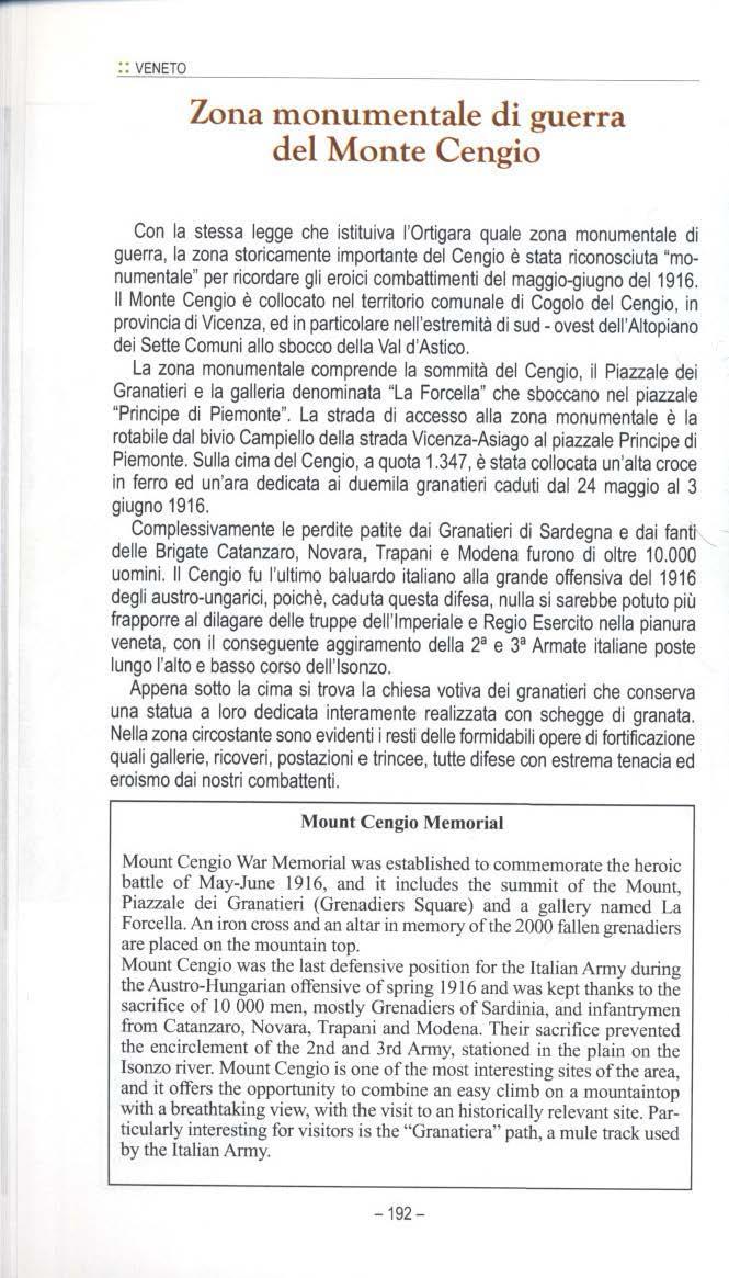 La zona monumentale comprende la sommità del Cengio, il Piazzale dei Granatieri e la galleria denominata "La Forcella" che sboccano nel piazzale "Pri ncipe di Piemonte·. La strada di accesso alla zona monumentale è la rotab ile dal bivio Campiello della strada Vicenza-Asiago al piazzale Pri ncipe di Pie monte. Sulla cima del Ceng io, .a quota 1.347, è stata collocata un'alta croce in ferro ed un 'ara dedicata ai duemila granatieri caduti dal 24 maggio al 3 giugno 1916 .