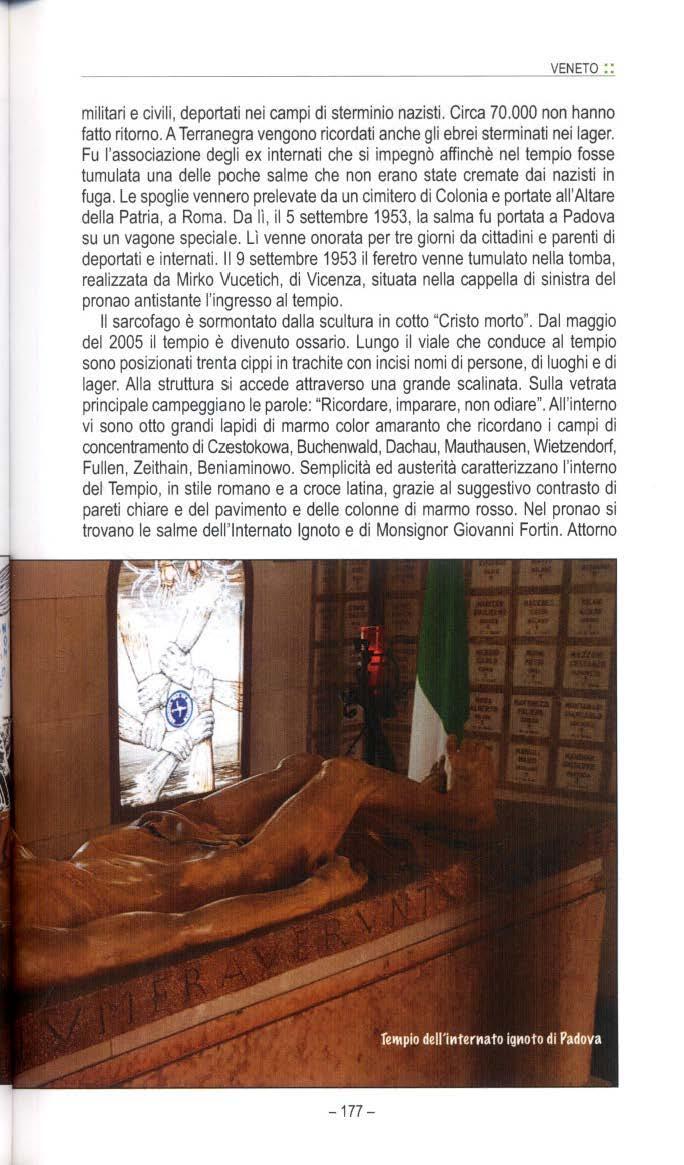 On June 21, 1934 the bodies of 5 401 soldicrs were translated inside the Tempie, which bad becn - in the meantime- embellished with marb le sculptures and ao organ. During World War li Padua was rcpedly bombed and the Tempie was heavily damaged in 1943. Rcstoration starced aftcr the War and ended in I949. ln 1960 a part of tbe Tempie was dedicated to host over I000 civilians wbo died in World War a.