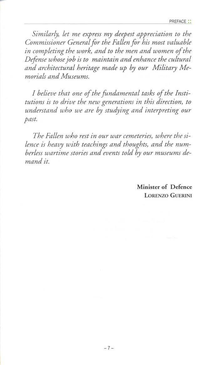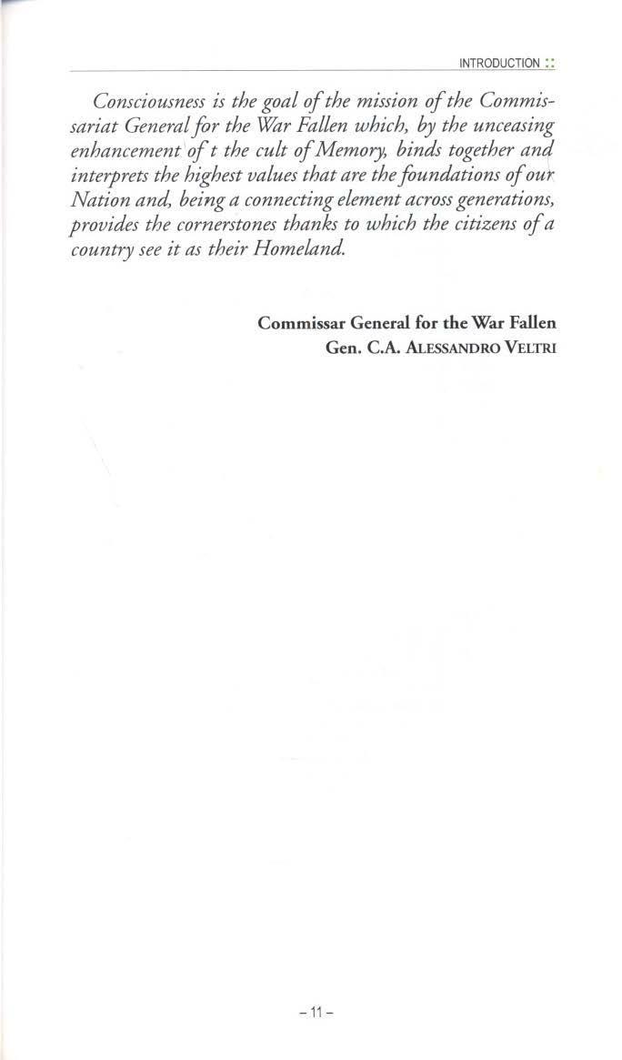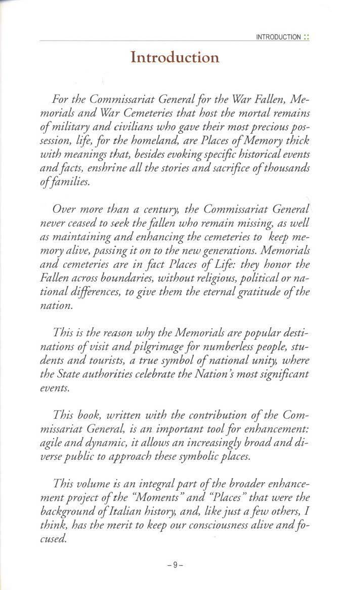 Por the Commissariat Generai far the U:'iar FaLlen, MemoriaLs and U:'iar Cemeteries that host the mortai remains of miLitary and civiLians who gave their most precious possession, Lift, far the homeLand, are PLaces ofMemory thick with meanings that, besides evoking speci.fic historical events and focts, enshrine aLL the stories and sacrifice ofthousands offomiLies.