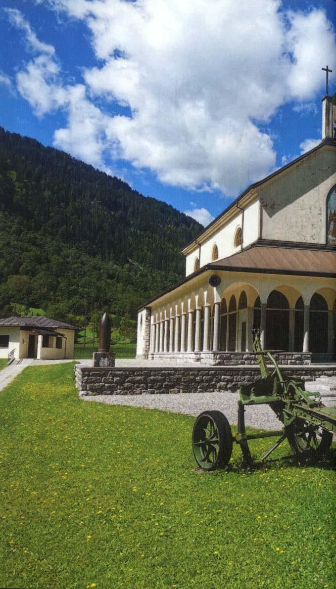 A s mall church was. built in 1936 in Mussoi , just outside Be ll uno, to hooor che city' s deaths during World War I. The chureh is composed by a large entrance bronzed gate , engraved with the names of 4 11 soldiers whose bodies are buricd in the two chapels on the sides of the church, io smal l graves covered with marble plates. ln the left Chapel a broozedhigh-rc li ef bonors the memory of Air Force Sargent Arturo dell ' Oro, Military Valor Gold Meda!, while a memoria! stone remembers the dceds of patriot Jacopo Tasso, executed by Austriaos, io tbe right chapcl. The churcb's bells, made with the bronze of cannons retr ieved on the battlefields, co li every night, in remembrance ofthe fal lcn.