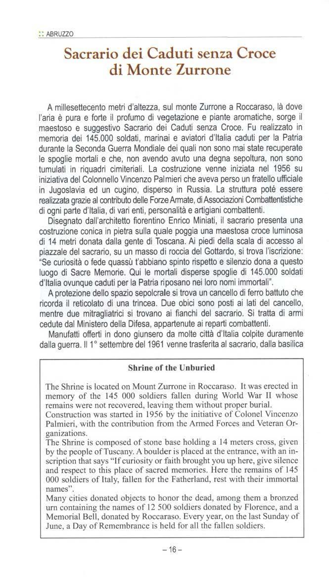 The Shrioe is located on Mounl Zurrone in Roccaraso. lt was erected in memory of the 145 000 soldiers fallen during World War Il whose remains were noi recovered, leaving them without proper burial. Construction was startcd in 1956 by the initiative of Colone! Vincenzo Palmieri, with thc contribution from the Armed Forces and Yeteran Organizations.