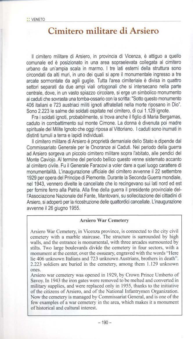 Arsiero war cemetery was opened in 1929, by Crown Prince Umbeno of Savoy. Ln 1943 che iron gates were removed to be melted and converted in military supplies, and were replaced on ly in 1955, thanks to tbe initiativc ofthe citizens of Arsiero, and ofthe National lnfantrymen Organization. Now the cemetery is managed by Commissariat Genera i, and is one of the few examples of a war cemetery in thc area, which makcs it a monumen t ofhistorical and cultura! intcrest. -190-