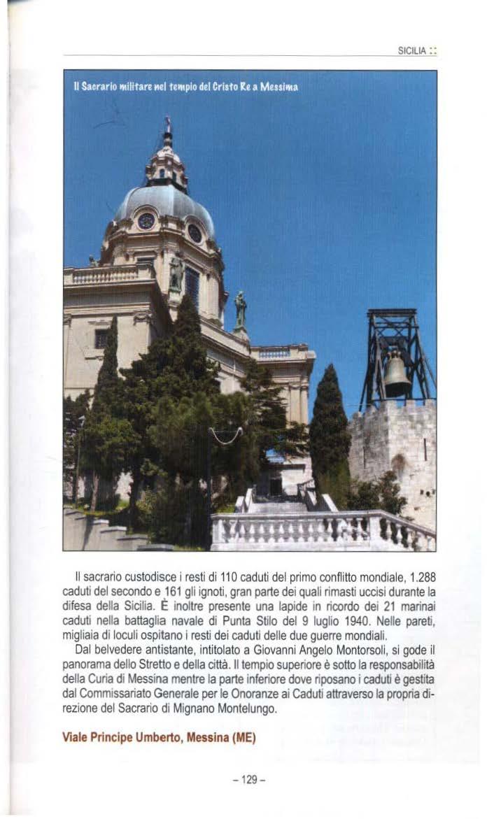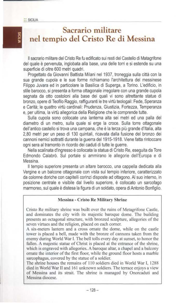 Built at the initiative of the City, the shrinc is composed by a squareplant complcx , with two co lumbaria on tbc sides and a larger columbarium at tbc center. lnside the largcr columbarium are a meta l cross and a tombstone. Tbe shrine hosts th e remains of 736 soldiers, 174 of whicb, unknown. Among thcm LieutenantAntonio Panclla, oft he 94th lnfantry "Messina", fallen in combat during World War I and awarded a Military Valor Gold Medal io 1919 with tllis motivatioo "He was 011 thefrontline in every battle, the closesr to the enemy. Thanks to his bravery. his unit conquered and kept an enemy tren c h, d espite being isolated and lefl without water. During the counterattack h e was hit, andfell stili c1)'ing "Forward! ", /ea v ing his men so inspired, they kept the trench/or severa/ ho11rs without reinforcement " -20-