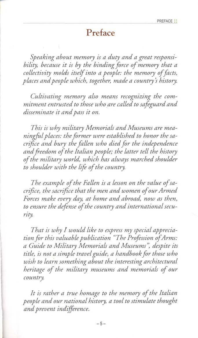 Desidero per questi motivi esprimere il mio particolare apprezzamento per la pregevole ini z iativa editoriale "Il Mestiere delle Armi. Guida ai Sacrari e ai Musei militari"