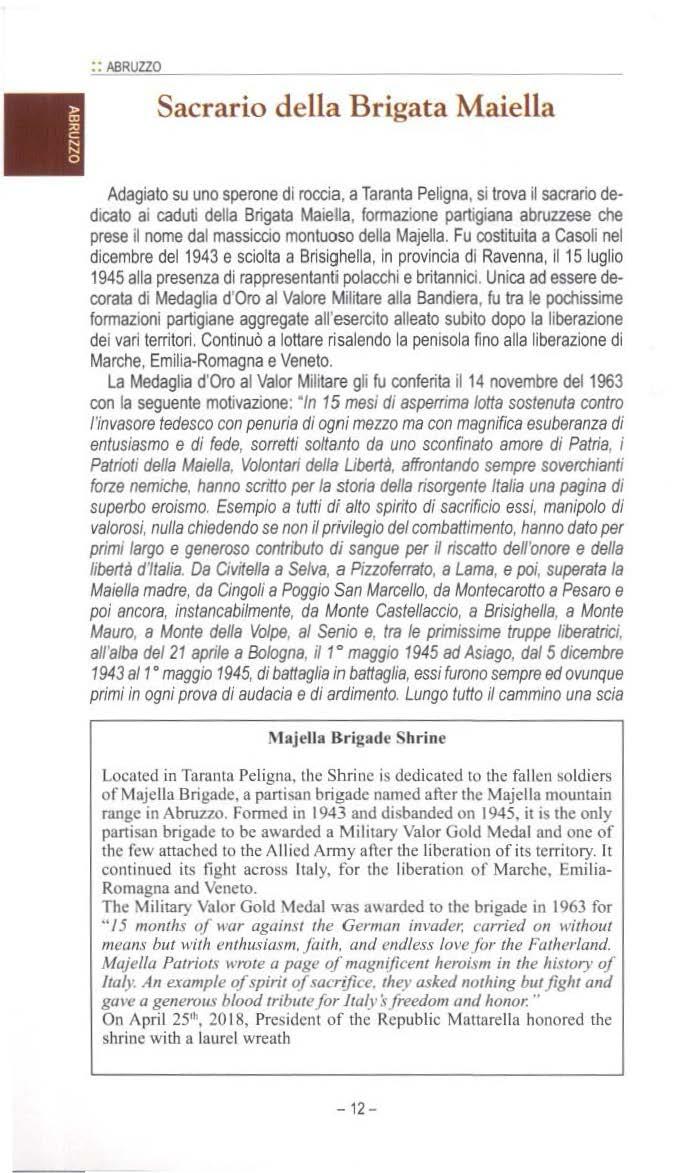Adagia to su uno sperone di roccia, a Taranta Peligna, si trova il sacrario dedicato ai cadub della Brigata Maiella, fonnaz1one partigiana abruzzese che prese il nome dal massiccio montuoso della Majella. Fu costituita a Casoli nel dicembre del 1943 e sciolta a Bri sighella, In provincia di Raven na, 1115 luglio 1945 alla presenza di rappresentanti polacchi e britannici. Unica ad essere decorata di Medaglia d'Oro al Valore Militare alla Bandiera, fu tra le pochissime fonnazioni partigiane aggregate all 'esercito alleato subito dopo la liberazione dei vari territori. Co ntinuò a lottare risalendo la peniso la fino alla liberazione di Marche, Emilia-Romagna e Veneto.