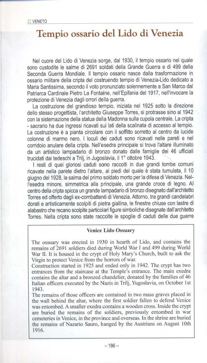Tue ossuary was erected in 1930 in hearth of Lido , and contains the remains of2691 soldiers died during World War I and 499 duriog World War Il. It is housed in the crypt of Holy Mary's Church, built to ask the Virgin to protect Venicc from the horrors ofwar.