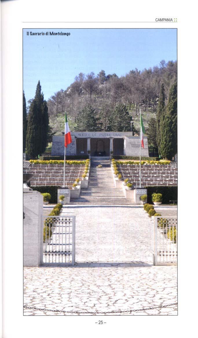 The military shrine is locateci on the via Casilina, on thc s lope s of the Montelungo, where on 8 and 16 December 1943 for tbe first time tbe l talian Army fougbt aga inst the Gennans. lt houses the remains of974 soldiers, fallen during the Liberation War. fn s idc the maìn s tructurc in white marble , is a chapel w ith an altar, guarded by a s tatue of a dying soldier, and tbe tombs oftbe fallen. Th e portai is engraved witb the Latin phrase Morti ut Patria viva i (died so the Fatherland mìgbt li ve).
