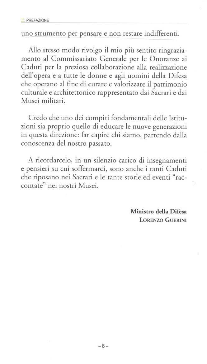 Allo stesso modo rivolgo il mio più sentito ringraziamento al Commissariato Generale per le Onoranze ai Caduti per la preziosa collaborazione alla realizzazione dell'opera e a tutte le donne e agli uomini della Difesa che operano al fine di curare e valorizzare il patrimonio culturale e architettonico rappresentato dai Sacrari e dai Musei militari.