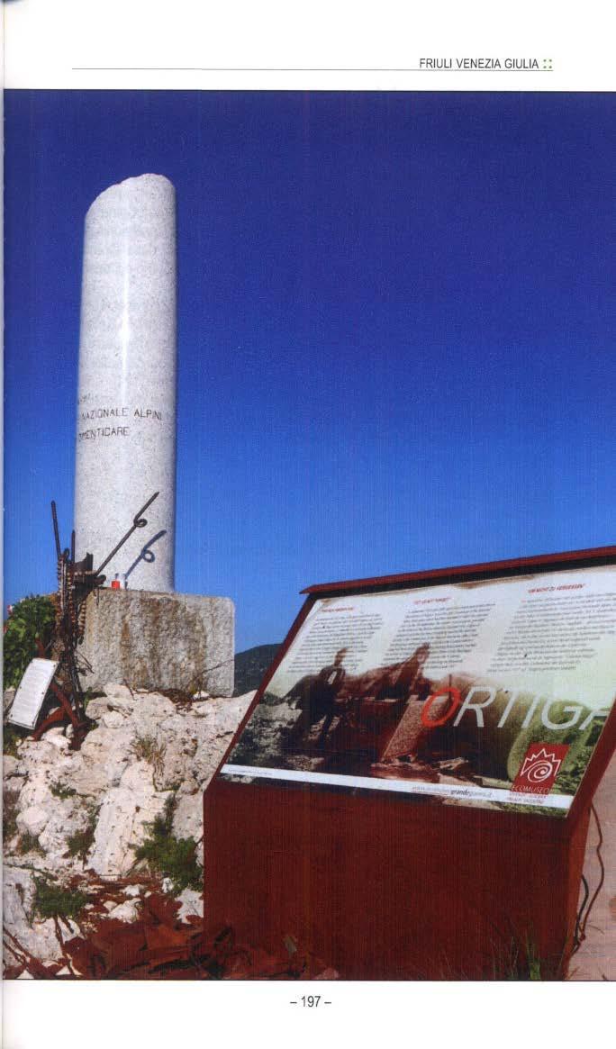 The origina i trenches and fortifications are stil! visible, while a column was placcd on tbe mountaintop in 1920 by the Na tiona l Alpine Organizatioo "To remember" and to honor the sacrifice of iheir comradcs A memoria I stooe was e rected nearby by Austro - Huogarian soldiers. A small chapcl with an ossuary was built to house thc rcmains that stil! are recovered occasiona lly.