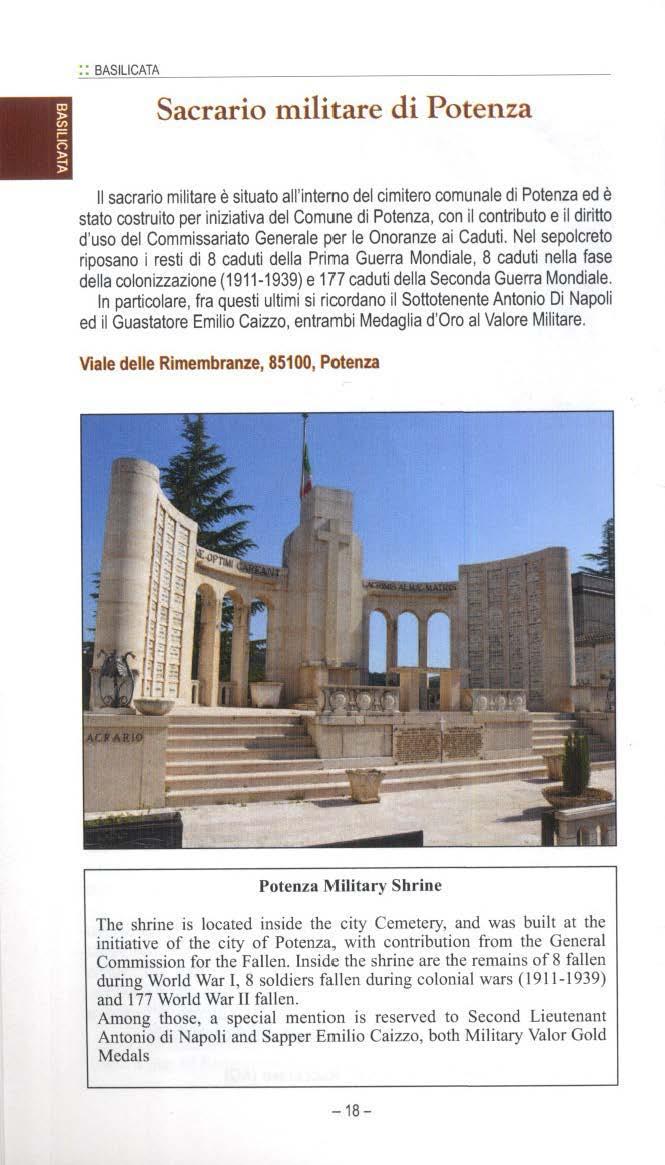 Il sacrario militare è situato all'interno del cimitero comuna le di Potenza ed è stato costruito per iniziativa del Comune di Potenza , con il contributo e il diritto d'uso del Commissariato Generale per le Onoranze ai Caduti. Nel sepolcreto riposano i resti di 8 caduti della Prima Guerra Mondiale, 8 caduti nella fase della co lon izzazione (1911-1939) e 177 caduti della Seconda Guerra Mondiale. In particolare , fra questi ultimi si ricordano il Sottotenente Antonio Di Napoli ed il Guastatore Emilio Caizzo, entrambi Medaglia d'Oro al Valore Militare.