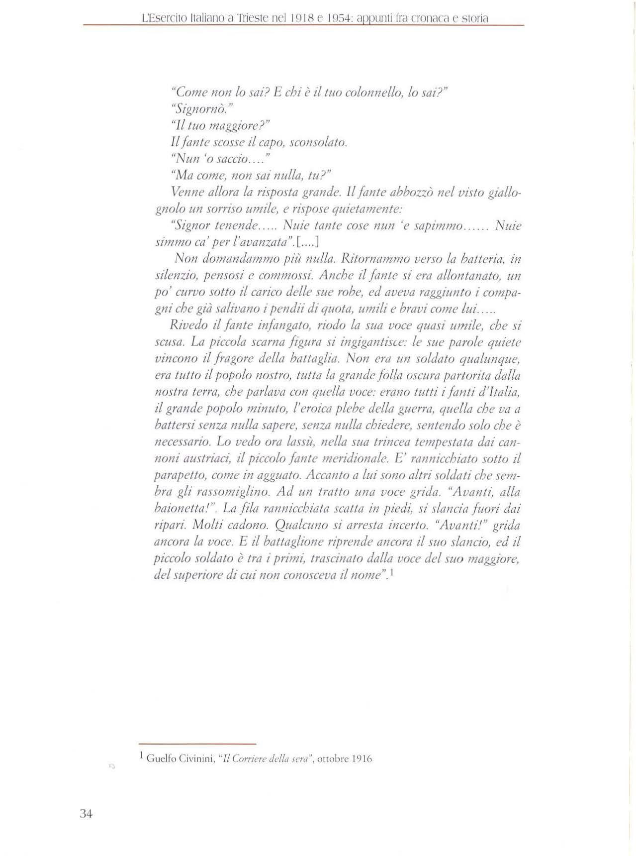 Una deliberata eccezione al normale modello storiografico, quindi , per sottolineare la peculiarità dell'intimo rapporto emozionale esistente fra l'Esercito e la Città di San Giusto. Un rapporto nato nel novembre 1918 sotto forma di una passione ardente, riesplosa con maggiore intensità 36 anni dopo, ancora più sofferta nelle sue premesse e maceratasi nel dolore di una l unga attesa.