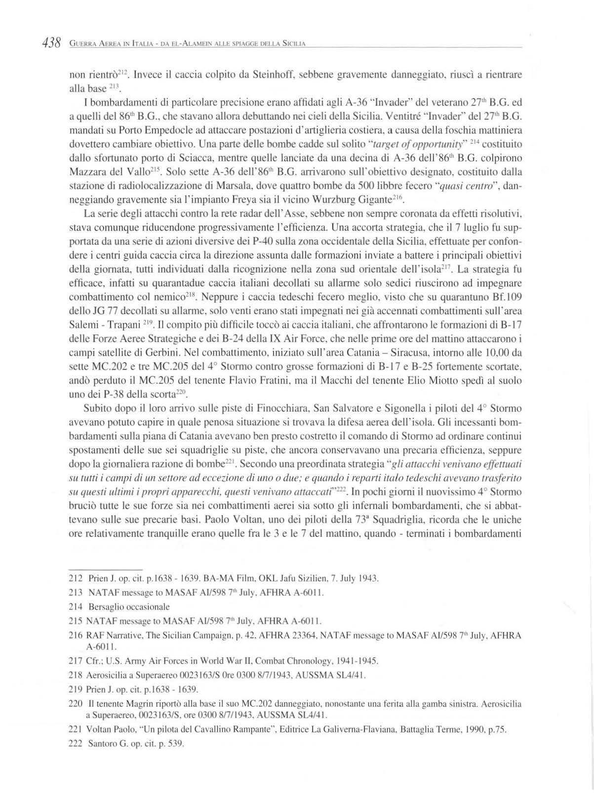 dal genera le Silvano Bronchini direttore di "Ae ro nautica" e dal sig. Pietro de Benedetti, direttore di "Ala Tricolore. Dedico particolari 1ingraziamenti a Mr. William H. Hassard, che mi ha liberalmente inviato la monumentale storia del 376'h Bomb Grou~), all'ing. Bruno Minguzzi per avere genti lm ente messo disposizione una importante parte delle memorie di suo padre - l'allora Maggiore pilota Vittorio Minguzzi, comandante del 22 ° GR. C.T. - al dott. Paolo Voltan per il gentile omaggio del suo bel libro " Un pi lota del Cavallino Rampante", al prof. Alberto Santoni per averm i inviato il suo introvabile libro "Le operazioni in Sicilia e in Ca labria" . Esprimo la mia più viva gratitudine a tutti coloro che hanno risposto pazientemente alle mie domande mettendomi disposizione libri, documenti e fotografie, fra cui il col. Giovan ni Del Gais ed i signori Giuseppe Federico Gergo, Lionello Leone , Alessandro Dondoli. Riservo una speciale menzione agli amici Ermanno Briglia ed Aldo Brovarone. Per altri apporti ricordo le gentili signore: Bertocci Nicoletta, Borsini - Serpentini, Resi Sponza, Longhini Martin i Luciana e Gancuzza Concetta. Mia moglie, Maria Anton ietta, con il suo sostegno ed i suoi preziosi consigli, ha avuto una parte non indifferente in questo lavoro. Ringrazio infine il capo del 5° Reparto dello Stato Maggiore Aeronautica generale B.A. Salvato re Gagliano, il capo dell'Ufficio Storico Col. A.A.r.n. Angelo Piccillo, i generali Eu ro Rossi, Giovanni De Lorenzo e Vincenzo Spina, ed i tenenti colonnelli Giancarlo Montinaro e Carlo Cipriani ed il maggiore Enrico Enico, senza la cui competente assistenza questa opera non avrebbe visto la luce.