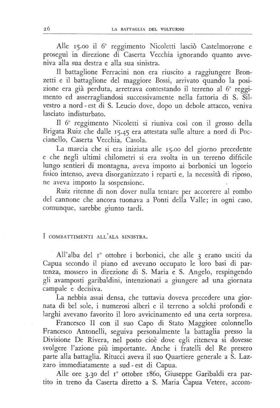 I l 6 s e t t e m b r e 1 8 6 0 l e t r u p p e b o r b o n i c h e , l a s c i a t a N a p o l i , s i e r a n o r i t i r a t e a C a s e r t a e s u c c e s s i v a m e n t e a C a p u a e s u l l a d e s t r a d e l V o l t u r n o , t r a T r i f l i s c o e C a i a z z o , i n t e r p o n e n d o l e m u r a d e l l a f o r t e z z a c i l fi u m e t r a d i e s s e e i p r i m i s o p r a g g i u n g e n t i r e p a r t i d e i v o l o n t a r i g a r i b a l d i n i . N e a v e v a i l c o m a n d o i l M a r e s c i a l l o d i c a m p o G i o s u è R i t u c c i n a t o a N a p o l i l ’ 8 a p r i l e 1794, u f fi c i a l e d i v a s t a c u l t u r a m i l i t a r e m a d i s c a r s a e s p e r i e n z a , t r a t t a d a l l e p o c h e e m o d e s t e c a m p a g n e a l l e q u a l i a v e v a p a r t e c i p a t o n e i 5 3 a n n i d e l l a s u a p u r l u n g a c a r r i e r a . S u o C a p o d i S t a t o M a g g i o r e e r a i l c o l o n n e l l o T o m m a s o B e r t o l i n i .