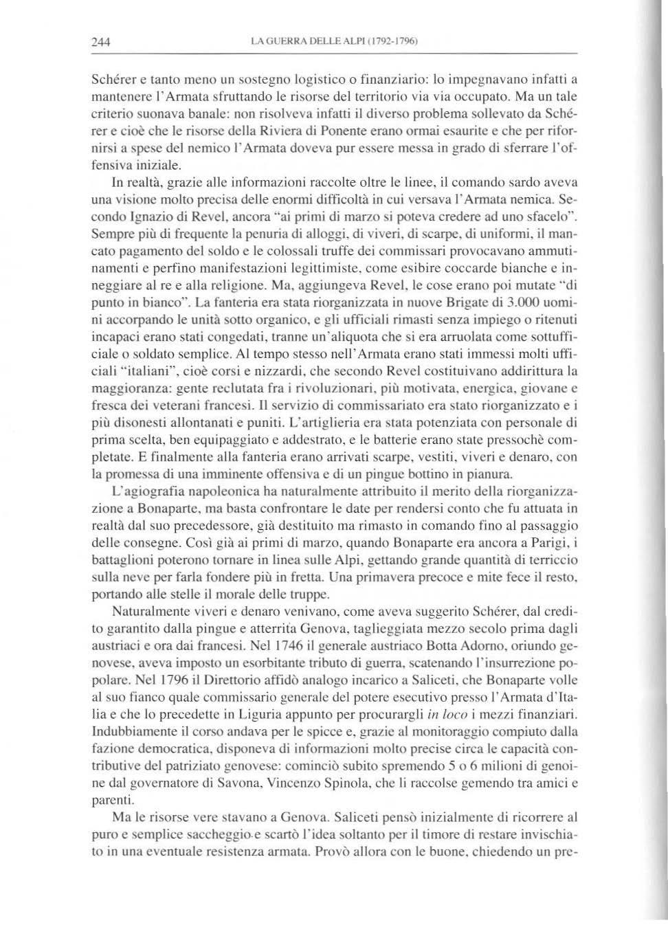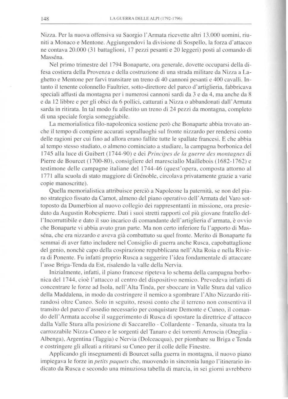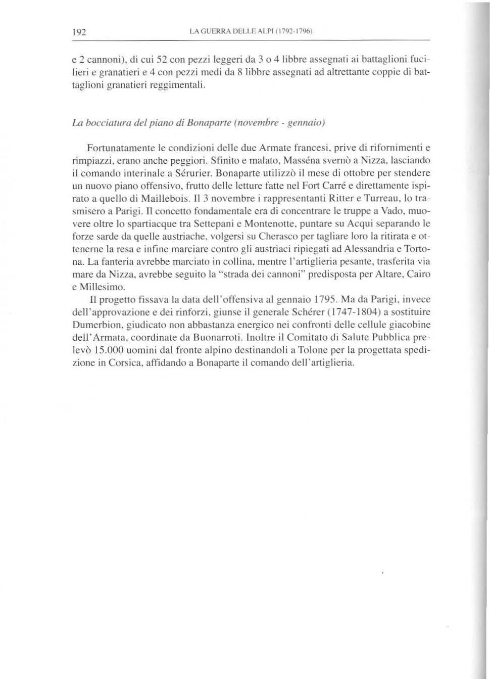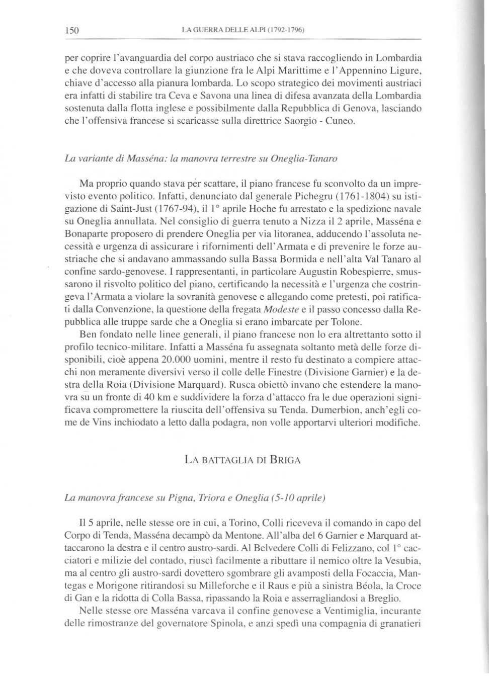Anche la nostra ri ce rca ha trovato varie conferme spec ifich e alle te si ge nerali di Gri ffith e alla particolare intuizione di Fe rrero che la prima grande vittoria s trategica di Bonaparte gli sia stata in rea ltà re ga lata dalla dettagliata pianifica zio ne impostag li da Carnot e da una co mples sa partita diplomatica giocata fra il Direttorio. il partito legittimista e le corti di Torin o e di San Giacomo. Ma soprattutto essa ci ha consentito di ricostruire in dettag li o l'azione dei comandami che precedettero Bonaparte. dalla quale emerge chiaramente che la condotta operativa della sua Armata nell'aprile 1796 fu in realtà il me ro coronamento dei sacrifici e dell'esperienza accumulati in tre anni di lotta. Anche, naturalmente , con il conco rso dello stesso Bonaparte, già comandante dcii' artiglieria d el l 'A rmata d·Italia: ma senza dimenticare quello, ancor più incisivo, di altri strateghi, a cominciare dai nizzardi Rusca e Masséna.