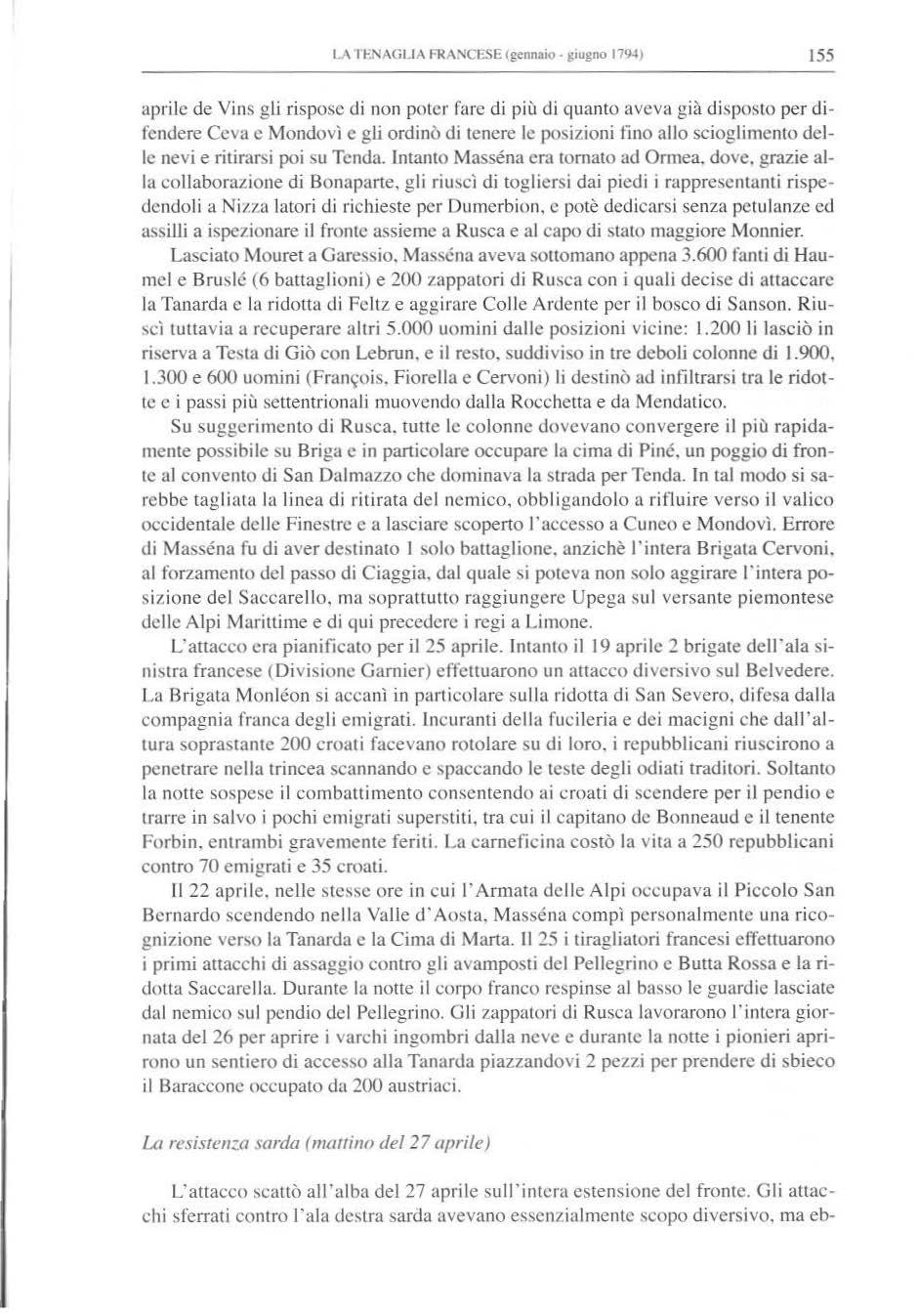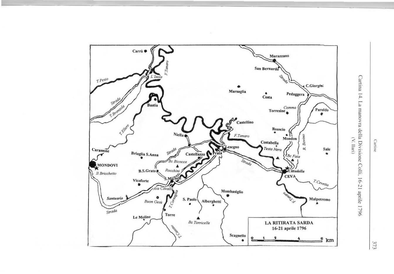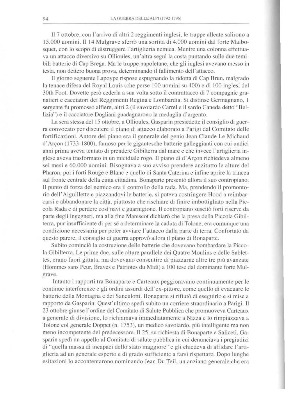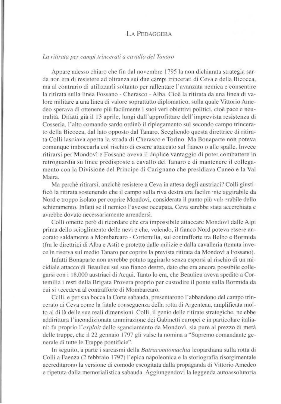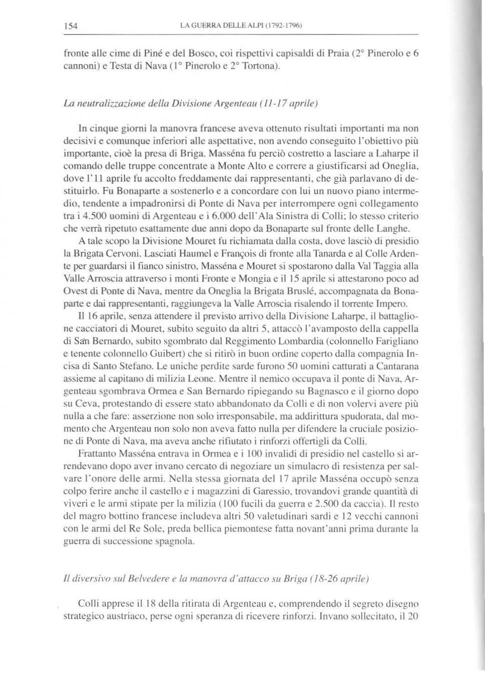 Anche la nostra ri ce rca ha trovato varie conferme spec ifich e alle te si ge nerali di Gri ffith e alla particolare intuizione di Fe rrero che la prima grande vittoria s trategica di Bonaparte gli sia stata in rea ltà re ga lata dalla dettagliata pianifica zio ne impostag li da Carnot e da una co mples sa partita diplomatica giocata fra il Direttorio. il partito legittimista e le corti di Torin o e di San Giacomo. Ma soprattutto essa ci ha consentito di ricostruire in dettag li o l'azione dei comandami che precedettero Bonaparte. dalla quale emerge chiaramente che la condotta operativa della sua Armata nell'aprile 1796 fu in realtà il me ro coronamento dei sacrifici e dell'esperienza accumulati in tre anni di lotta. Anche, naturalmente , con il conco rso dello stesso Bonaparte, già comandante dcii' artiglieria d el l 'A rmata d·Italia: ma senza dimenticare quello, ancor più incisivo, di altri strateghi, a cominciare dai nizzardi Rusca e Masséna.