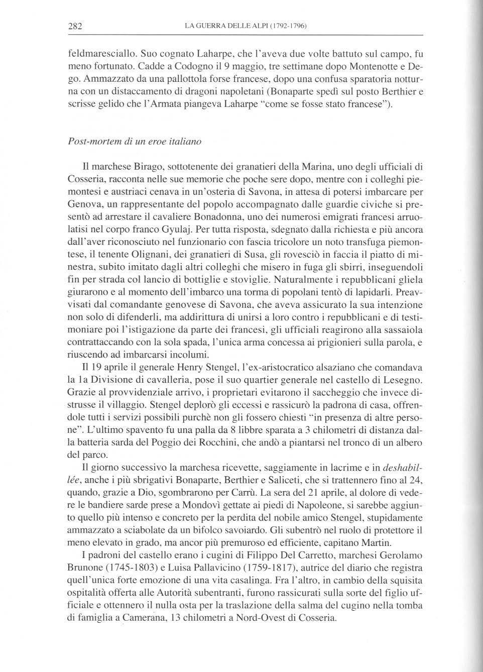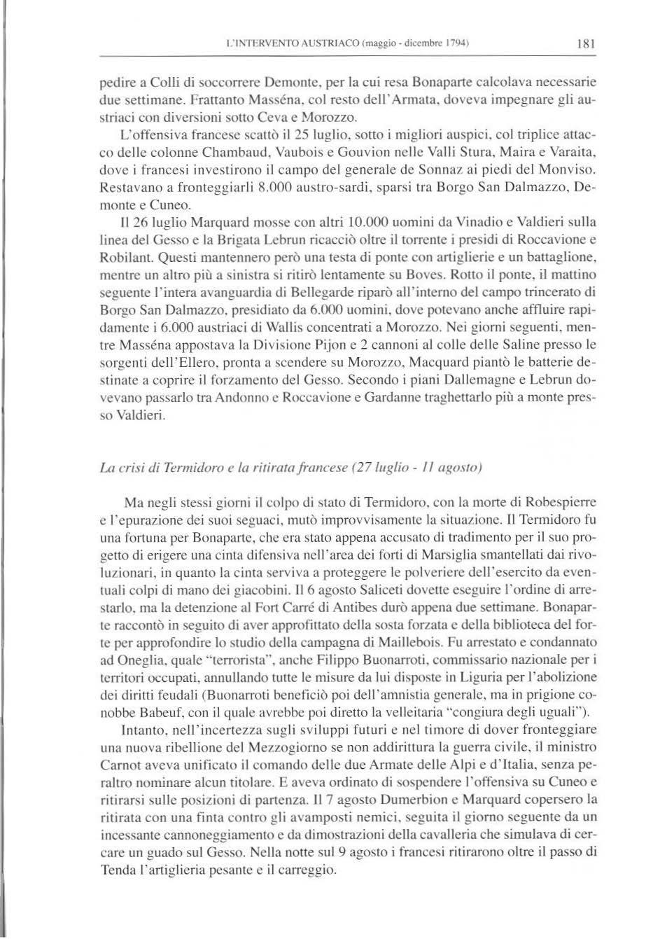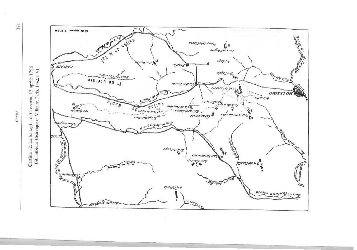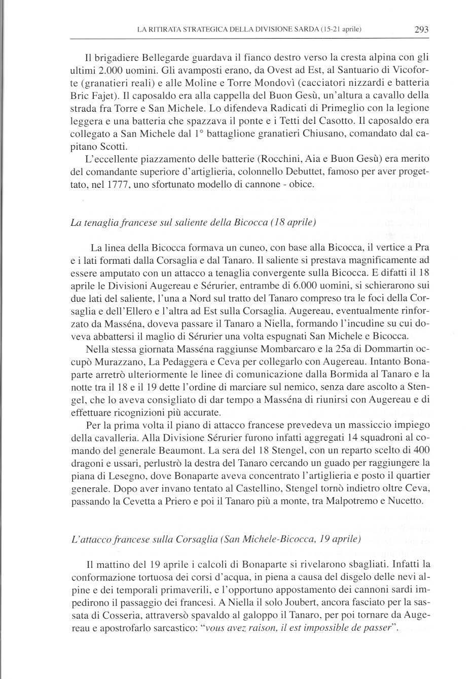 Anche la nostra ri ce rca ha trovato varie conferme spec ifich e alle te si ge nerali di Gri ffith e alla particolare intuizione di Fe rrero che la prima grande vittoria s trategica di Bonaparte gli sia stata in rea ltà re ga lata dalla dettagliata pianifica zio ne impostag li da Carnot e da una co mples sa partita diplomatica giocata fra il Direttorio. il partito legittimista e le corti di Torin o e di San Giacomo. Ma soprattutto essa ci ha consentito di ricostruire in dettag li o l'azione dei comandami che precedettero Bonaparte. dalla quale emerge chiaramente che la condotta operativa della sua Armata nell'aprile 1796 fu in realtà il me ro coronamento dei sacrifici e dell'esperienza accumulati in tre anni di lotta. Anche, naturalmente , con il conco rso dello stesso Bonaparte, già comandante dcii' artiglieria d el l 'A rmata d·Italia: ma senza dimenticare quello, ancor più incisivo, di altri strateghi, a cominciare dai nizzardi Rusca e Masséna.