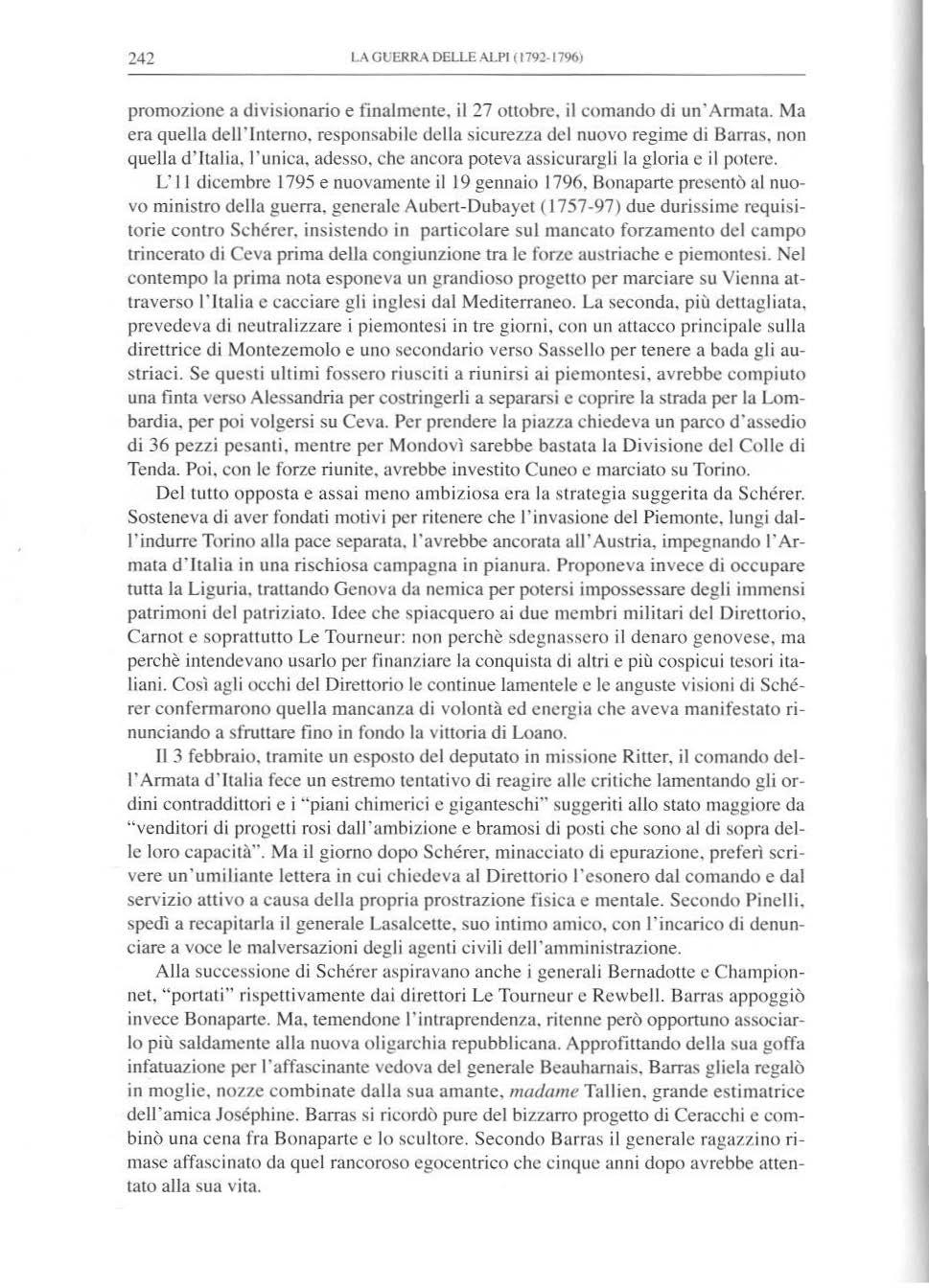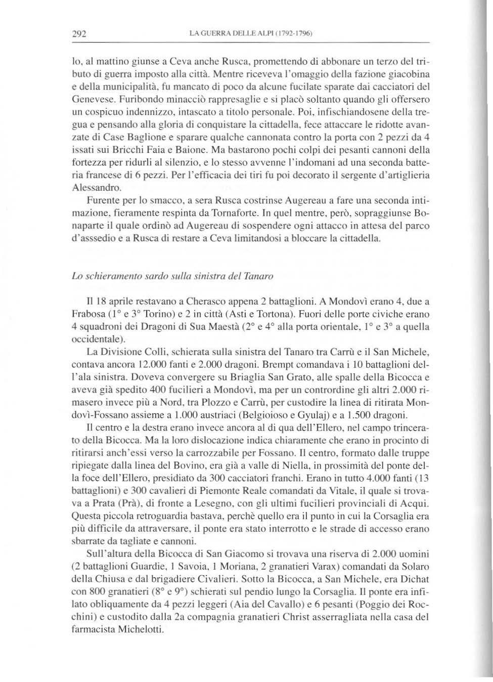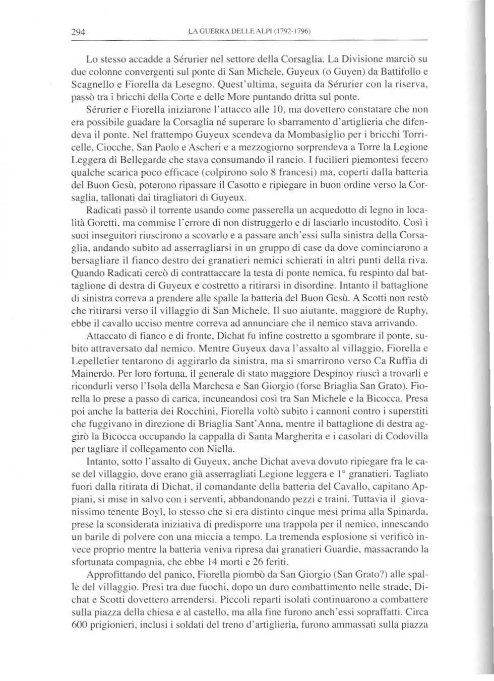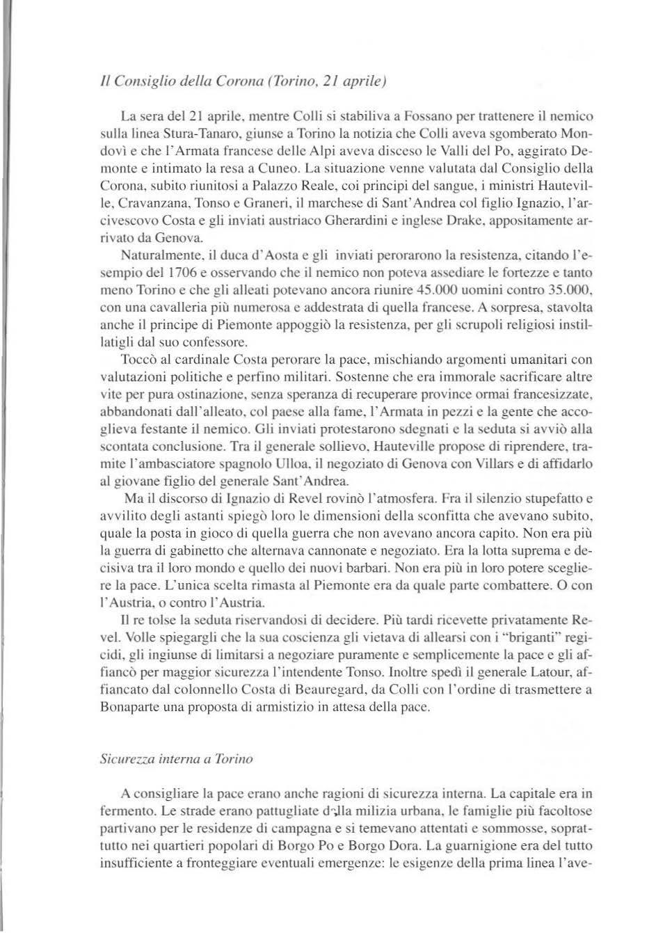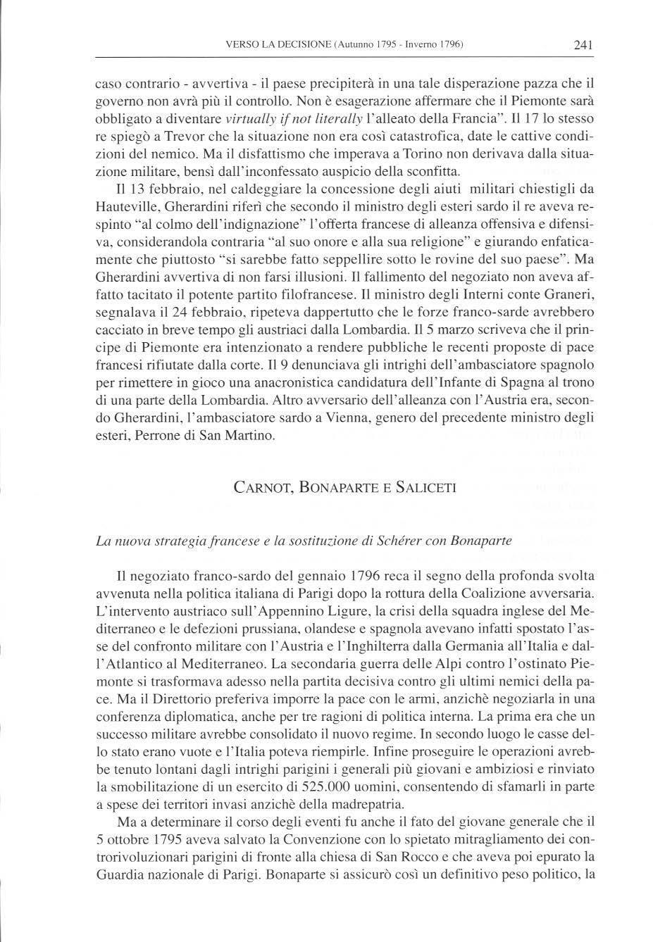 Anche la nostra ri ce rca ha trovato varie conferme spec ifich e alle te si ge nerali di Gri ffith e alla particolare intuizione di Fe rrero che la prima grande vittoria s trategica di Bonaparte gli sia stata in rea ltà re ga lata dalla dettagliata pianifica zio ne impostag li da Carnot e da una co mples sa partita diplomatica giocata fra il Direttorio. il partito legittimista e le corti di Torin o e di San Giacomo. Ma soprattutto essa ci ha consentito di ricostruire in dettag li o l'azione dei comandami che precedettero Bonaparte. dalla quale emerge chiaramente che la condotta operativa della sua Armata nell'aprile 1796 fu in realtà il me ro coronamento dei sacrifici e dell'esperienza accumulati in tre anni di lotta. Anche, naturalmente , con il conco rso dello stesso Bonaparte, già comandante dcii' artiglieria d el l 'A rmata d·Italia: ma senza dimenticare quello, ancor più incisivo, di altri strateghi, a cominciare dai nizzardi Rusca e Masséna.