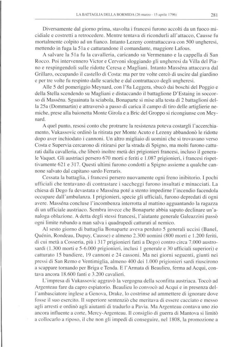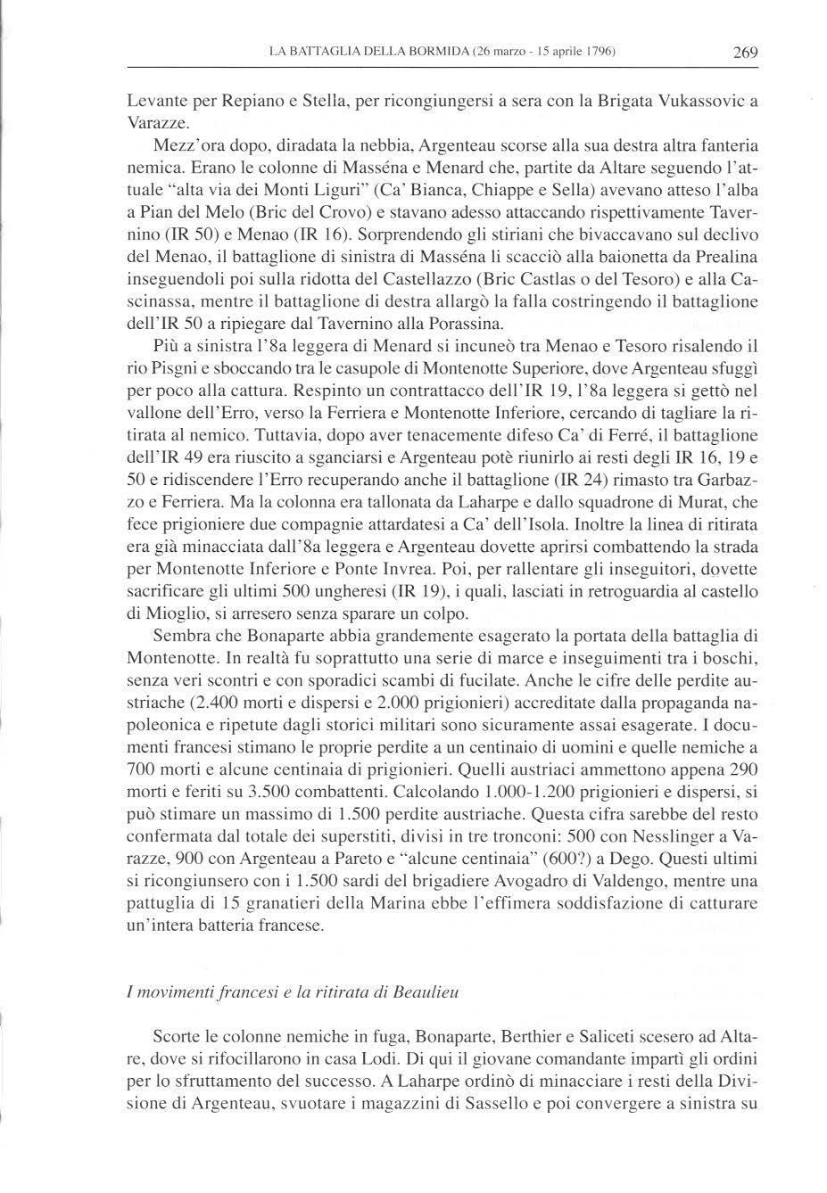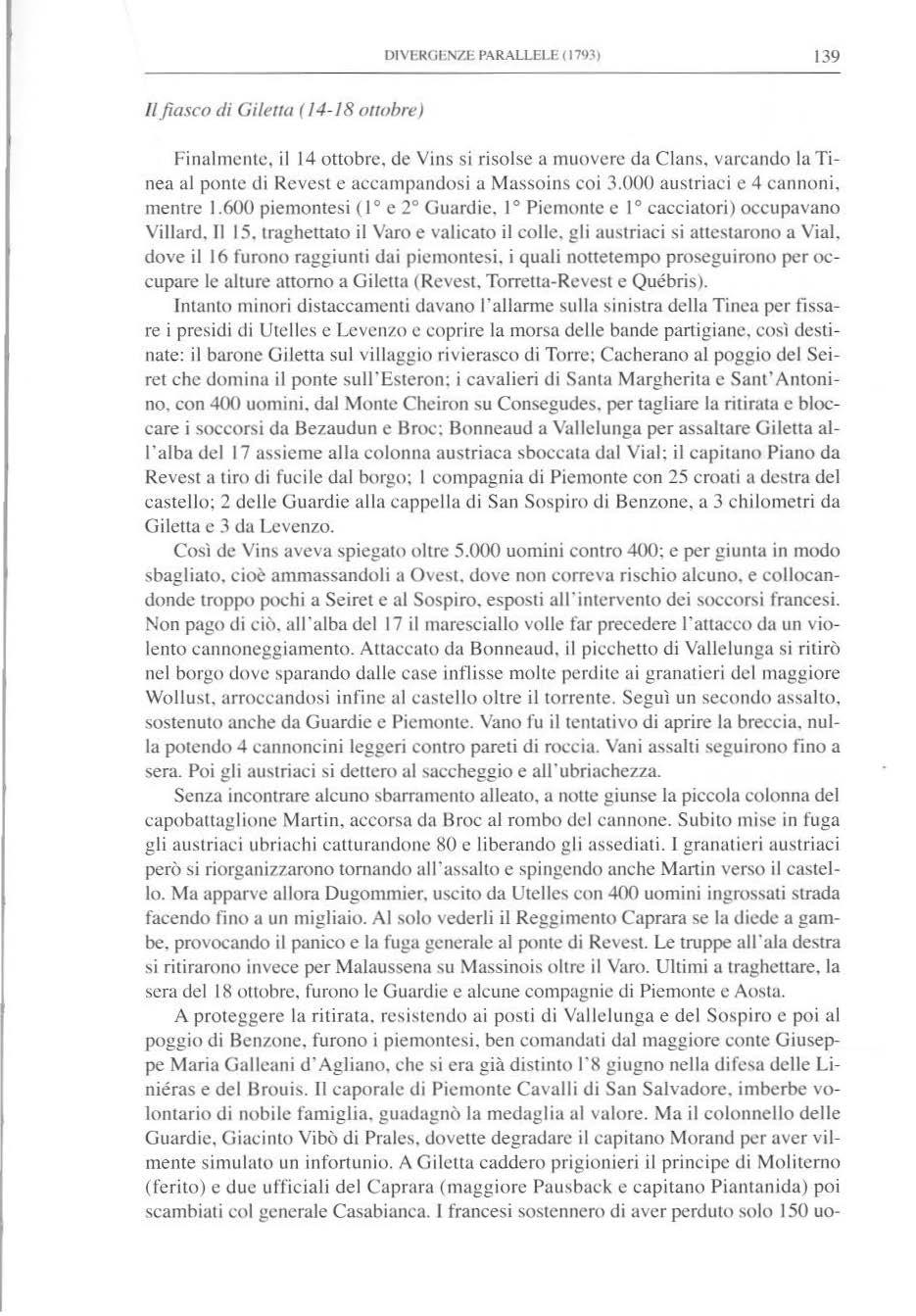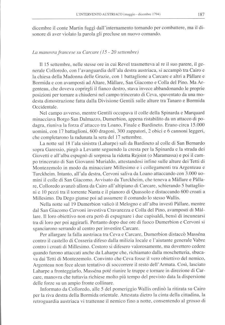 Anche la nostra ri ce rca ha trovato varie conferme spec ifich e alle te si ge nerali di Gri ffith e alla particolare intuizione di Fe rrero che la prima grande vittoria s trategica di Bonaparte gli sia stata in rea ltà re ga lata dalla dettagliata pianifica zio ne impostag li da Carnot e da una co mples sa partita diplomatica giocata fra il Direttorio. il partito legittimista e le corti di Torin o e di San Giacomo. Ma soprattutto essa ci ha consentito di ricostruire in dettag li o l'azione dei comandami che precedettero Bonaparte. dalla quale emerge chiaramente che la condotta operativa della sua Armata nell'aprile 1796 fu in realtà il me ro coronamento dei sacrifici e dell'esperienza accumulati in tre anni di lotta. Anche, naturalmente , con il conco rso dello stesso Bonaparte, già comandante dcii' artiglieria d el l 'A rmata d·Italia: ma senza dimenticare quello, ancor più incisivo, di altri strateghi, a cominciare dai nizzardi Rusca e Masséna.
