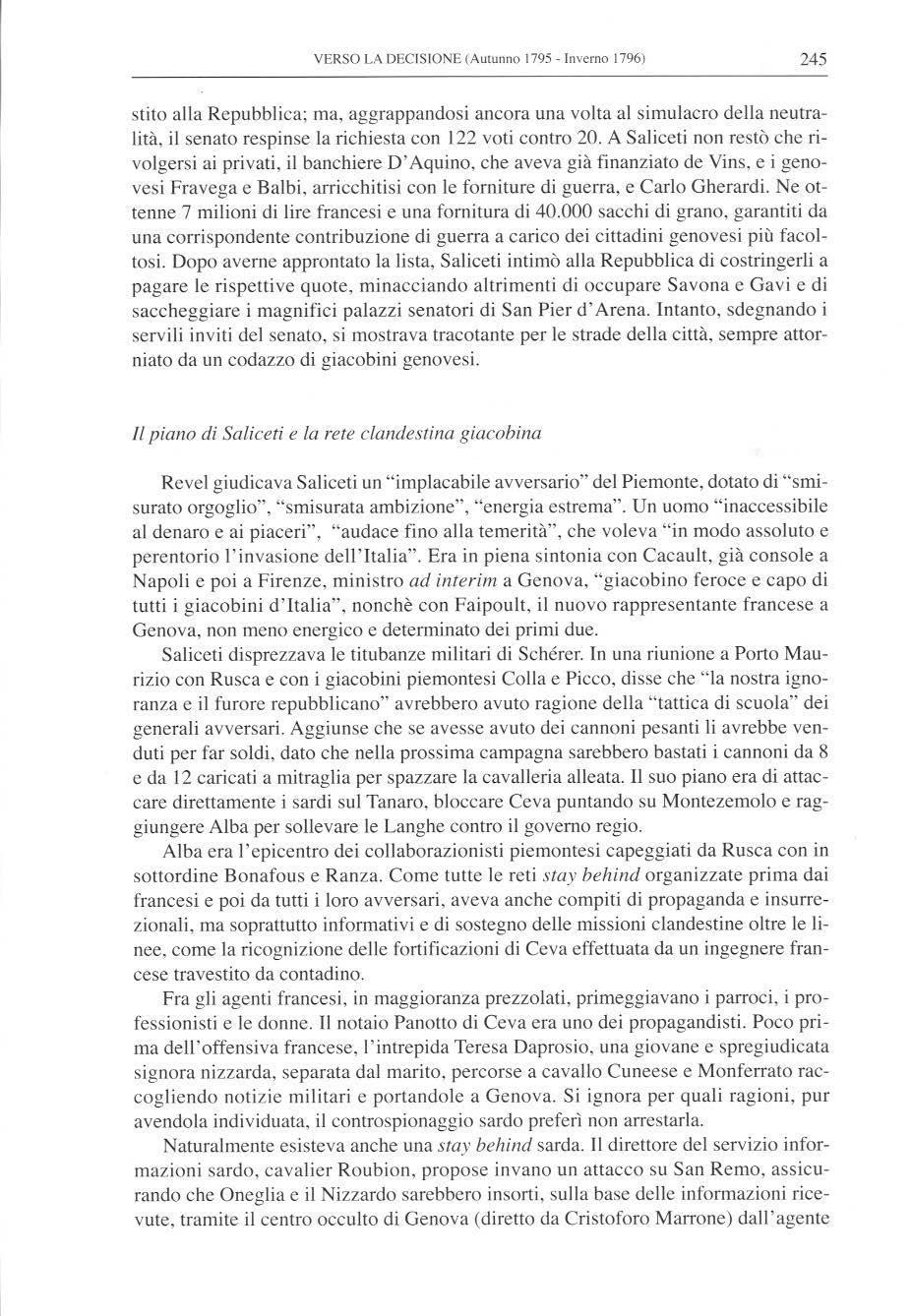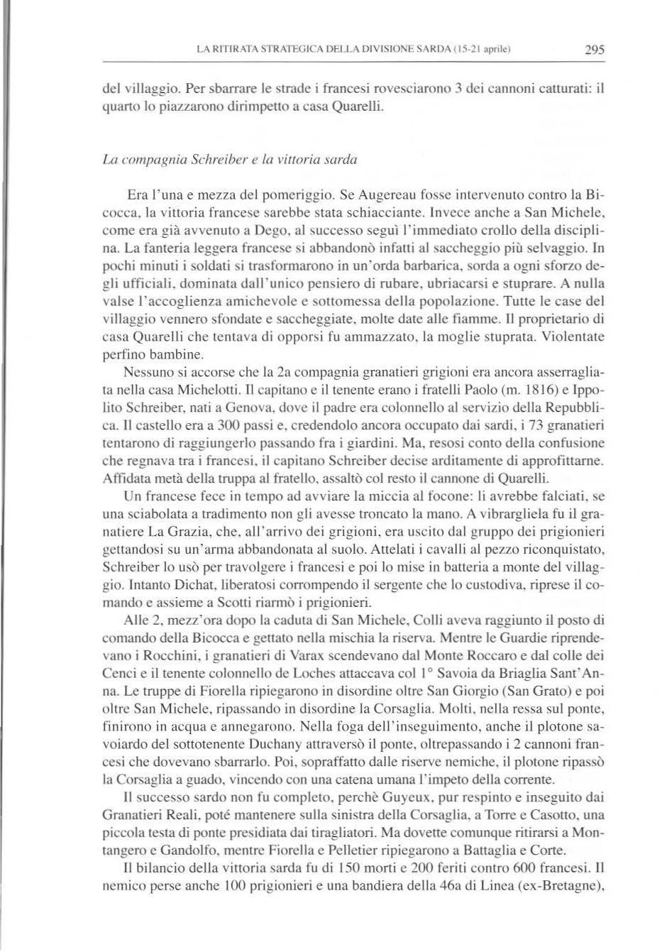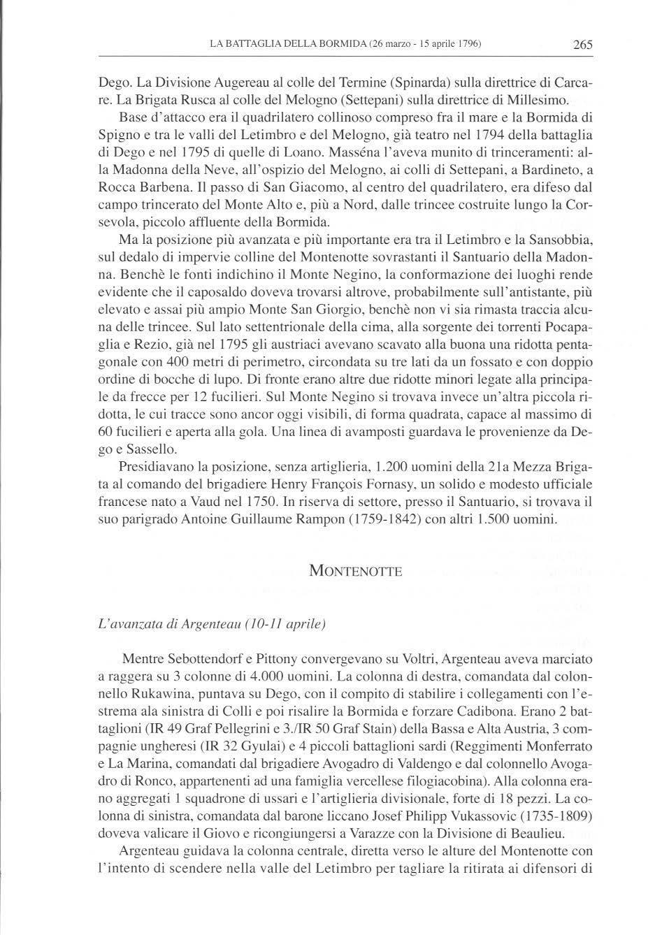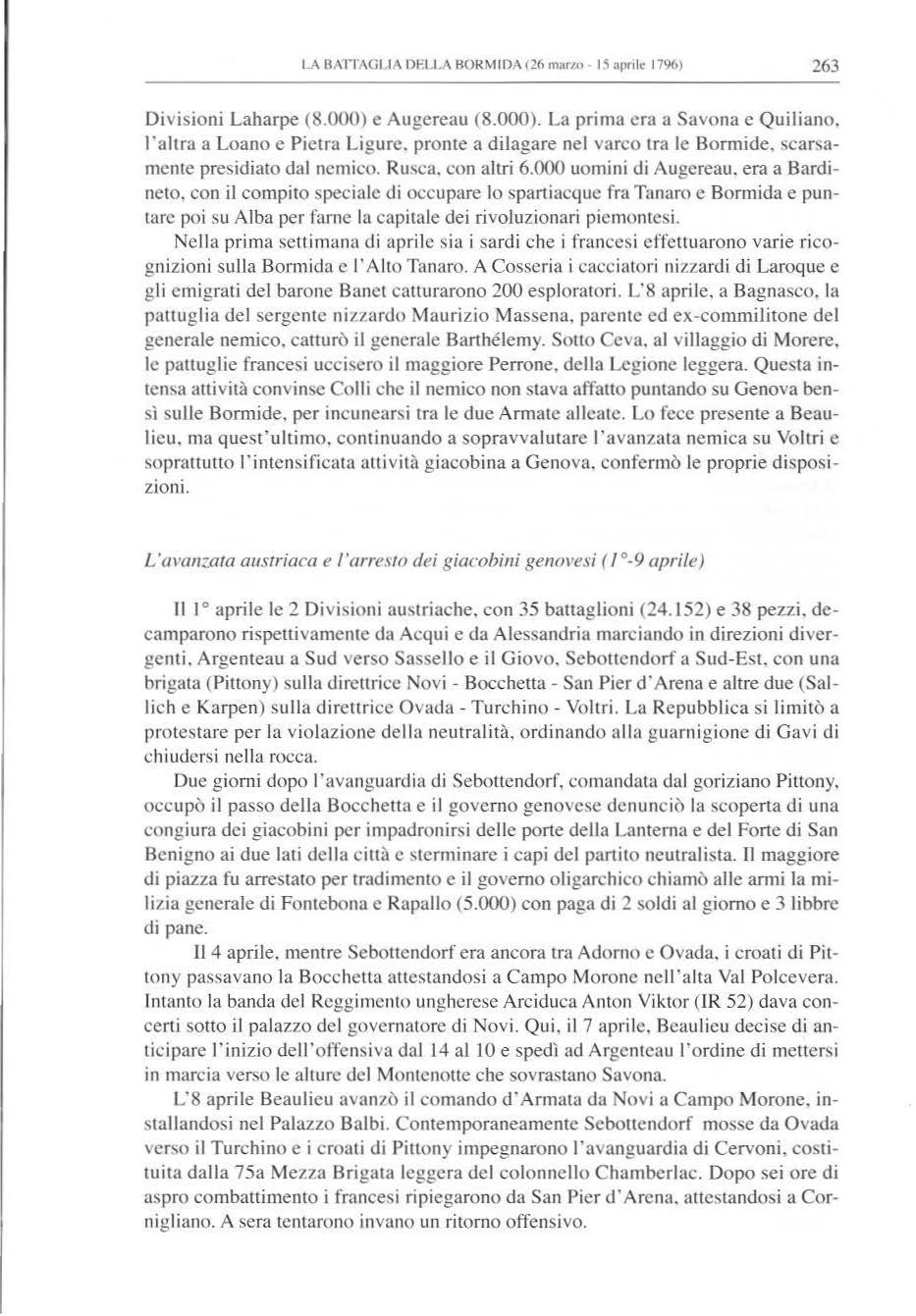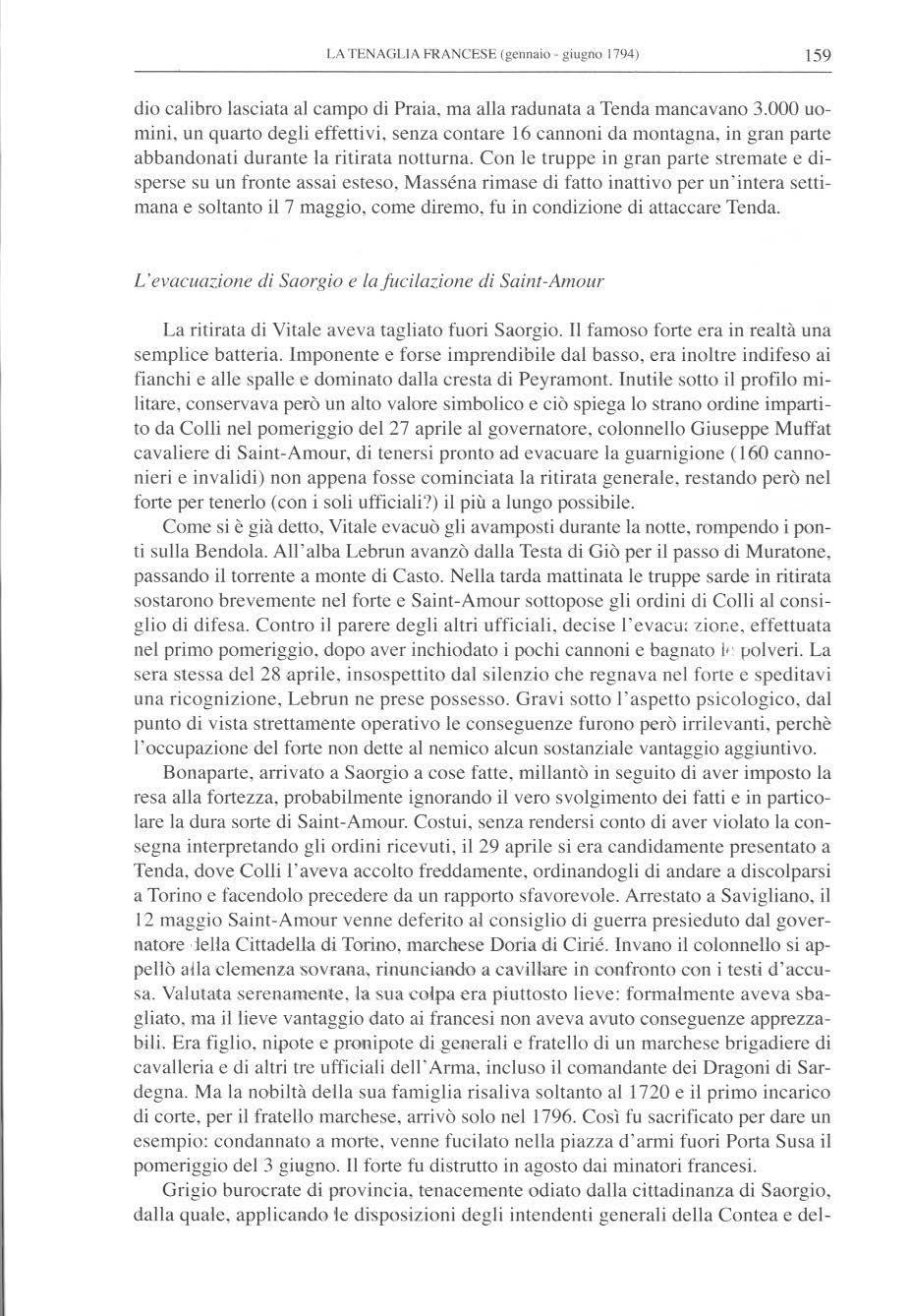 Anche la nostra ri ce rca ha trovato varie conferme spec ifich e alle te si ge nerali di Gri ffith e alla particolare intuizione di Fe rrero che la prima grande vittoria s trategica di Bonaparte gli sia stata in rea ltà re ga lata dalla dettagliata pianifica zio ne impostag li da Carnot e da una co mples sa partita diplomatica giocata fra il Direttorio. il partito legittimista e le corti di Torin o e di San Giacomo. Ma soprattutto essa ci ha consentito di ricostruire in dettag li o l'azione dei comandami che precedettero Bonaparte. dalla quale emerge chiaramente che la condotta operativa della sua Armata nell'aprile 1796 fu in realtà il me ro coronamento dei sacrifici e dell'esperienza accumulati in tre anni di lotta. Anche, naturalmente , con il conco rso dello stesso Bonaparte, già comandante dcii' artiglieria d el l 'A rmata d·Italia: ma senza dimenticare quello, ancor più incisivo, di altri strateghi, a cominciare dai nizzardi Rusca e Masséna.