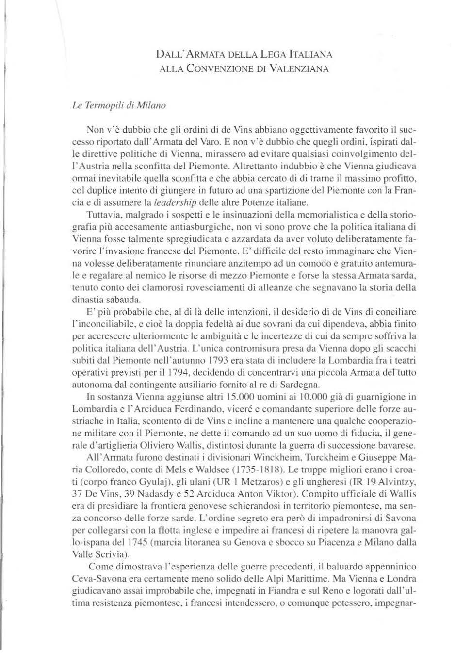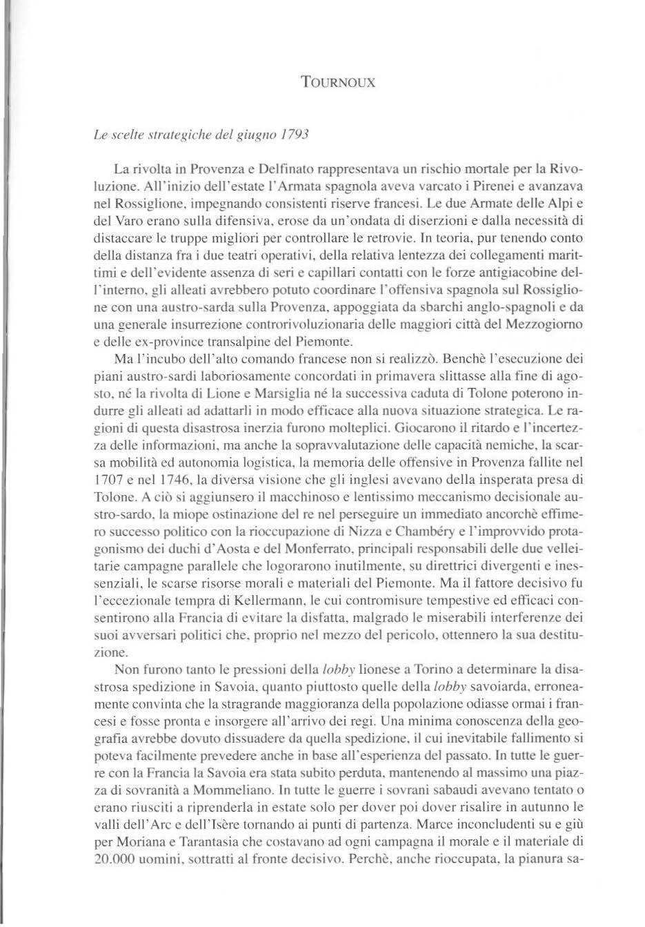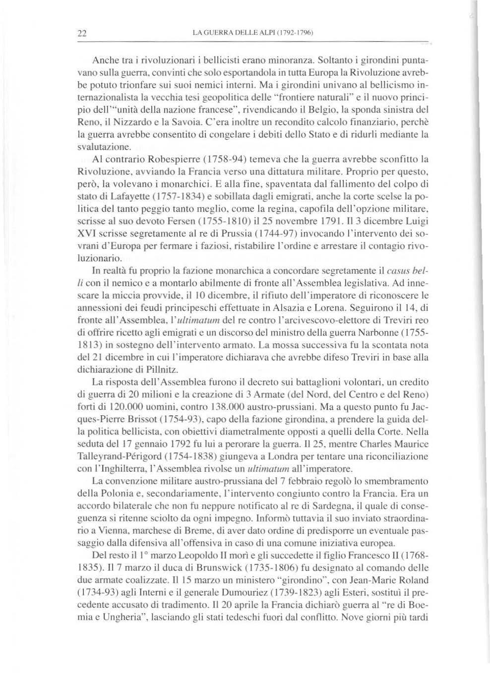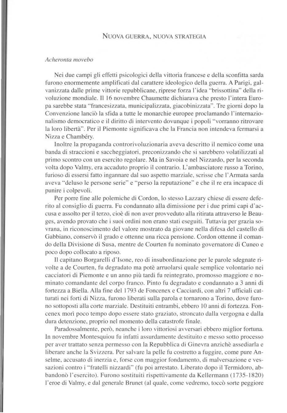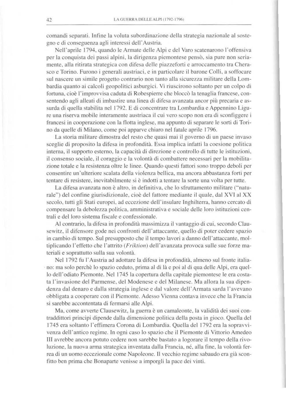 Se il silenzio delle grandi scuole non sorprende, occorre spiegare quello della piccola scuola degli storici militari, in particolare italiani. Infatti la memoria della guerra 1792-96 è stata tramandata soltanto in modo frammentario, attraverso la tradizione sabauda o attraverso la storia delle gue rre napolconichc o della guerra di montagna. È a quest'ultima che l a guerra del 1792-96 deve anzi un nome, sia pure riduttivo: quello cioè di "guerra delle Alpi" È lo stesso nome attribuito dai francesi a ll ' Armata che inizialmente formarono contro il Piemonte. ma dalla quale si distaccò presto un'altra Armata autonoma, detta prima ·'del Varo", e poi, in co nseg uen za della manovra dell'aprile 1794, "d'ltalia". Armata straniera, bcnchè poi integrata da piccole legioni italiane: ma a buon diritto portava quel nome. perchè così tanta pane ebbe nel determinare. anc he nella lun ga durata. il destino e la cultura della società dello stato e della milizia italiani.