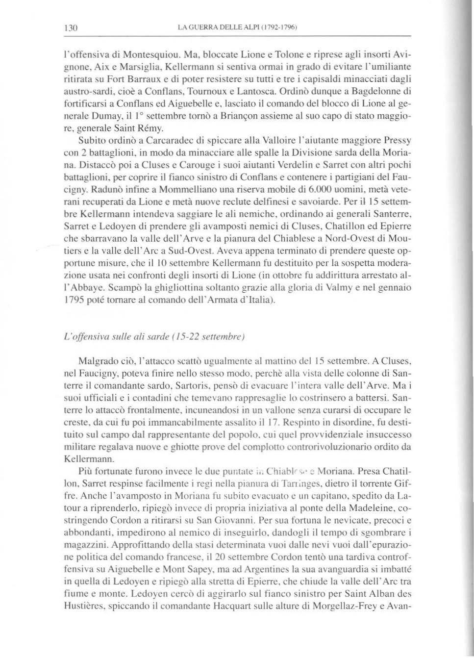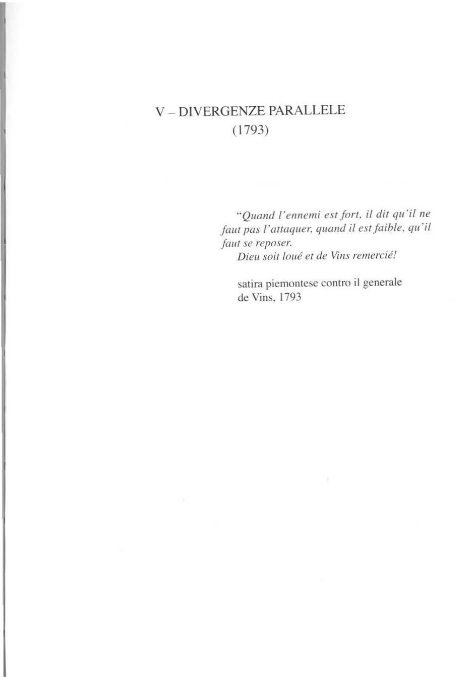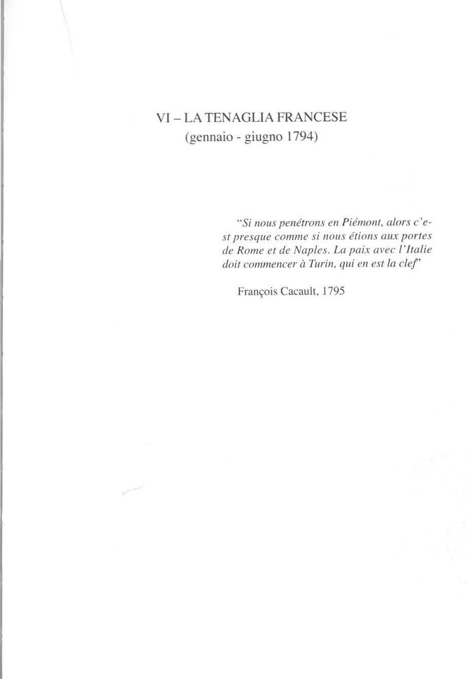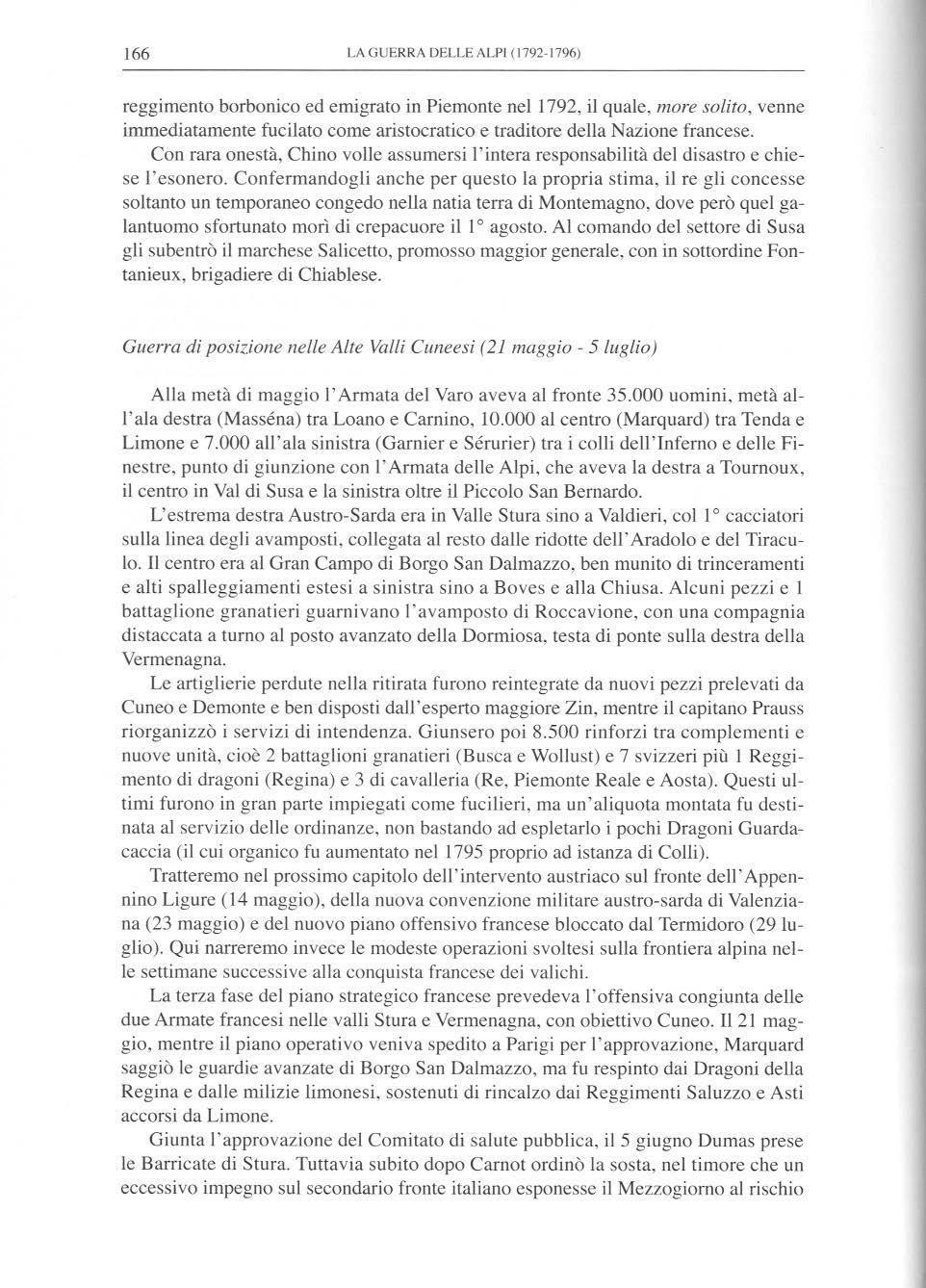 Se il silenzio delle grandi scuole non sorprende, occorre spiegare quello della piccola scuola degli storici militari, in particolare italiani. Infatti la memoria della guerra 1792-96 è stata tramandata soltanto in modo frammentario, attraverso la tradizione sabauda o attraverso la storia delle gue rre napolconichc o della guerra di montagna. È a quest'ultima che l a guerra del 1792-96 deve anzi un nome, sia pure riduttivo: quello cioè di "guerra delle Alpi" È lo stesso nome attribuito dai francesi a ll ' Armata che inizialmente formarono contro il Piemonte. ma dalla quale si distaccò presto un'altra Armata autonoma, detta prima ·'del Varo", e poi, in co nseg uen za della manovra dell'aprile 1794, "d'ltalia". Armata straniera, bcnchè poi integrata da piccole legioni italiane: ma a buon diritto portava quel nome. perchè così tanta pane ebbe nel determinare. anc he nella lun ga durata. il destino e la cultura della società dello stato e della milizia italiani.