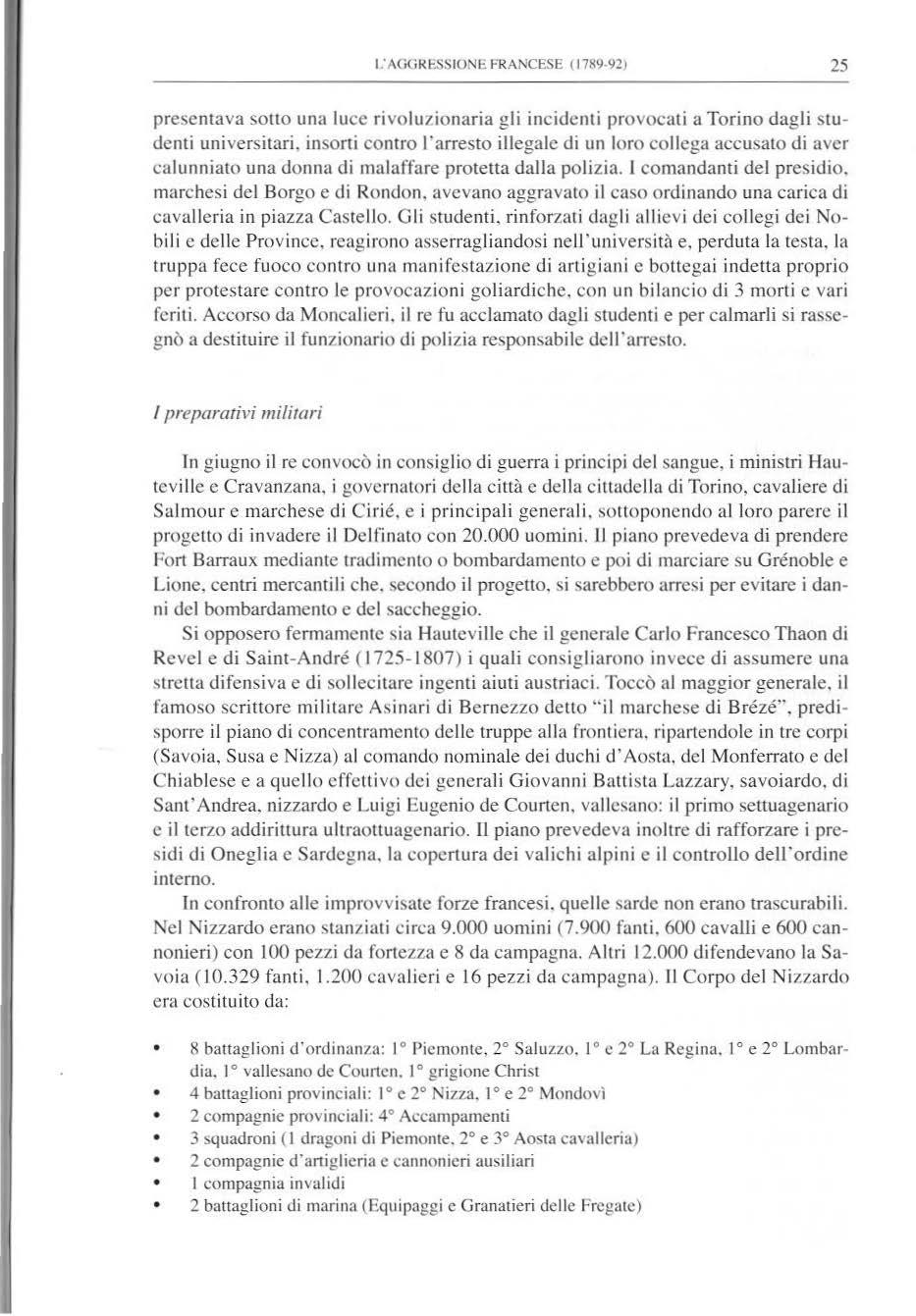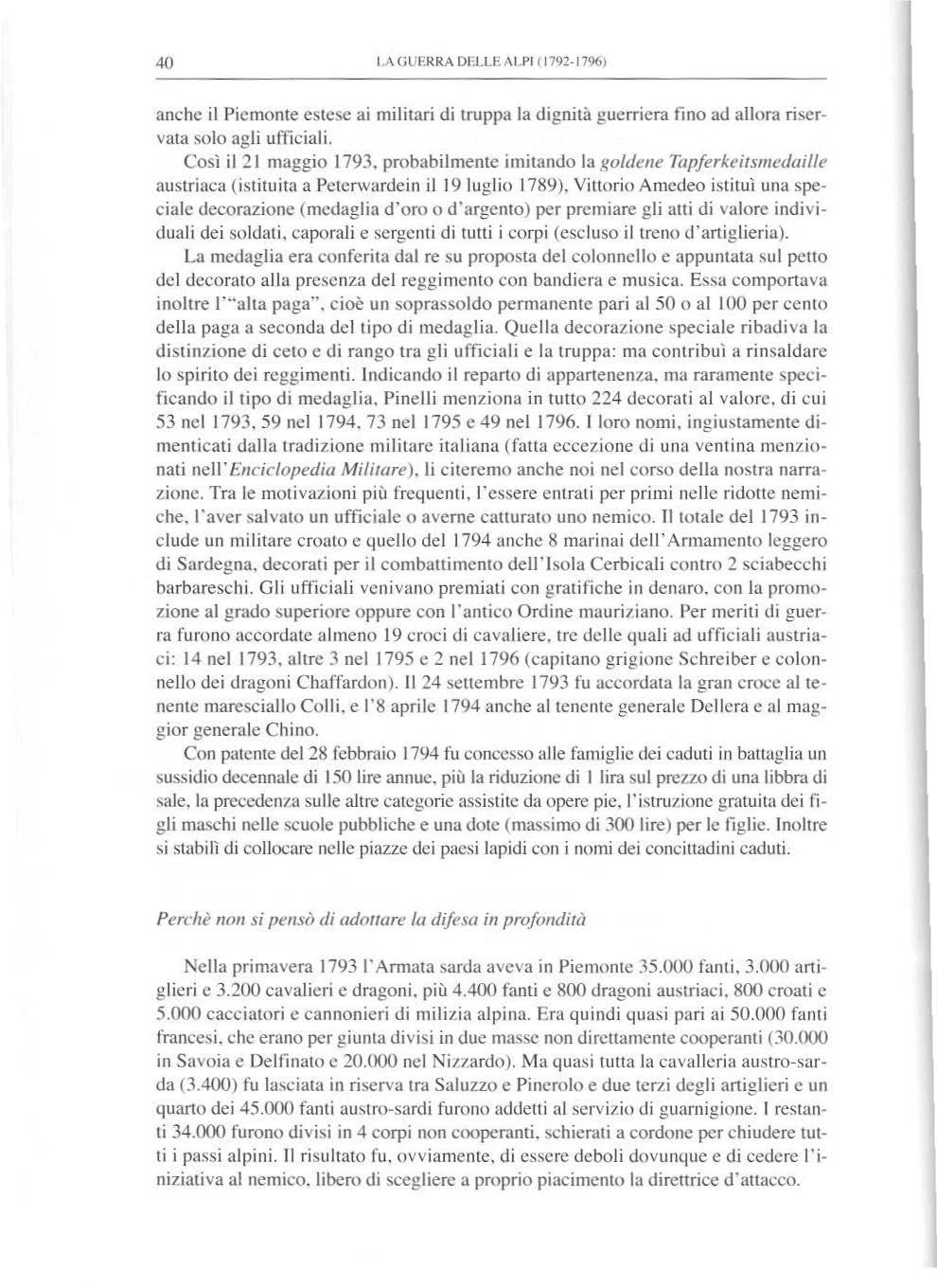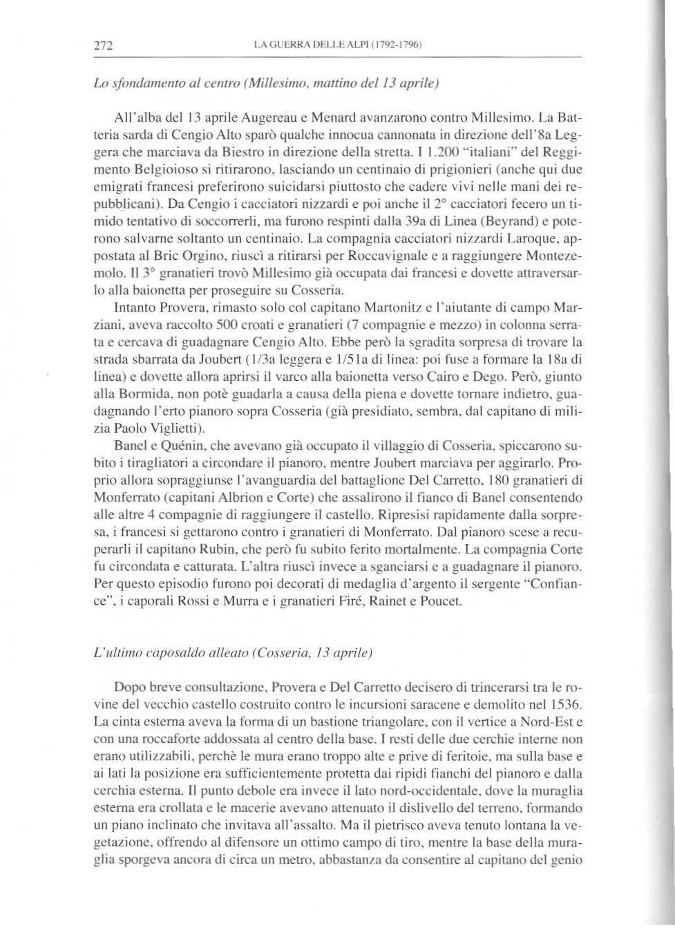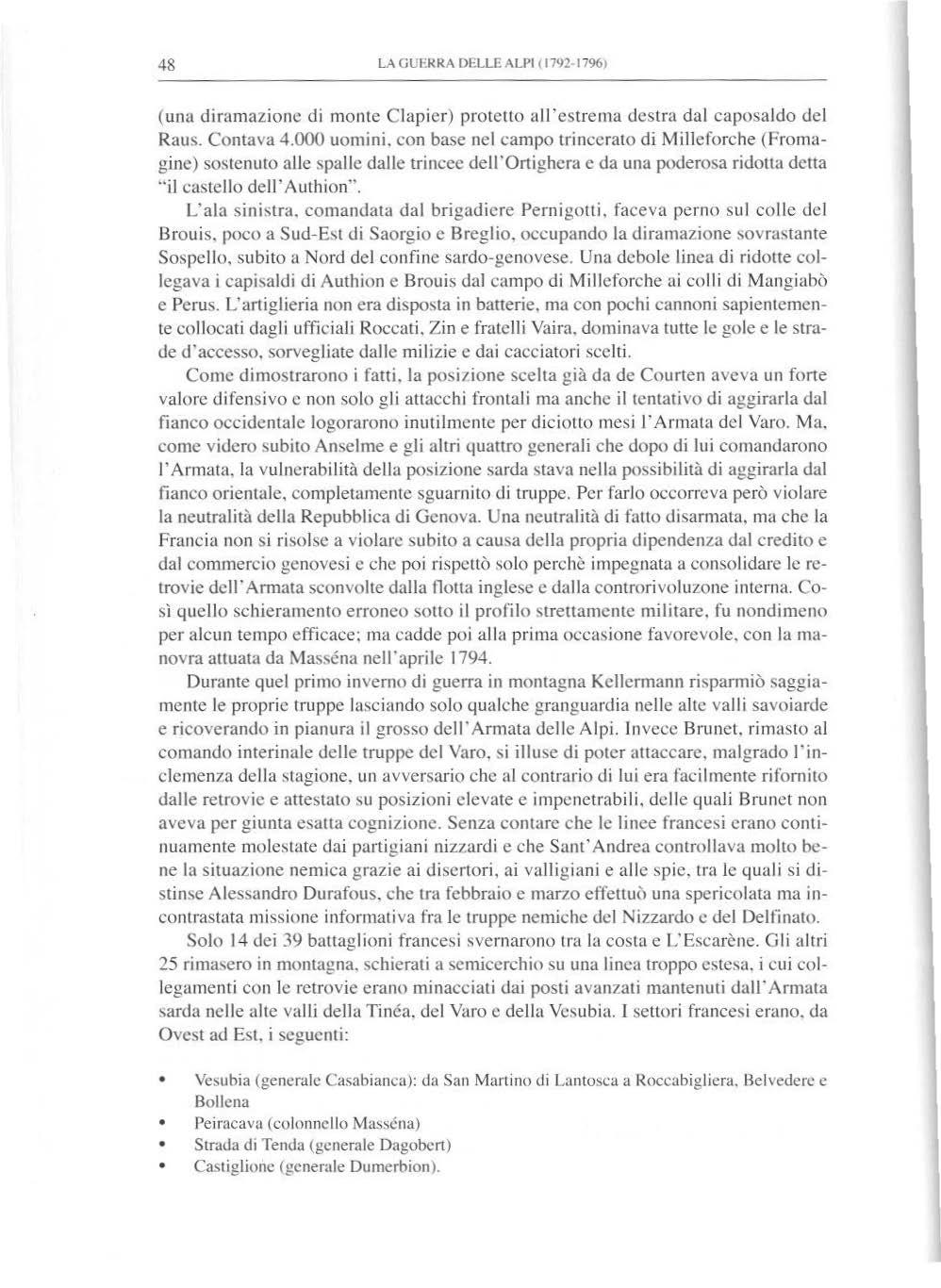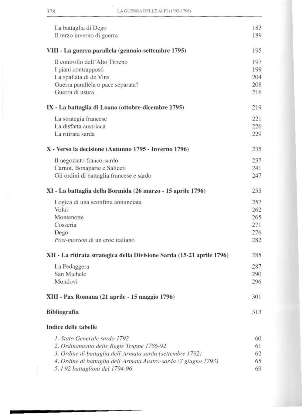 Se il silenzio delle grandi scuole non sorprende, occorre spiegare quello della piccola scuola degli storici militari, in particolare italiani. Infatti la memoria della guerra 1792-96 è stata tramandata soltanto in modo frammentario, attraverso la tradizione sabauda o attraverso la storia delle gue rre napolconichc o della guerra di montagna. È a quest'ultima che l a guerra del 1792-96 deve anzi un nome, sia pure riduttivo: quello cioè di "guerra delle Alpi" È lo stesso nome attribuito dai francesi a ll ' Armata che inizialmente formarono contro il Piemonte. ma dalla quale si distaccò presto un'altra Armata autonoma, detta prima ·'del Varo", e poi, in co nseg uen za della manovra dell'aprile 1794, "d'ltalia". Armata straniera, bcnchè poi integrata da piccole legioni italiane: ma a buon diritto portava quel nome. perchè così tanta pane ebbe nel determinare. anc he nella lun ga durata. il destino e la cultura della società dello stato e della milizia italiani.
