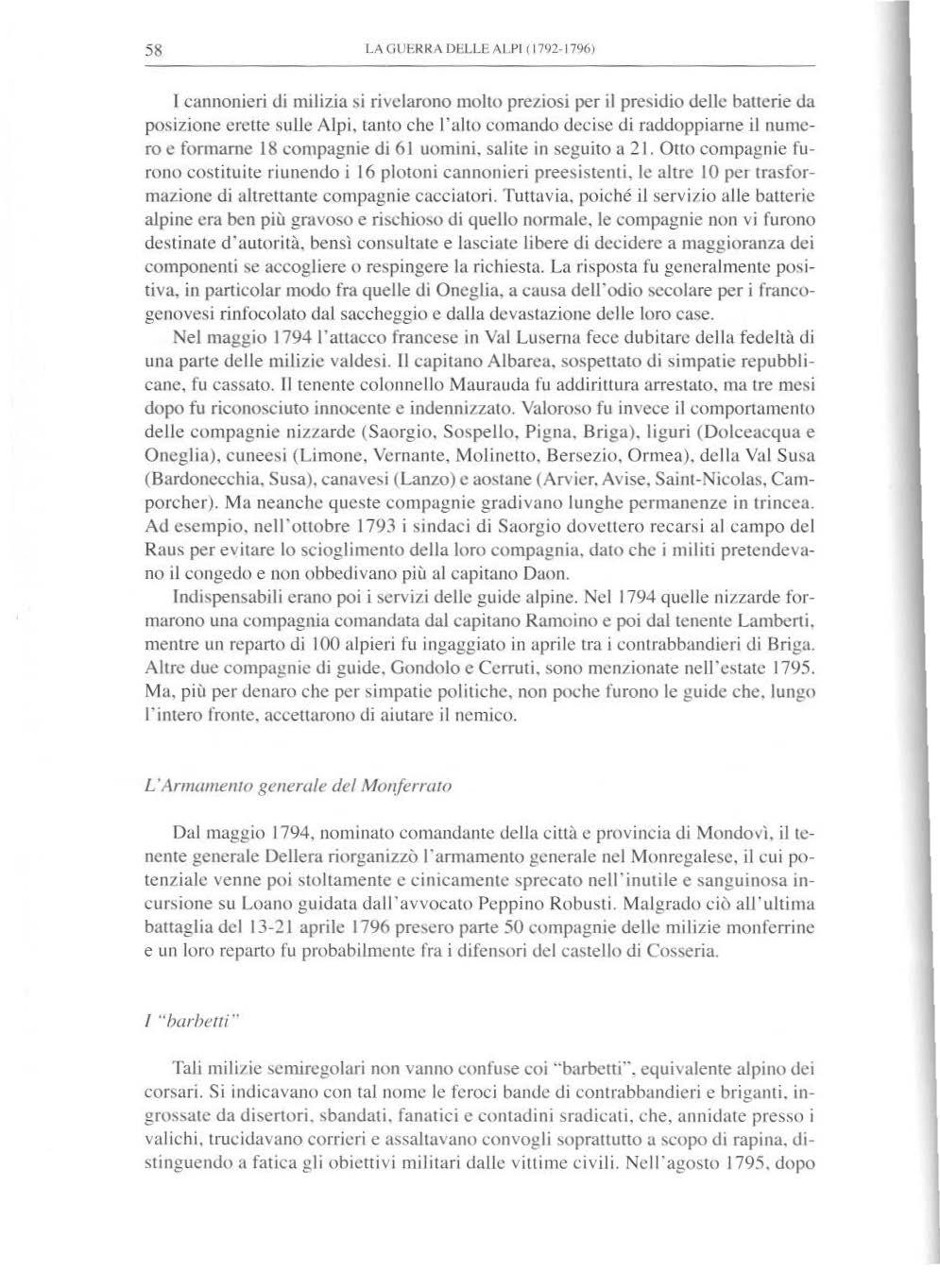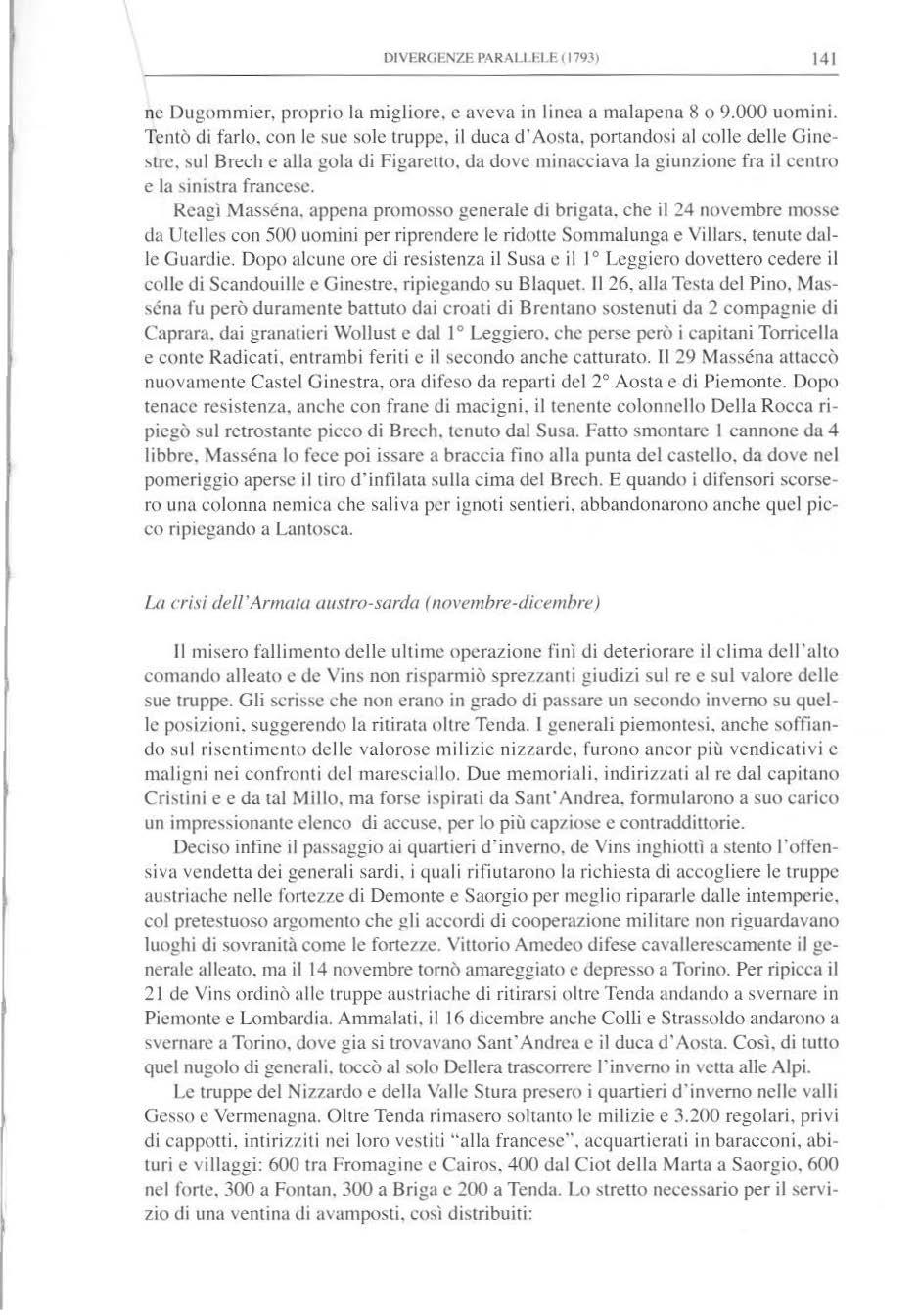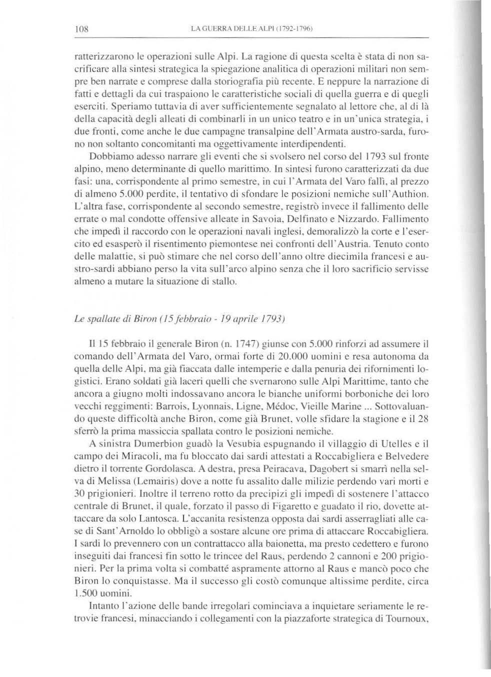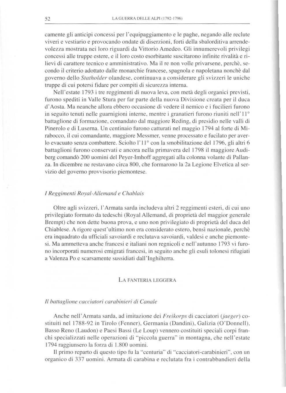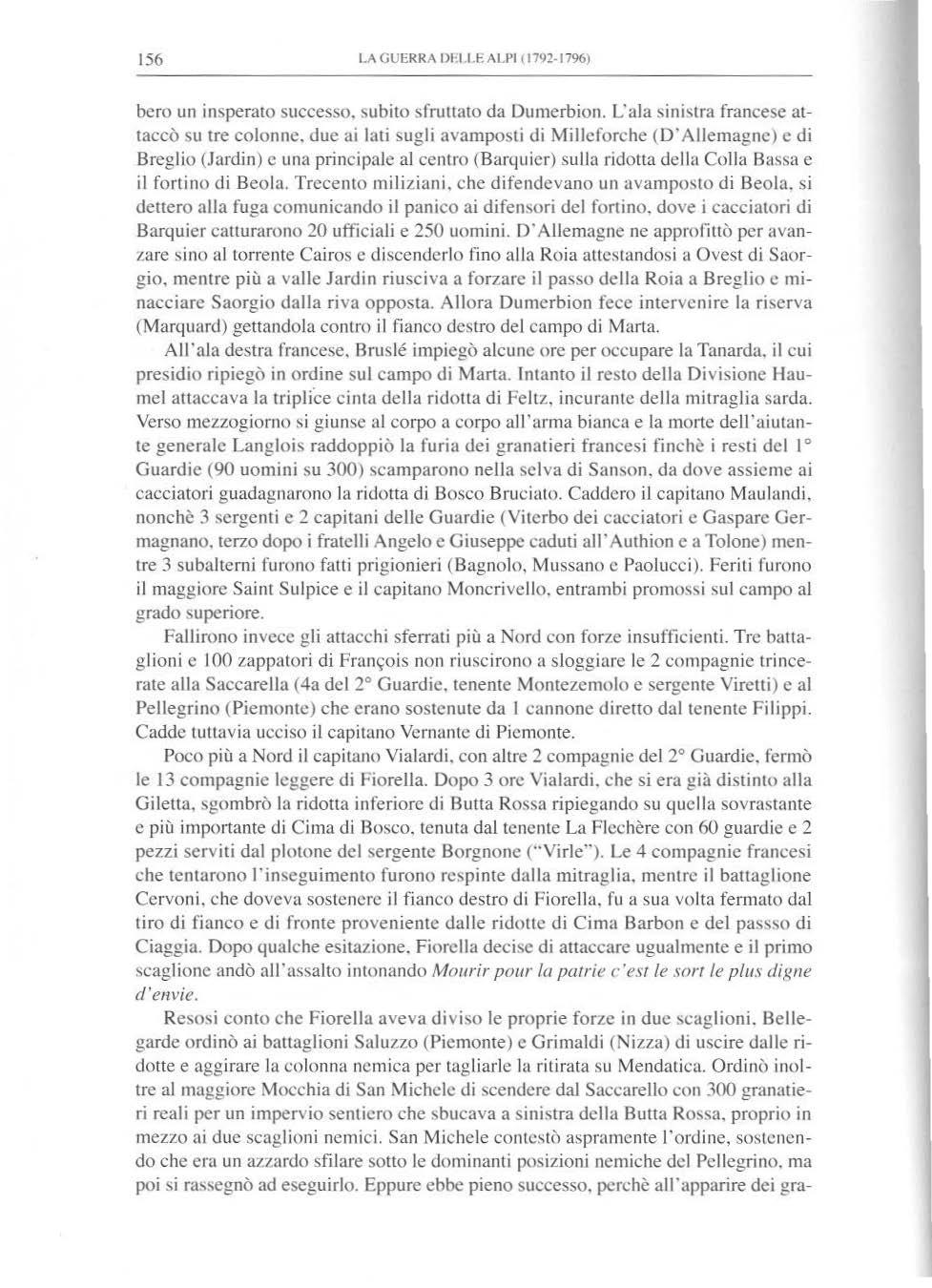 Se il silenzio delle grandi scuole non sorprende, occorre spiegare quello della piccola scuola degli storici militari, in particolare italiani. Infatti la memoria della guerra 1792-96 è stata tramandata soltanto in modo frammentario, attraverso la tradizione sabauda o attraverso la storia delle gue rre napolconichc o della guerra di montagna. È a quest'ultima che l a guerra del 1792-96 deve anzi un nome, sia pure riduttivo: quello cioè di "guerra delle Alpi" È lo stesso nome attribuito dai francesi a ll ' Armata che inizialmente formarono contro il Piemonte. ma dalla quale si distaccò presto un'altra Armata autonoma, detta prima ·'del Varo", e poi, in co nseg uen za della manovra dell'aprile 1794, "d'ltalia". Armata straniera, bcnchè poi integrata da piccole legioni italiane: ma a buon diritto portava quel nome. perchè così tanta pane ebbe nel determinare. anc he nella lun ga durata. il destino e la cultura della società dello stato e della milizia italiani.