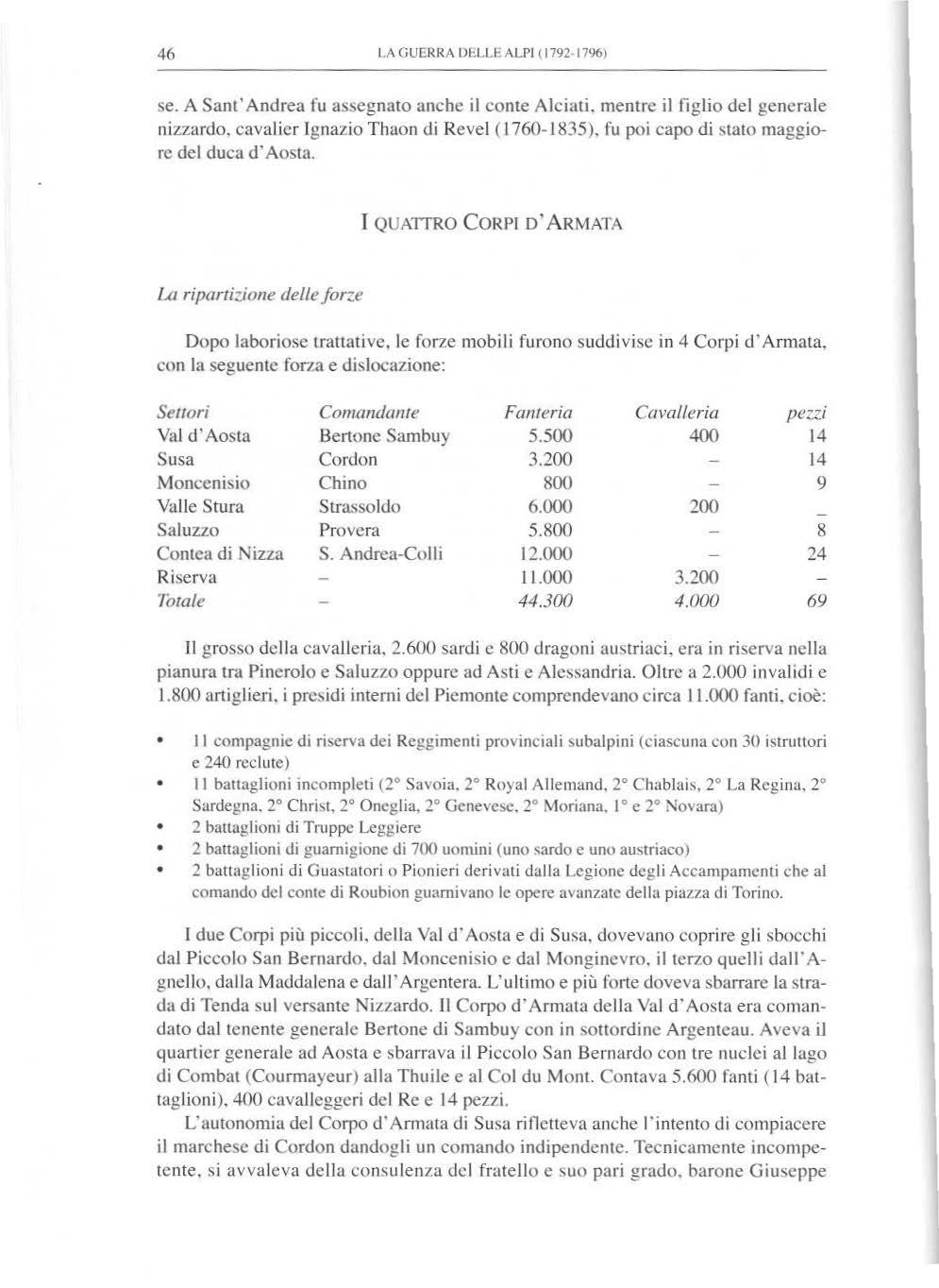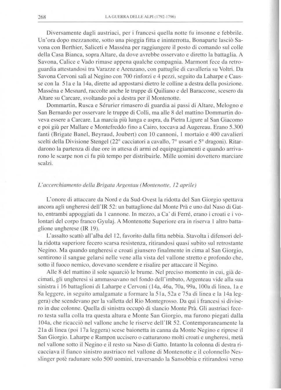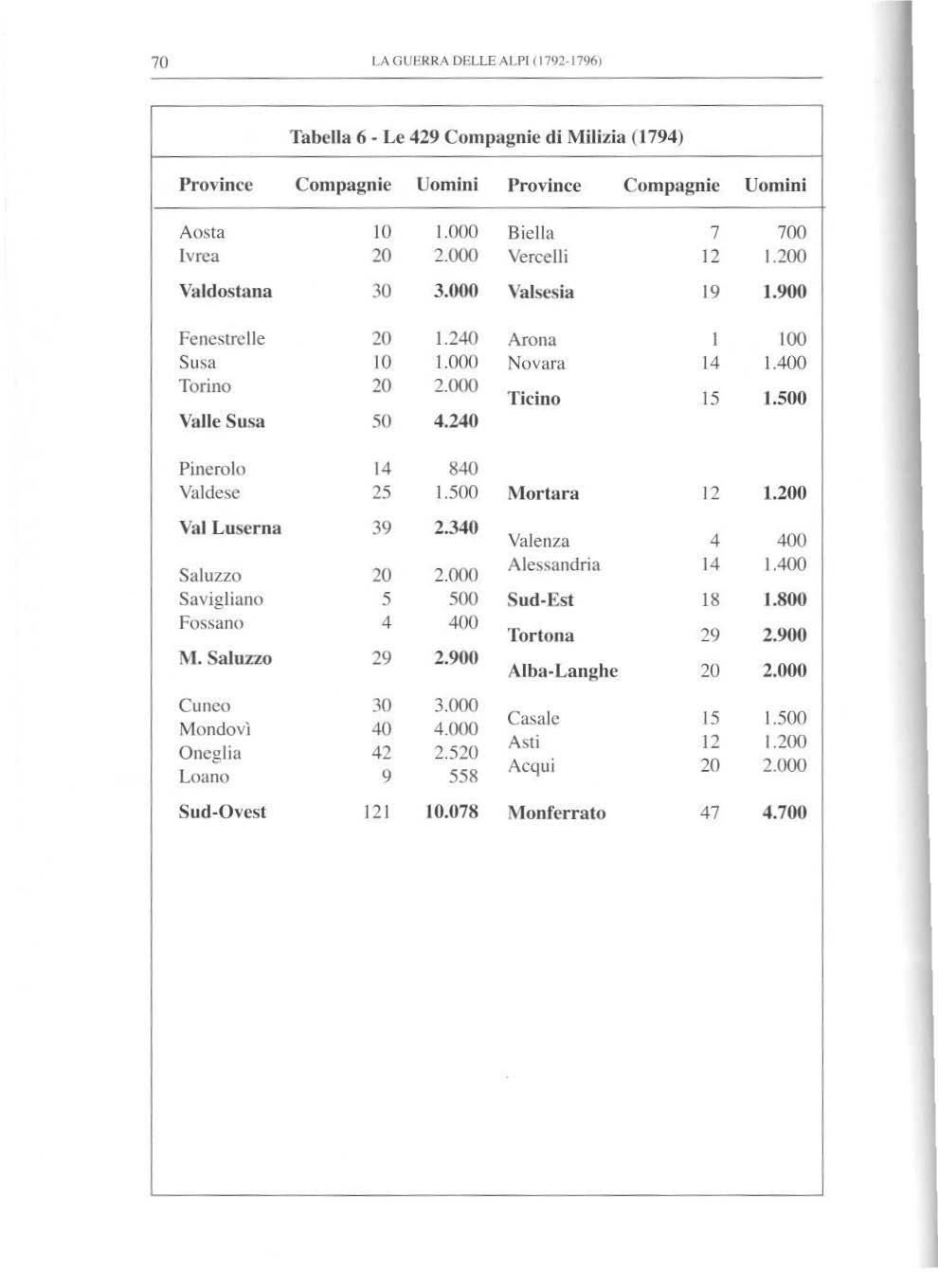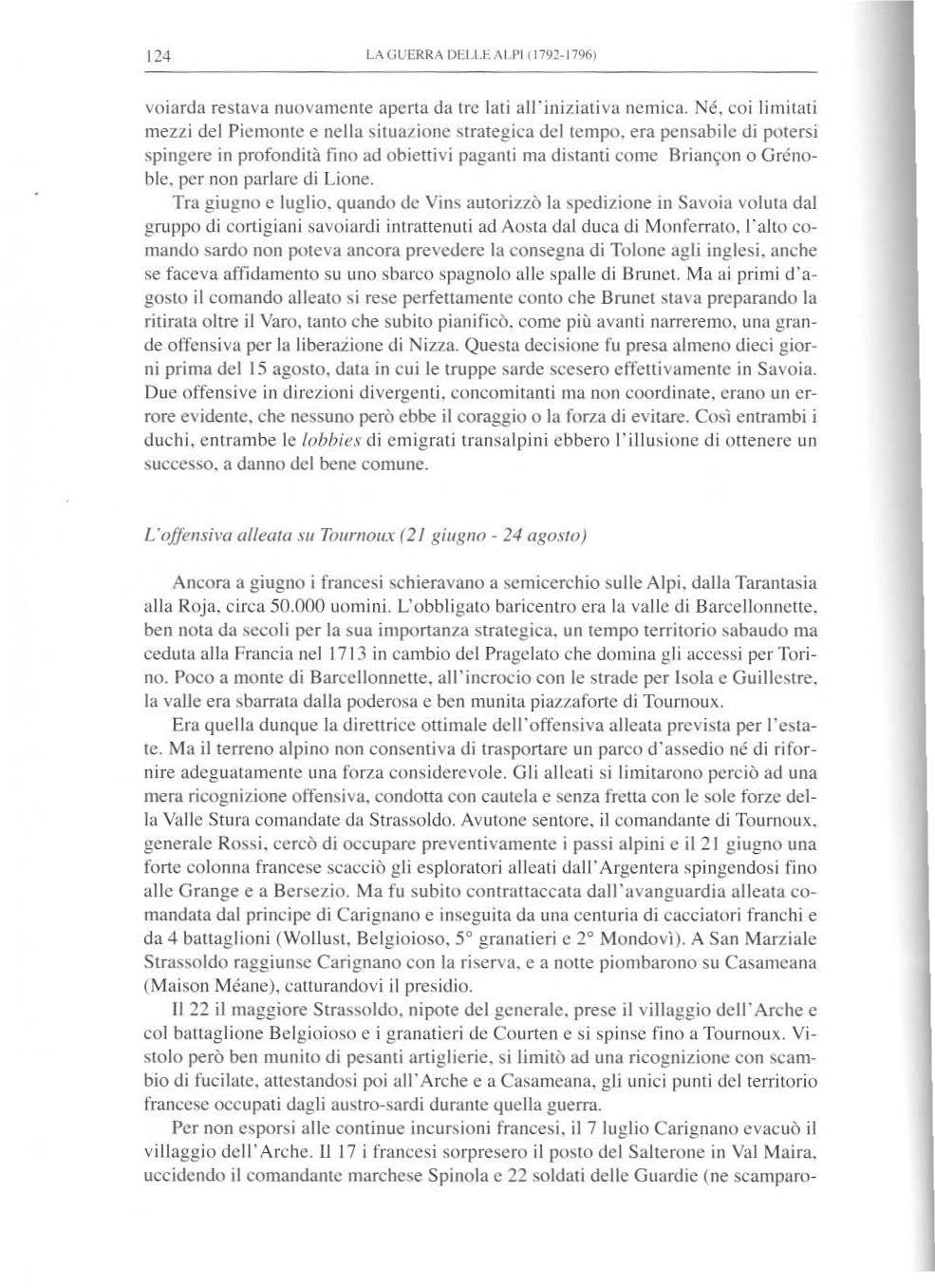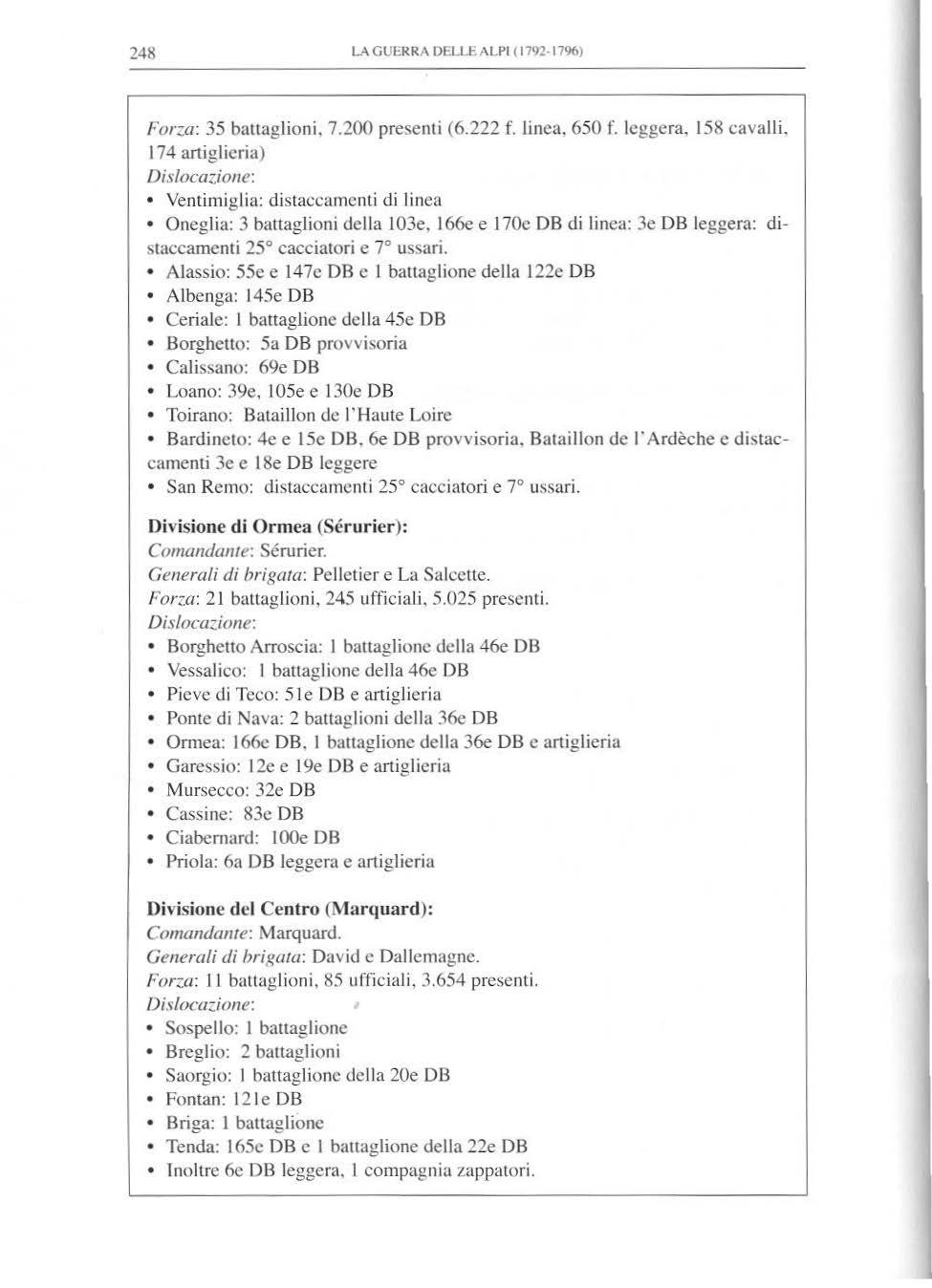 Se il silenzio delle grandi scuole non sorprende, occorre spiegare quello della piccola scuola degli storici militari, in particolare italiani. Infatti la memoria della guerra 1792-96 è stata tramandata soltanto in modo frammentario, attraverso la tradizione sabauda o attraverso la storia delle gue rre napolconichc o della guerra di montagna. È a quest'ultima che l a guerra del 1792-96 deve anzi un nome, sia pure riduttivo: quello cioè di "guerra delle Alpi" È lo stesso nome attribuito dai francesi a ll ' Armata che inizialmente formarono contro il Piemonte. ma dalla quale si distaccò presto un'altra Armata autonoma, detta prima ·'del Varo", e poi, in co nseg uen za della manovra dell'aprile 1794, "d'ltalia". Armata straniera, bcnchè poi integrata da piccole legioni italiane: ma a buon diritto portava quel nome. perchè così tanta pane ebbe nel determinare. anc he nella lun ga durata. il destino e la cultura della società dello stato e della milizia italiani.