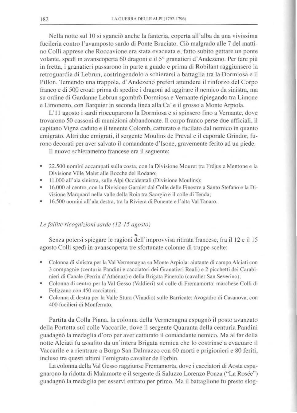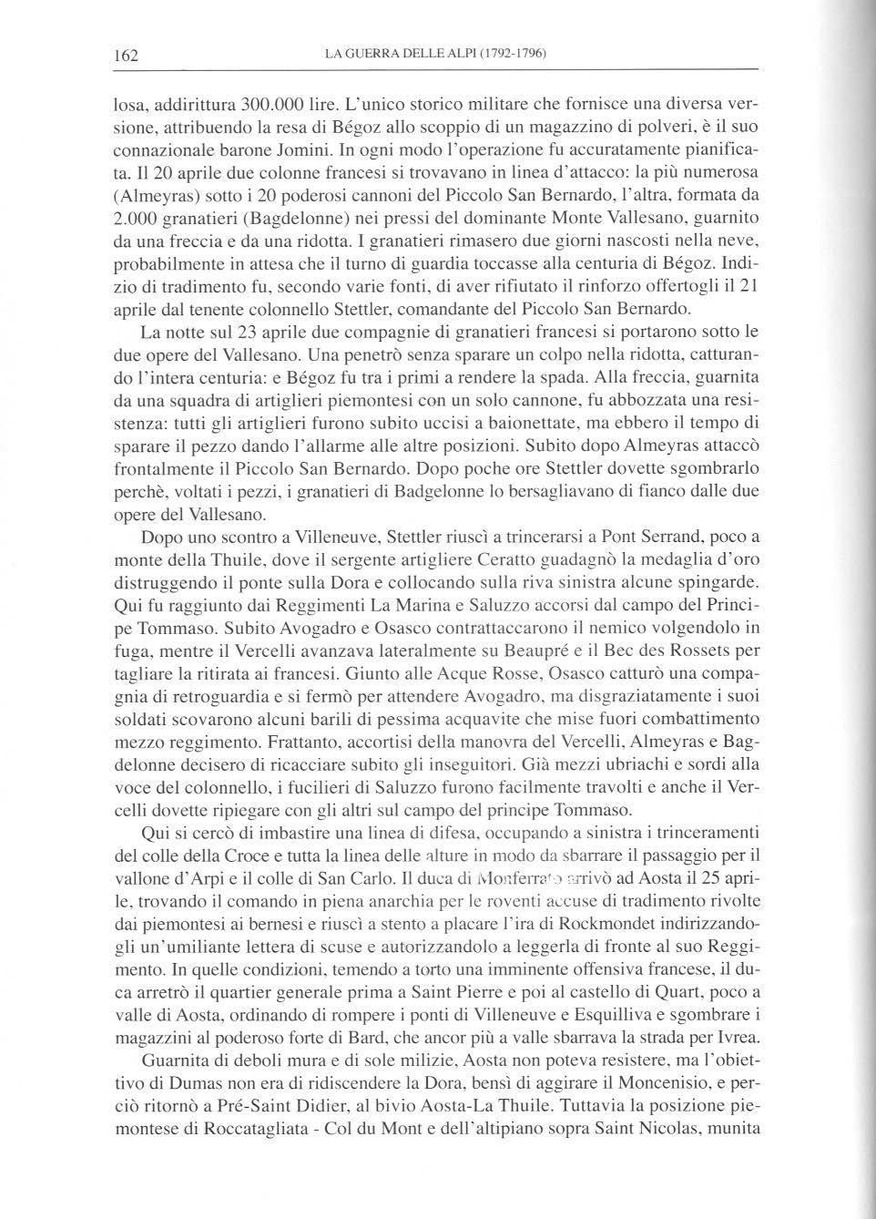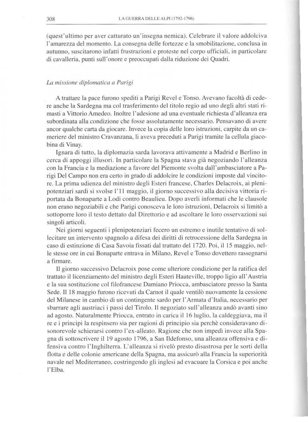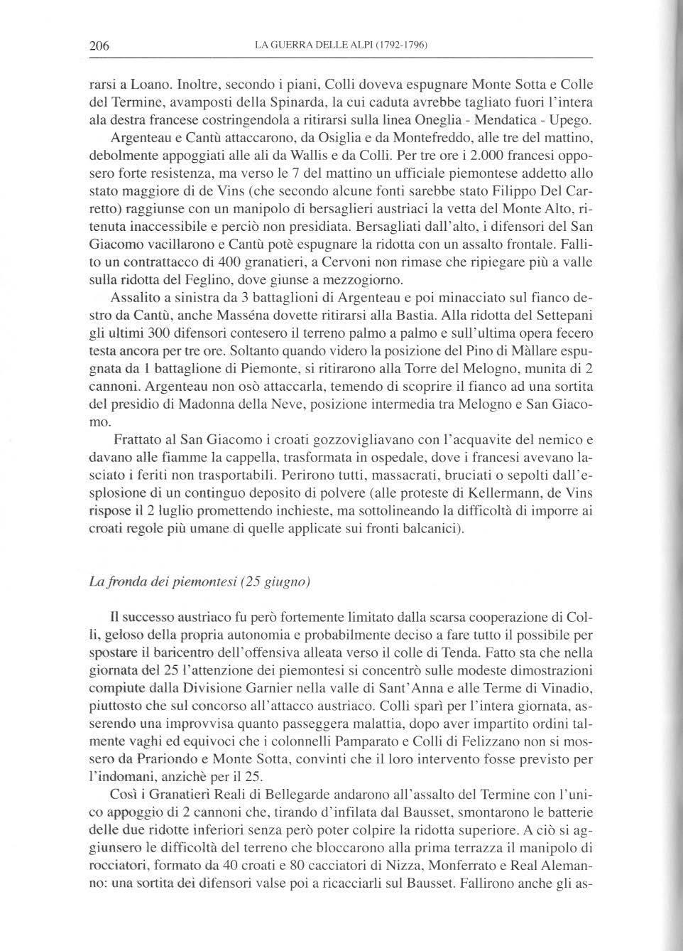 Se il silenzio delle grandi scuole non sorprende, occorre spiegare quello della piccola scuola degli storici militari, in particolare italiani. Infatti la memoria della guerra 1792-96 è stata tramandata soltanto in modo frammentario, attraverso la tradizione sabauda o attraverso la storia delle gue rre napolconichc o della guerra di montagna. È a quest'ultima che l a guerra del 1792-96 deve anzi un nome, sia pure riduttivo: quello cioè di "guerra delle Alpi" È lo stesso nome attribuito dai francesi a ll ' Armata che inizialmente formarono contro il Piemonte. ma dalla quale si distaccò presto un'altra Armata autonoma, detta prima ·'del Varo", e poi, in co nseg uen za della manovra dell'aprile 1794, "d'ltalia". Armata straniera, bcnchè poi integrata da piccole legioni italiane: ma a buon diritto portava quel nome. perchè così tanta pane ebbe nel determinare. anc he nella lun ga durata. il destino e la cultura della società dello stato e della milizia italiani.