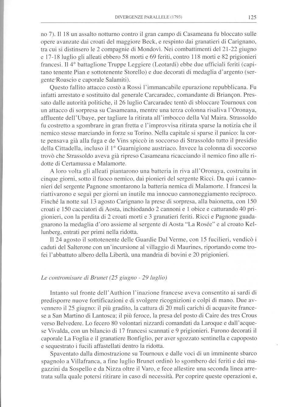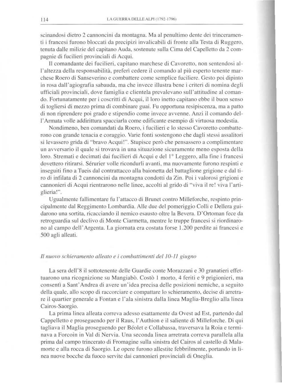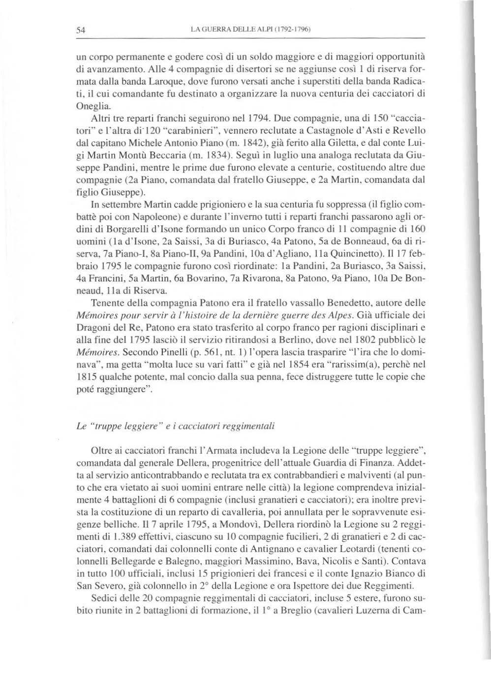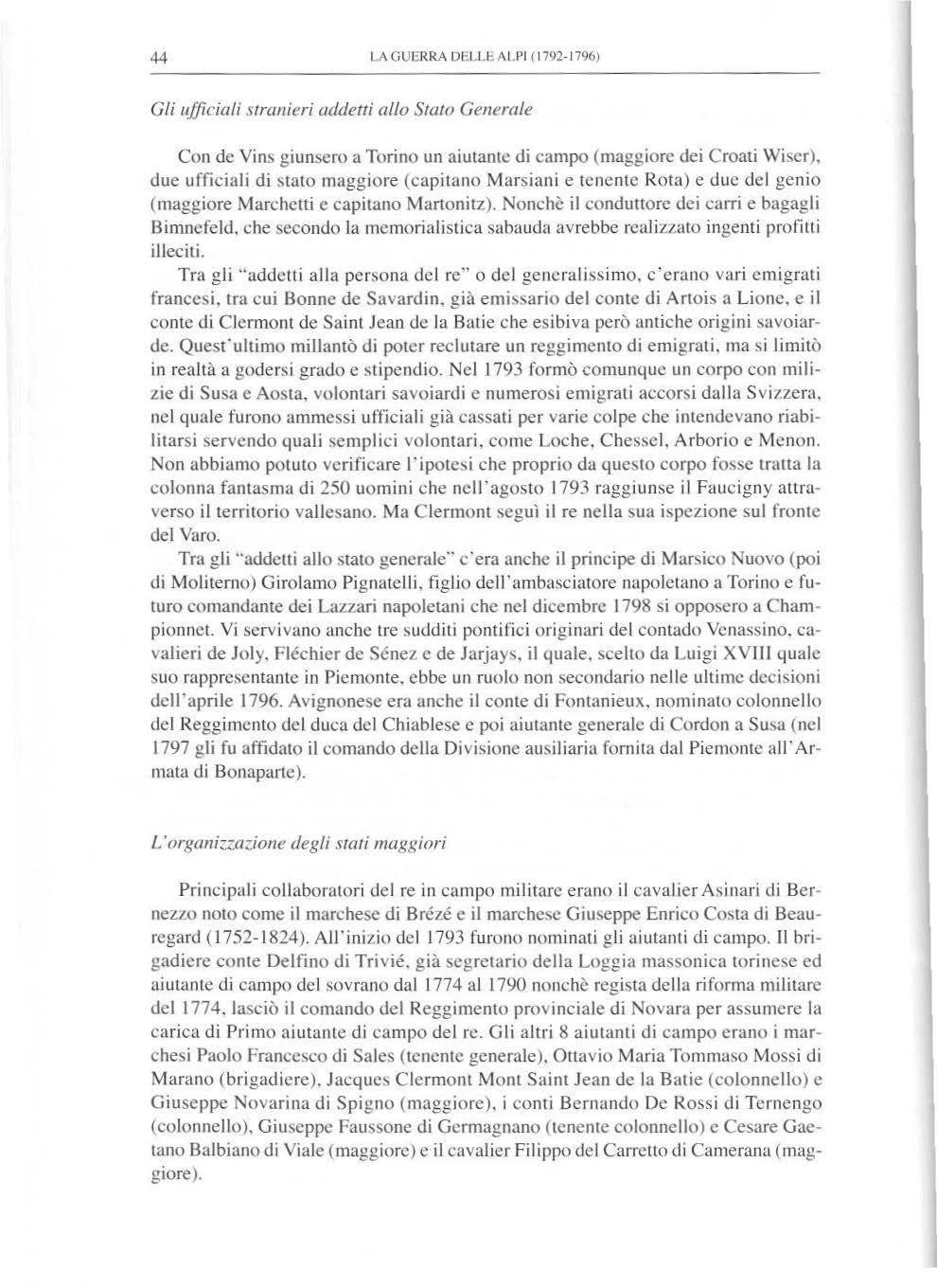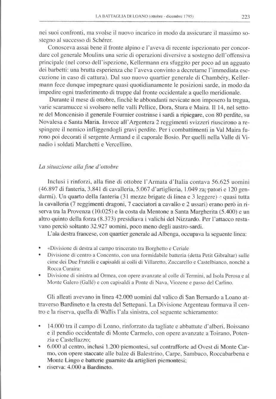 Se il silenzio delle grandi scuole non sorprende, occorre spiegare quello della piccola scuola degli storici militari, in particolare italiani. Infatti la memoria della guerra 1792-96 è stata tramandata soltanto in modo frammentario, attraverso la tradizione sabauda o attraverso la storia delle gue rre napolconichc o della guerra di montagna. È a quest'ultima che l a guerra del 1792-96 deve anzi un nome, sia pure riduttivo: quello cioè di "guerra delle Alpi" È lo stesso nome attribuito dai francesi a ll ' Armata che inizialmente formarono contro il Piemonte. ma dalla quale si distaccò presto un'altra Armata autonoma, detta prima ·'del Varo", e poi, in co nseg uen za della manovra dell'aprile 1794, "d'ltalia". Armata straniera, bcnchè poi integrata da piccole legioni italiane: ma a buon diritto portava quel nome. perchè così tanta pane ebbe nel determinare. anc he nella lun ga durata. il destino e la cultura della società dello stato e della milizia italiani.