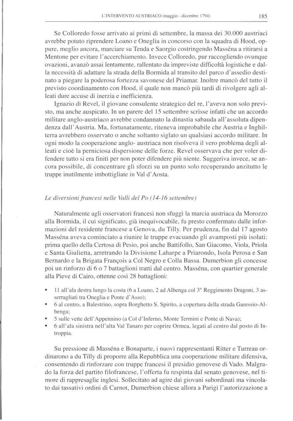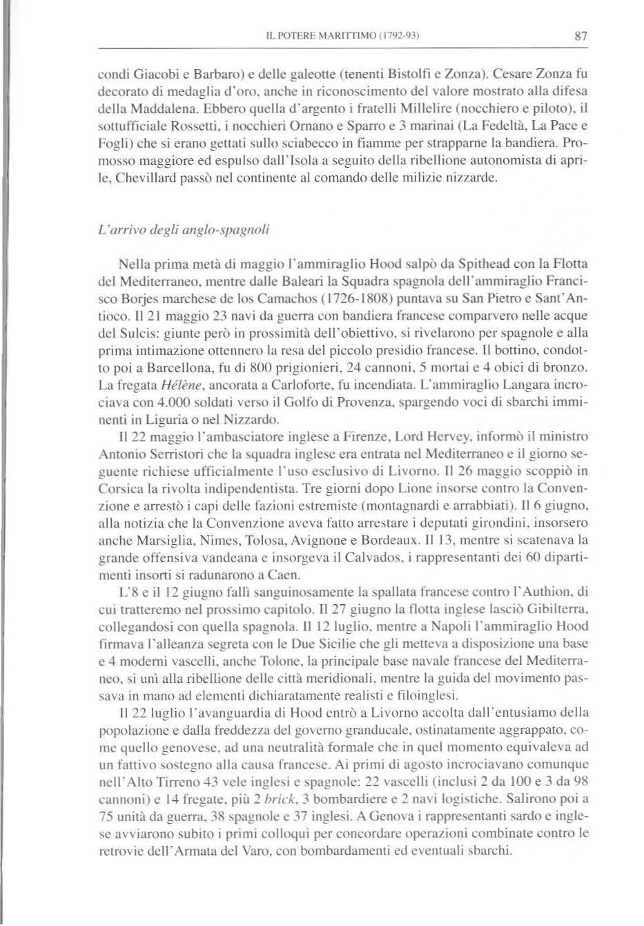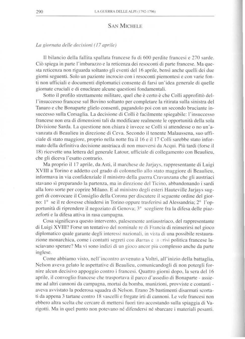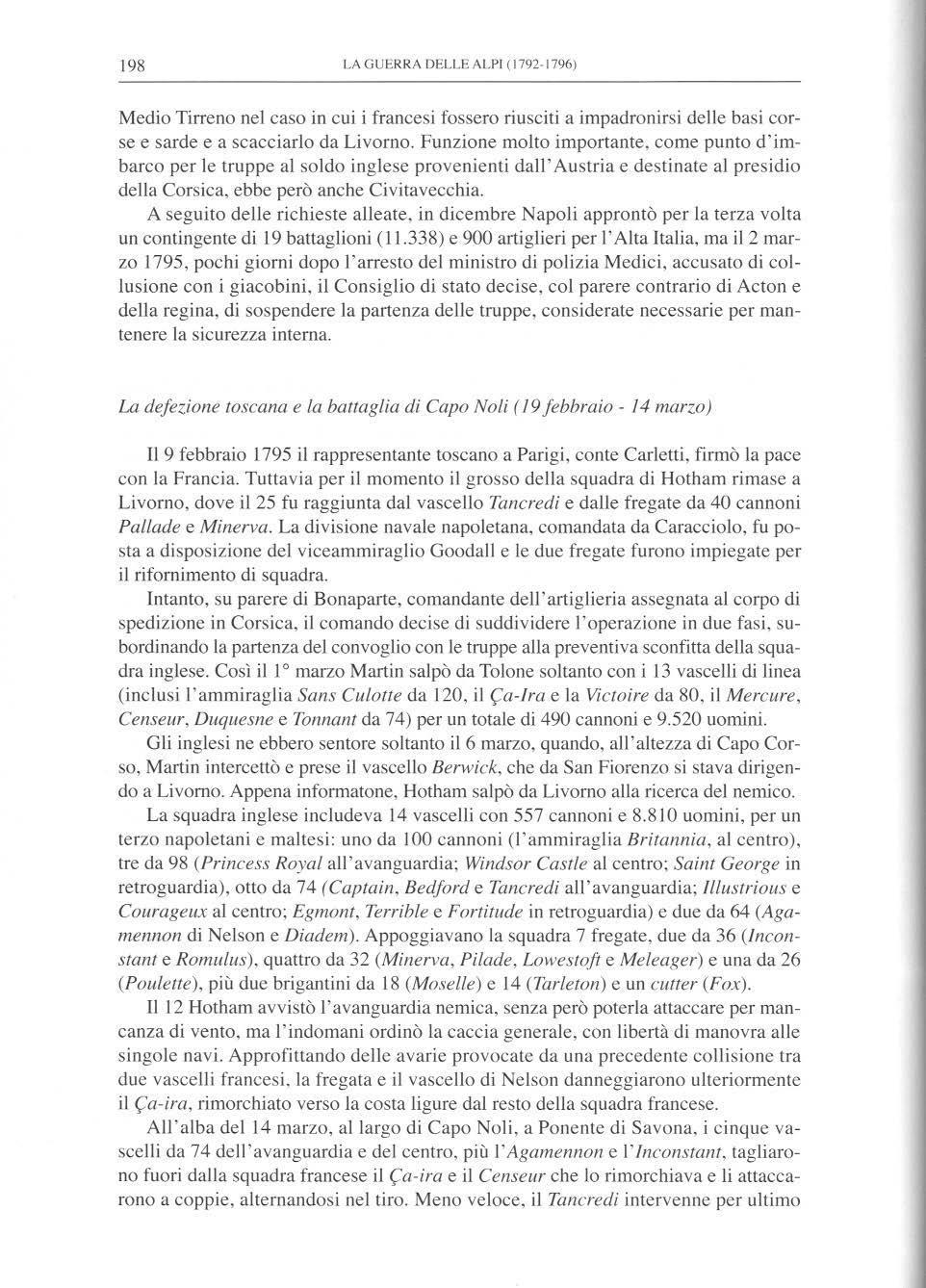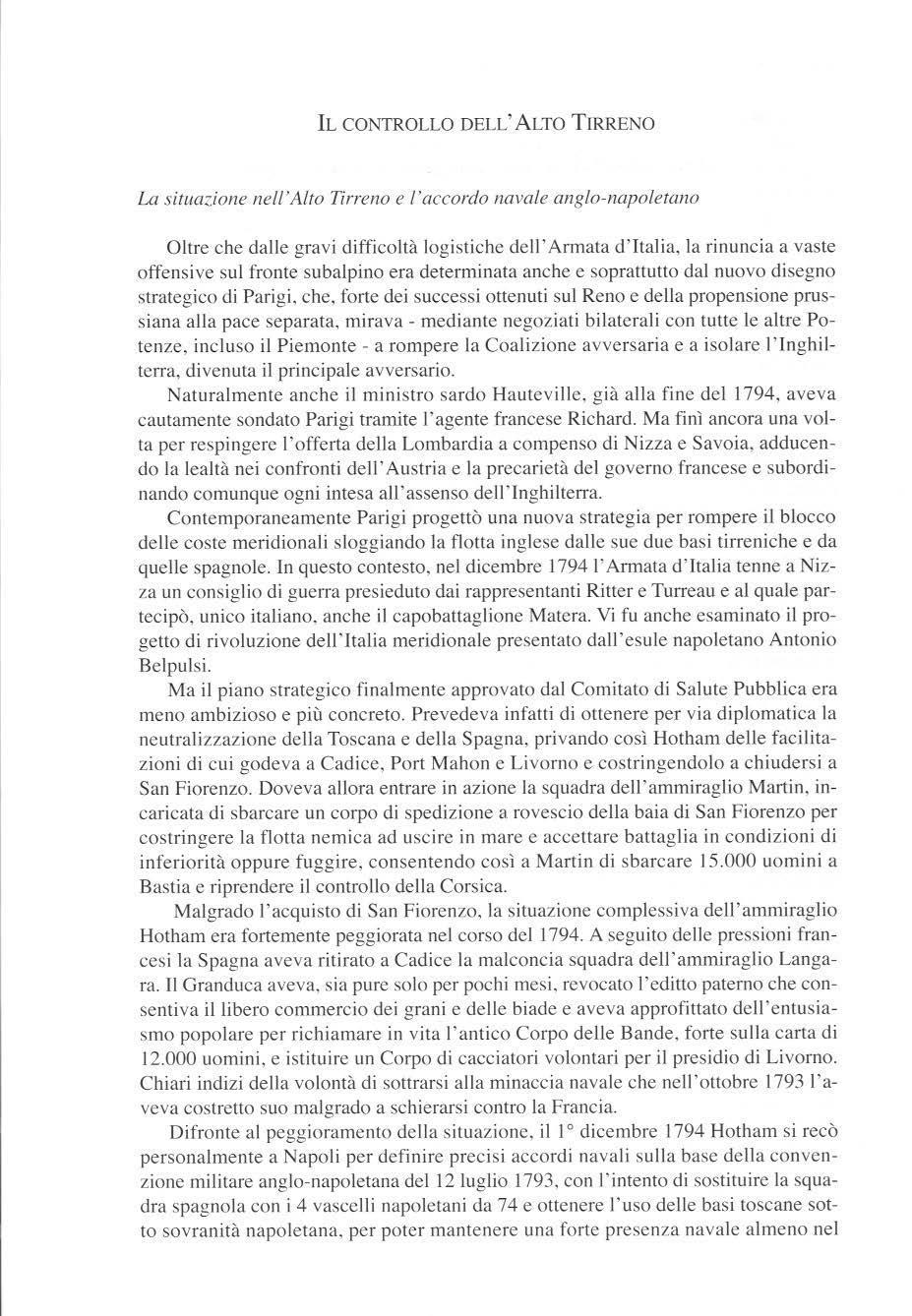 Per varie ragioni discusse nellll capitolo, l'occasione di unificare il fronte marittimo c quello alpino in un unico teatro operativo interalleato sfumò nel settembre 1793, né in seguito si ripresentò. neppure quando il generale Masséna spostò il baricentro militare di quella guerra dalle Alpi alla Riviera di Ponente e alle vallate de l Tanaro e della Bormida. Nello stesso capitolo cerchiamo di spiegare le ragioni per le quali lo studio delle operazioni navali e marittime svoltesi in Mediterraneo prima della battaglia di Aboukir sia stato finora così negletto anche nell'ambito specialistico della s toria navale. Fatto ..:he ha negativamente condizionato lo stesso Pinelli, mentre la nostra ricerca ci ha convinti che è impossibile comprendere appieno il significato e le ragioni delle operaz ioni alpine senza riferirle costantemente e puntualmente agli sviluppi sul fronte marittimo.