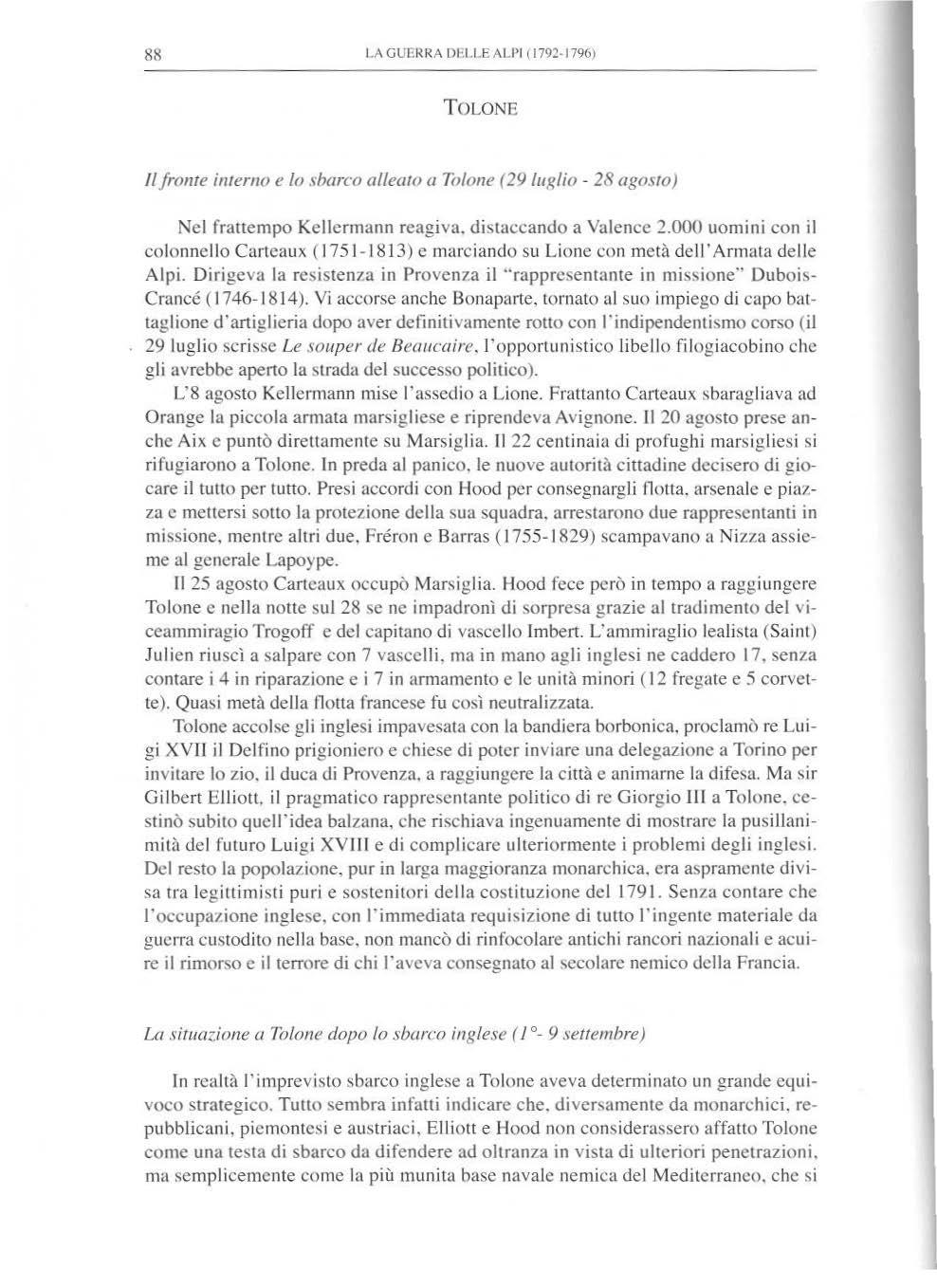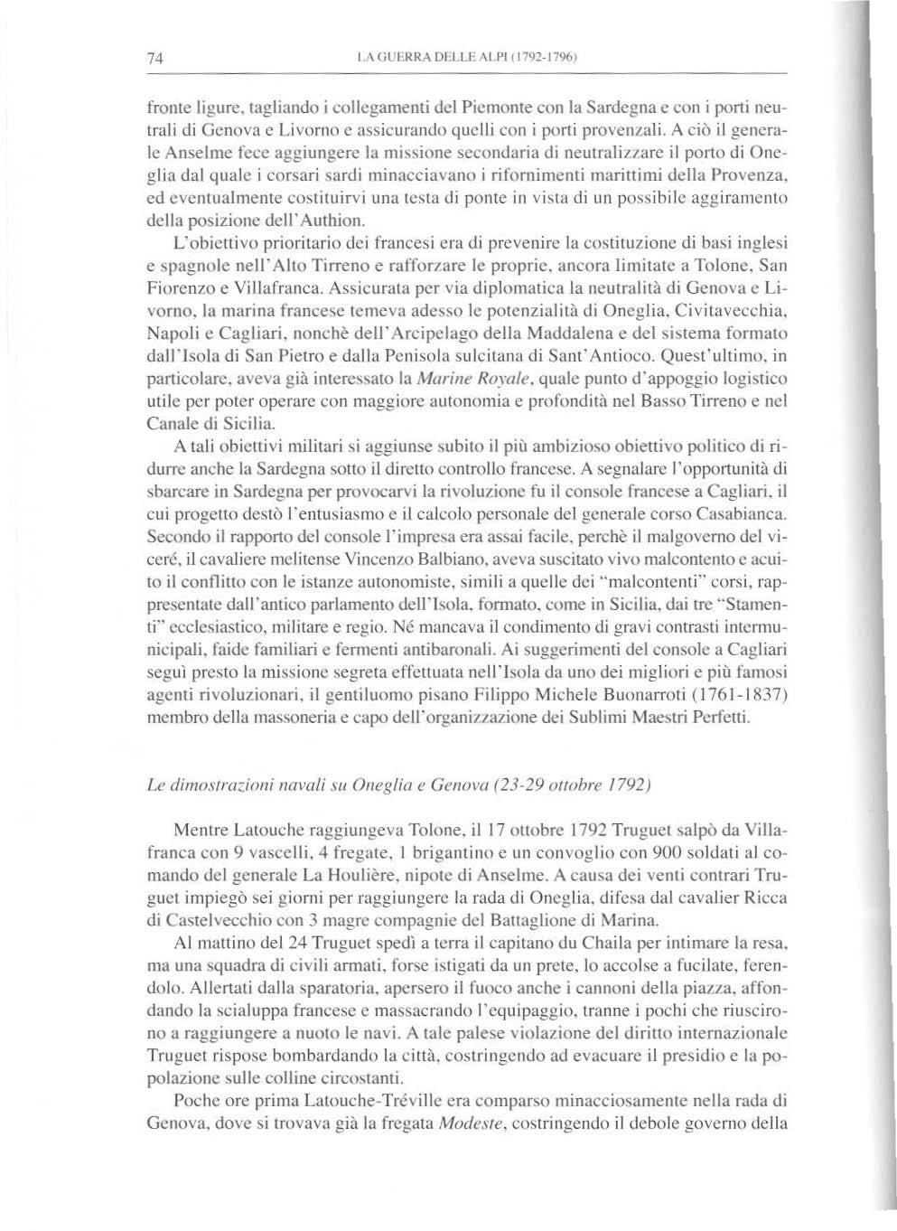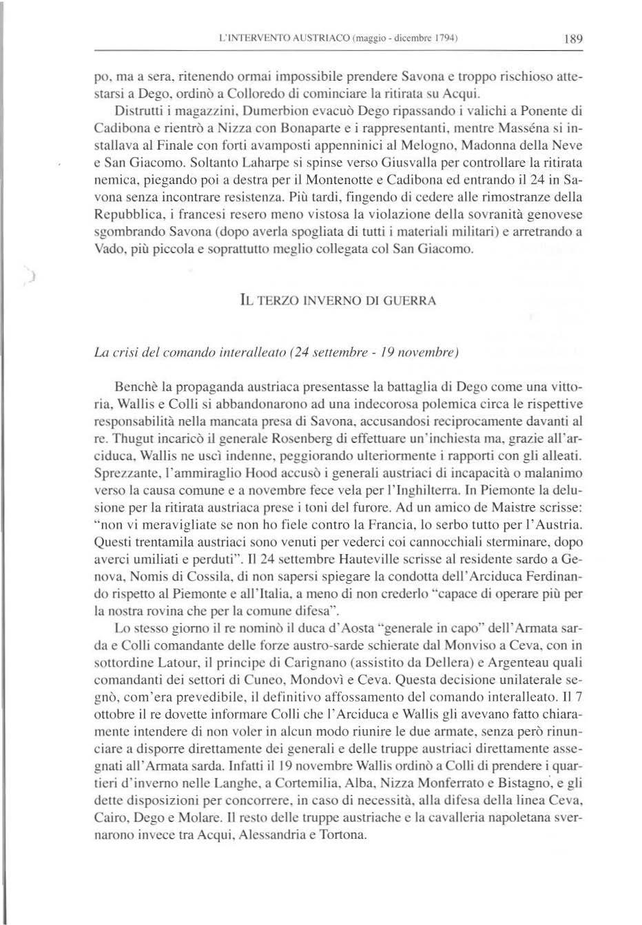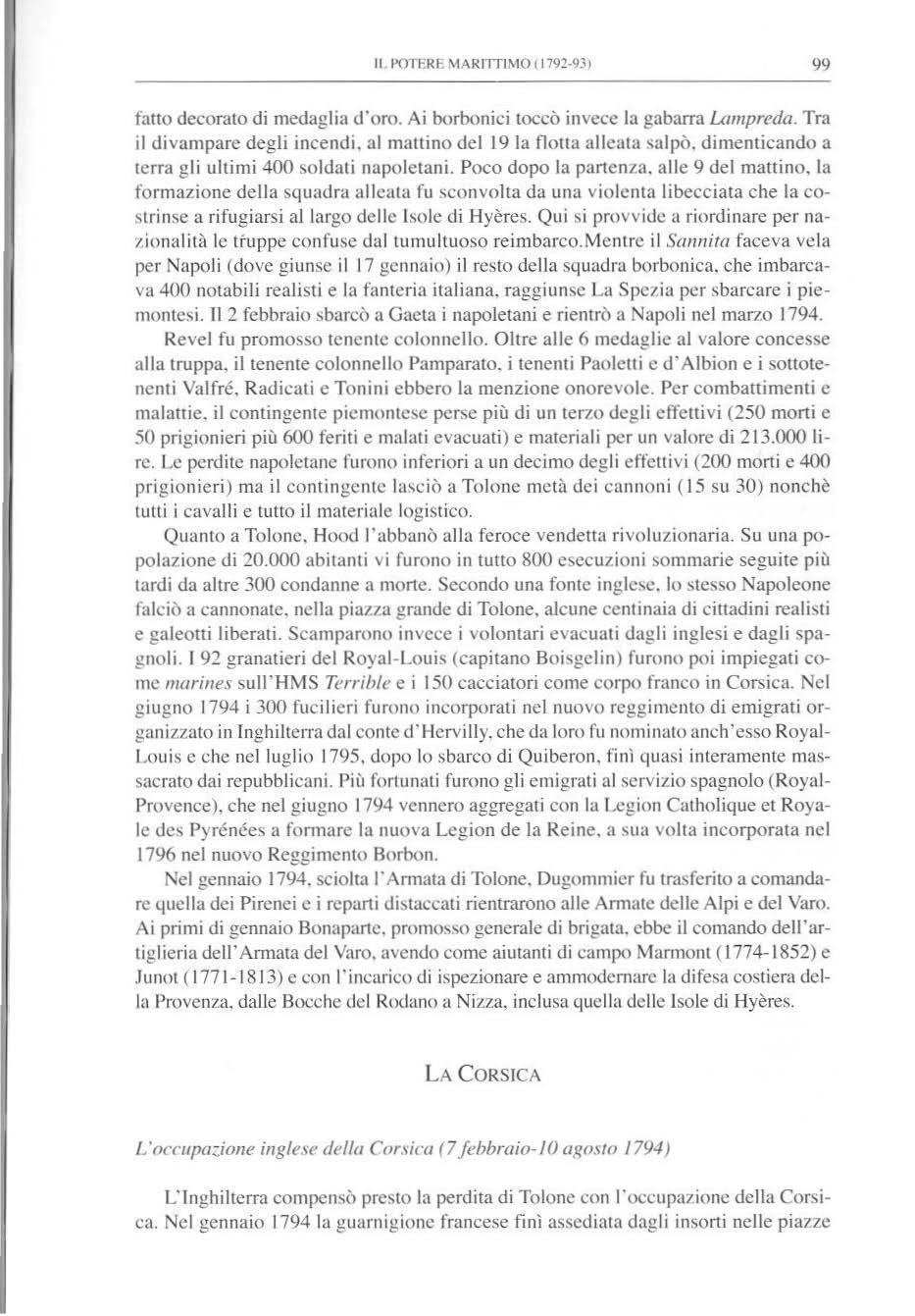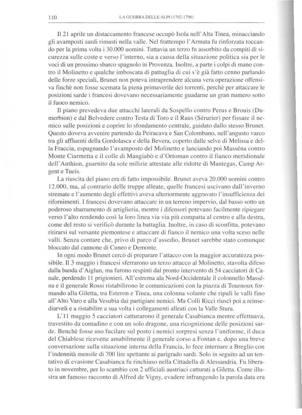 Per varie ragioni discusse nellll capitolo, l'occasione di unificare il fronte marittimo c quello alpino in un unico teatro operativo interalleato sfumò nel settembre 1793, né in seguito si ripresentò. neppure quando il generale Masséna spostò il baricentro militare di quella guerra dalle Alpi alla Riviera di Ponente e alle vallate de l Tanaro e della Bormida. Nello stesso capitolo cerchiamo di spiegare le ragioni per le quali lo studio delle operazioni navali e marittime svoltesi in Mediterraneo prima della battaglia di Aboukir sia stato finora così negletto anche nell'ambito specialistico della s toria navale. Fatto ..:he ha negativamente condizionato lo stesso Pinelli, mentre la nostra ricerca ci ha convinti che è impossibile comprendere appieno il significato e le ragioni delle operaz ioni alpine senza riferirle costantemente e puntualmente agli sviluppi sul fronte marittimo.