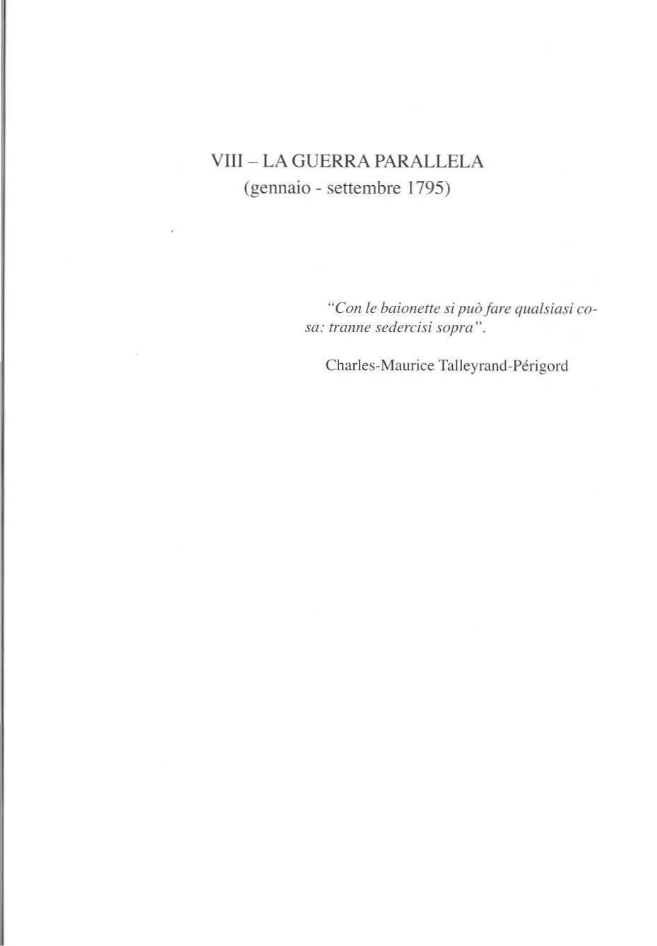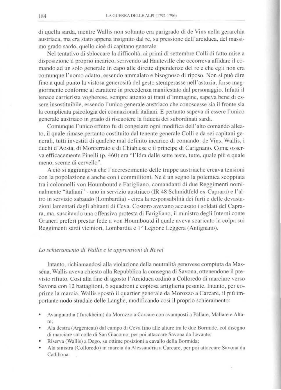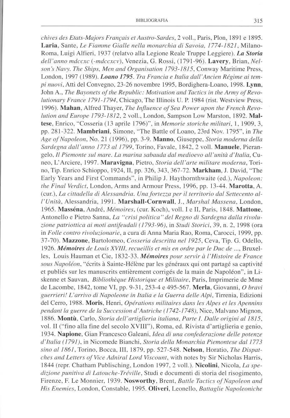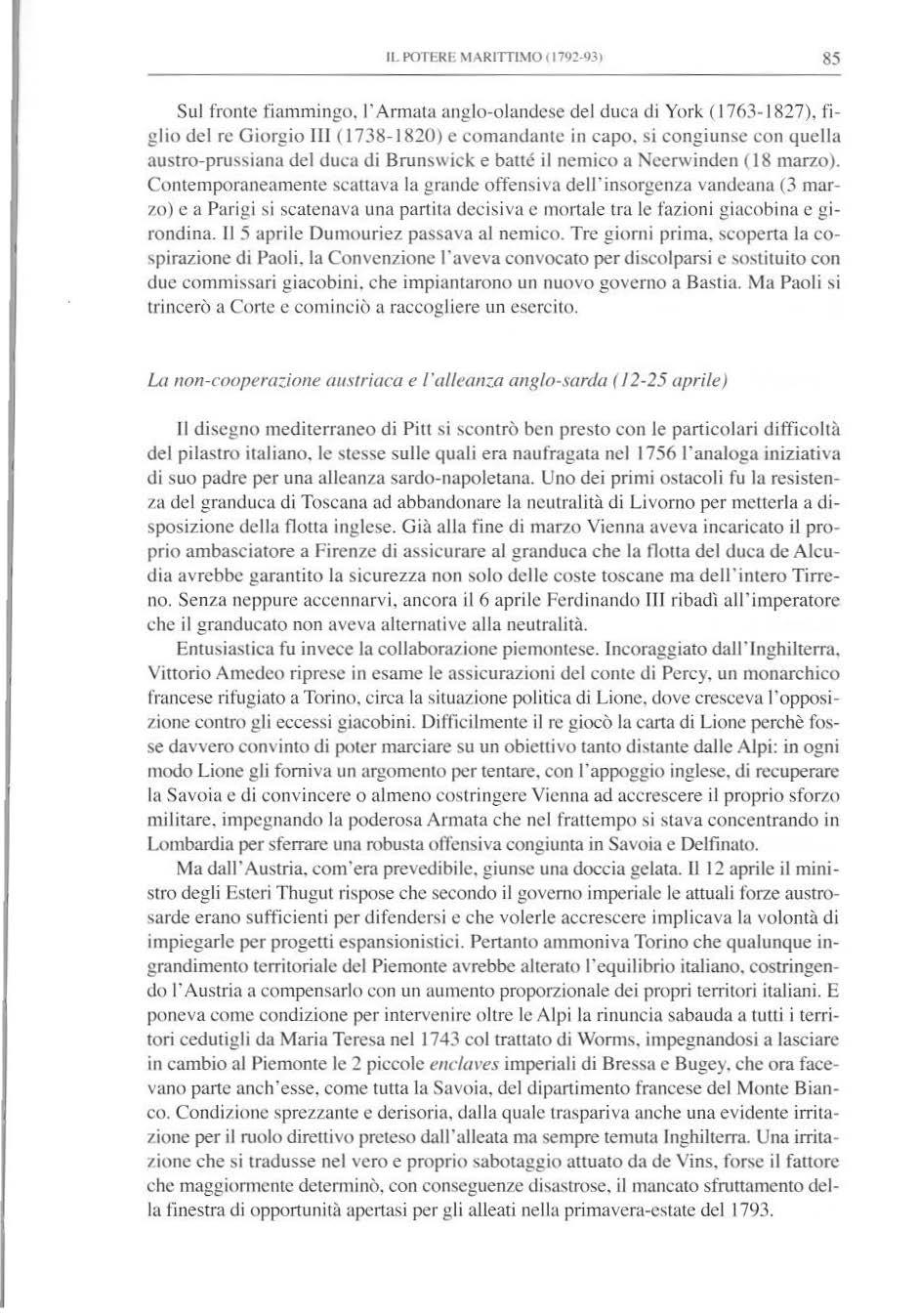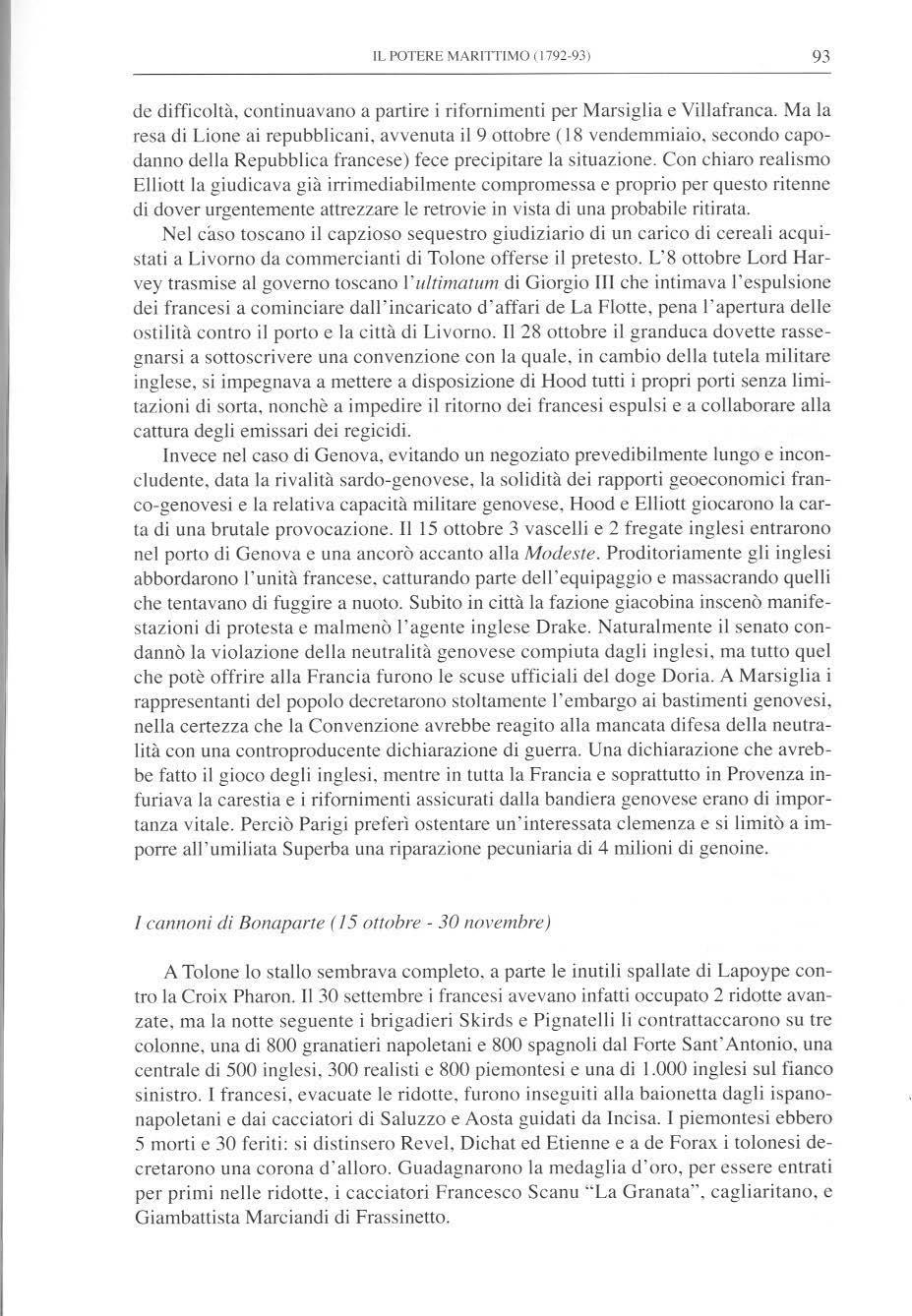 Per varie ragioni discusse nellll capitolo, l'occasione di unificare il fronte marittimo c quello alpino in un unico teatro operativo interalleato sfumò nel settembre 1793, né in seguito si ripresentò. neppure quando il generale Masséna spostò il baricentro militare di quella guerra dalle Alpi alla Riviera di Ponente e alle vallate de l Tanaro e della Bormida. Nello stesso capitolo cerchiamo di spiegare le ragioni per le quali lo studio delle operazioni navali e marittime svoltesi in Mediterraneo prima della battaglia di Aboukir sia stato finora così negletto anche nell'ambito specialistico della s toria navale. Fatto ..:he ha negativamente condizionato lo stesso Pinelli, mentre la nostra ricerca ci ha convinti che è impossibile comprendere appieno il significato e le ragioni delle operaz ioni alpine senza riferirle costantemente e puntualmente agli sviluppi sul fronte marittimo.