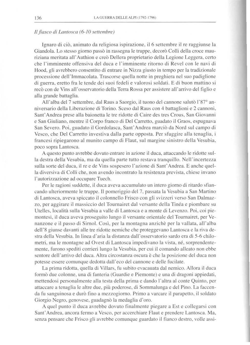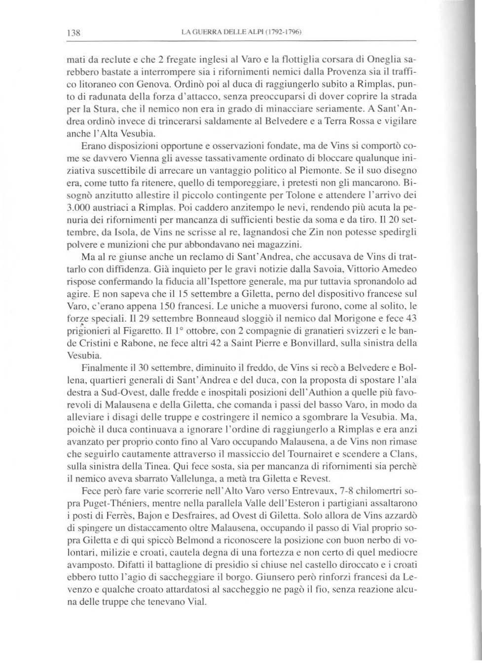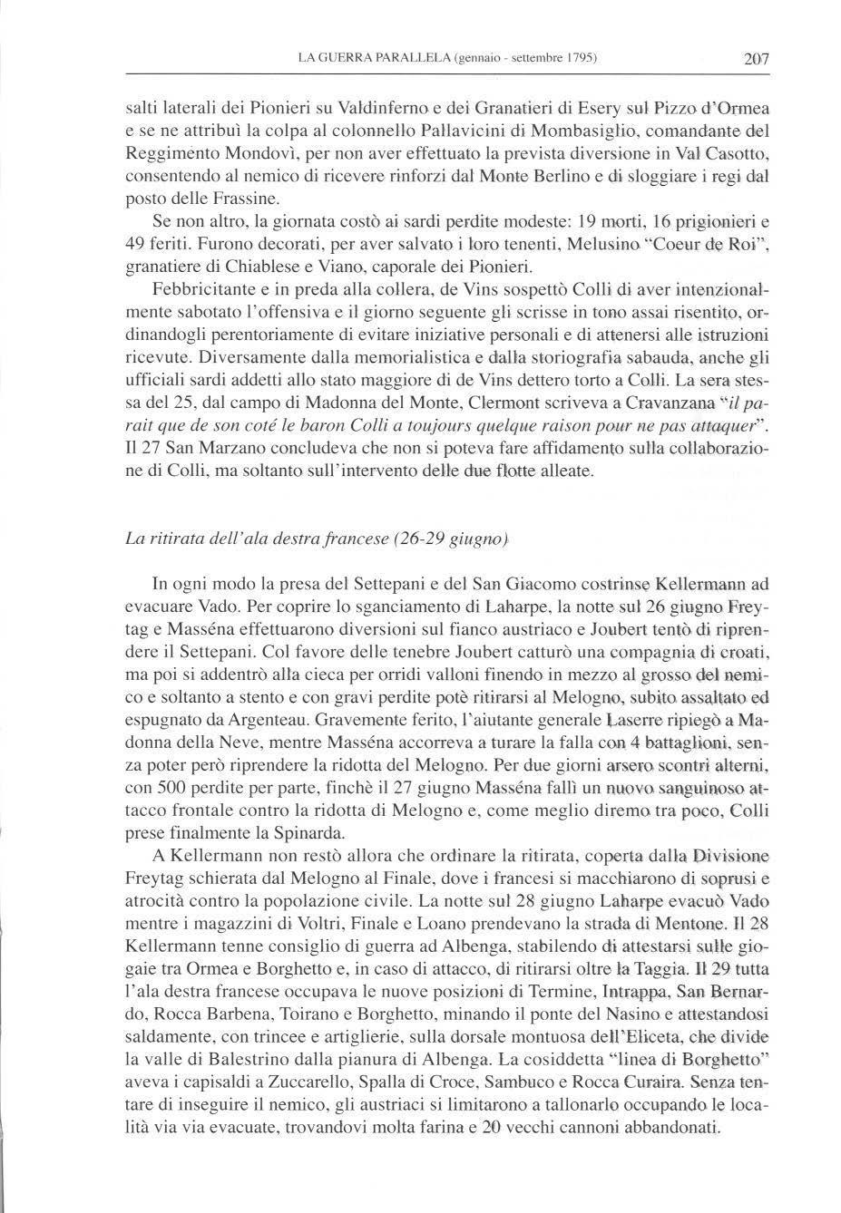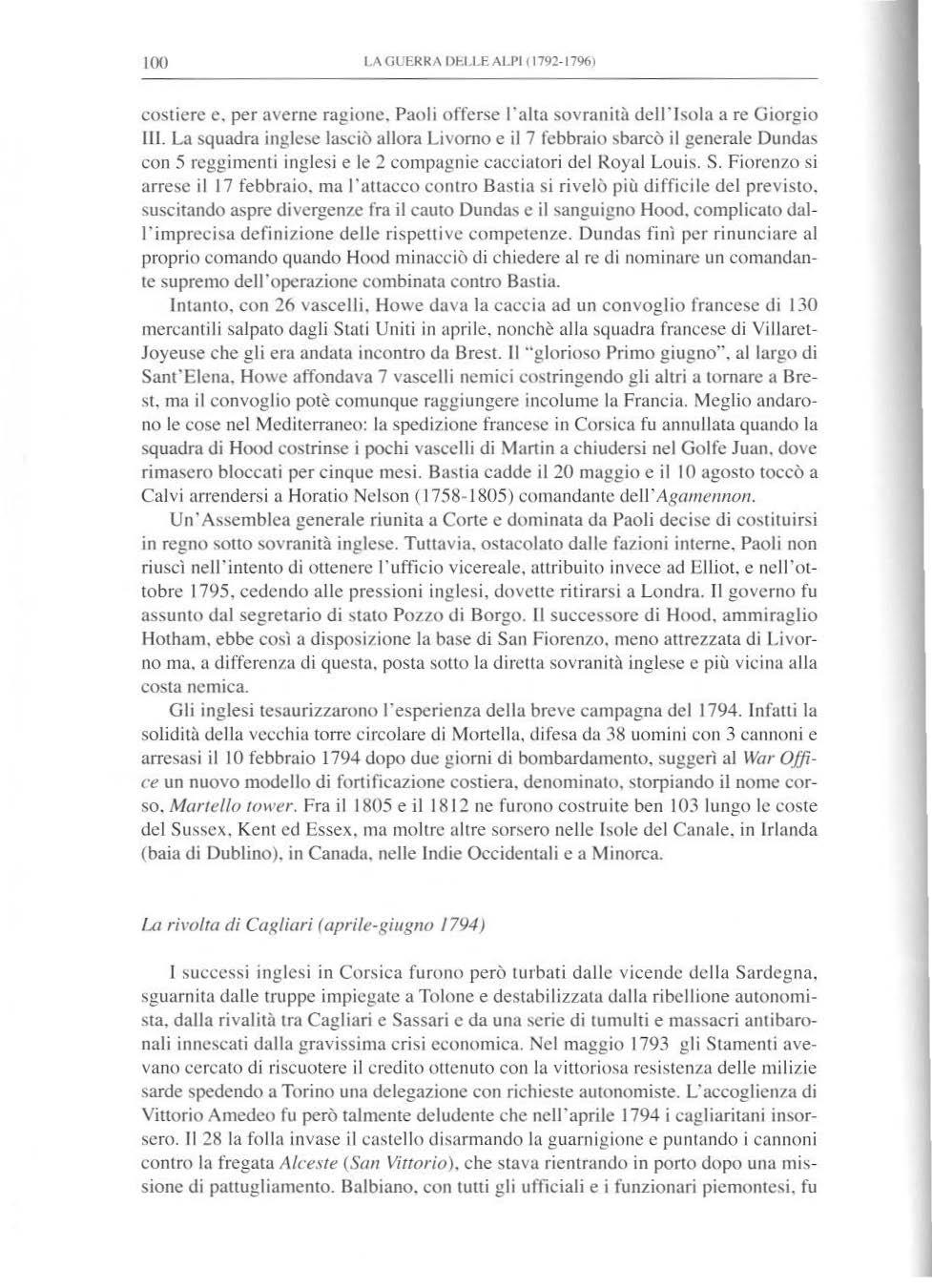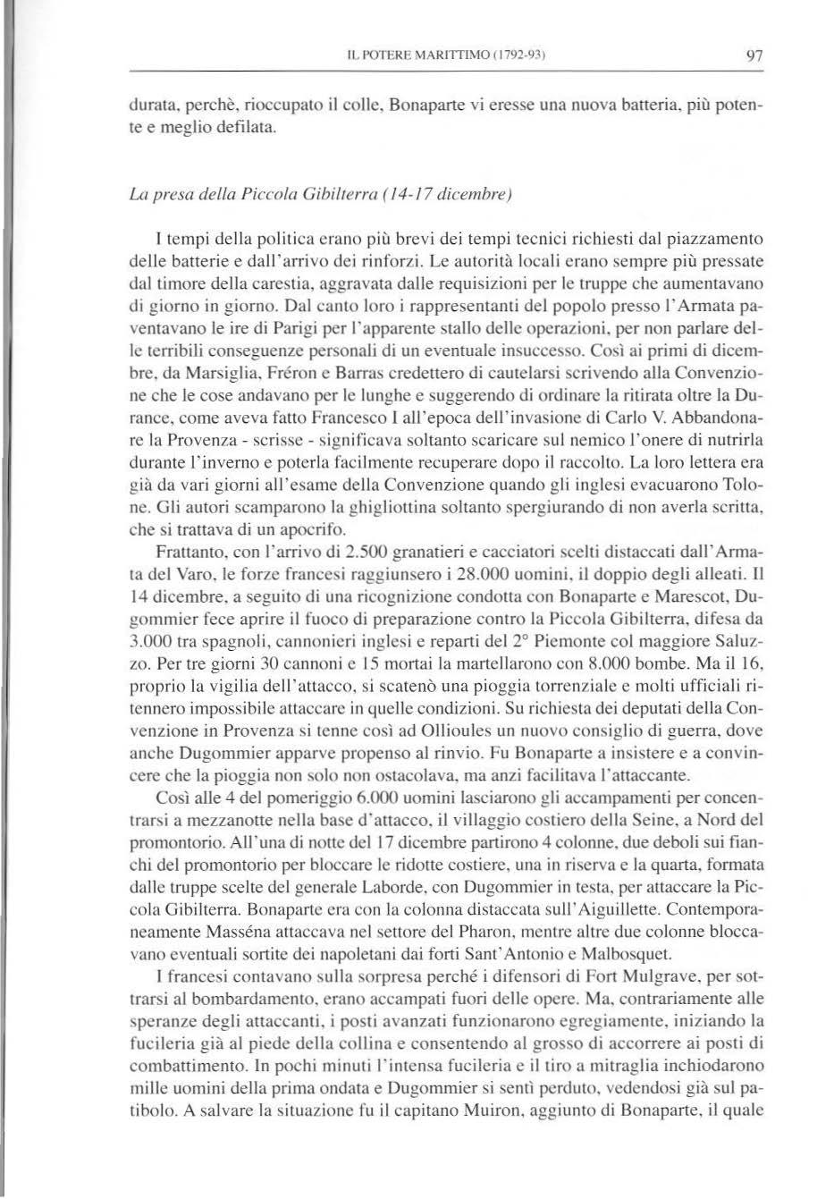 Per varie ragioni discusse nellll capitolo, l'occasione di unificare il fronte marittimo c quello alpino in un unico teatro operativo interalleato sfumò nel settembre 1793, né in seguito si ripresentò. neppure quando il generale Masséna spostò il baricentro militare di quella guerra dalle Alpi alla Riviera di Ponente e alle vallate de l Tanaro e della Bormida. Nello stesso capitolo cerchiamo di spiegare le ragioni per le quali lo studio delle operazioni navali e marittime svoltesi in Mediterraneo prima della battaglia di Aboukir sia stato finora così negletto anche nell'ambito specialistico della s toria navale. Fatto ..:he ha negativamente condizionato lo stesso Pinelli, mentre la nostra ricerca ci ha convinti che è impossibile comprendere appieno il significato e le ragioni delle operaz ioni alpine senza riferirle costantemente e puntualmente agli sviluppi sul fronte marittimo.