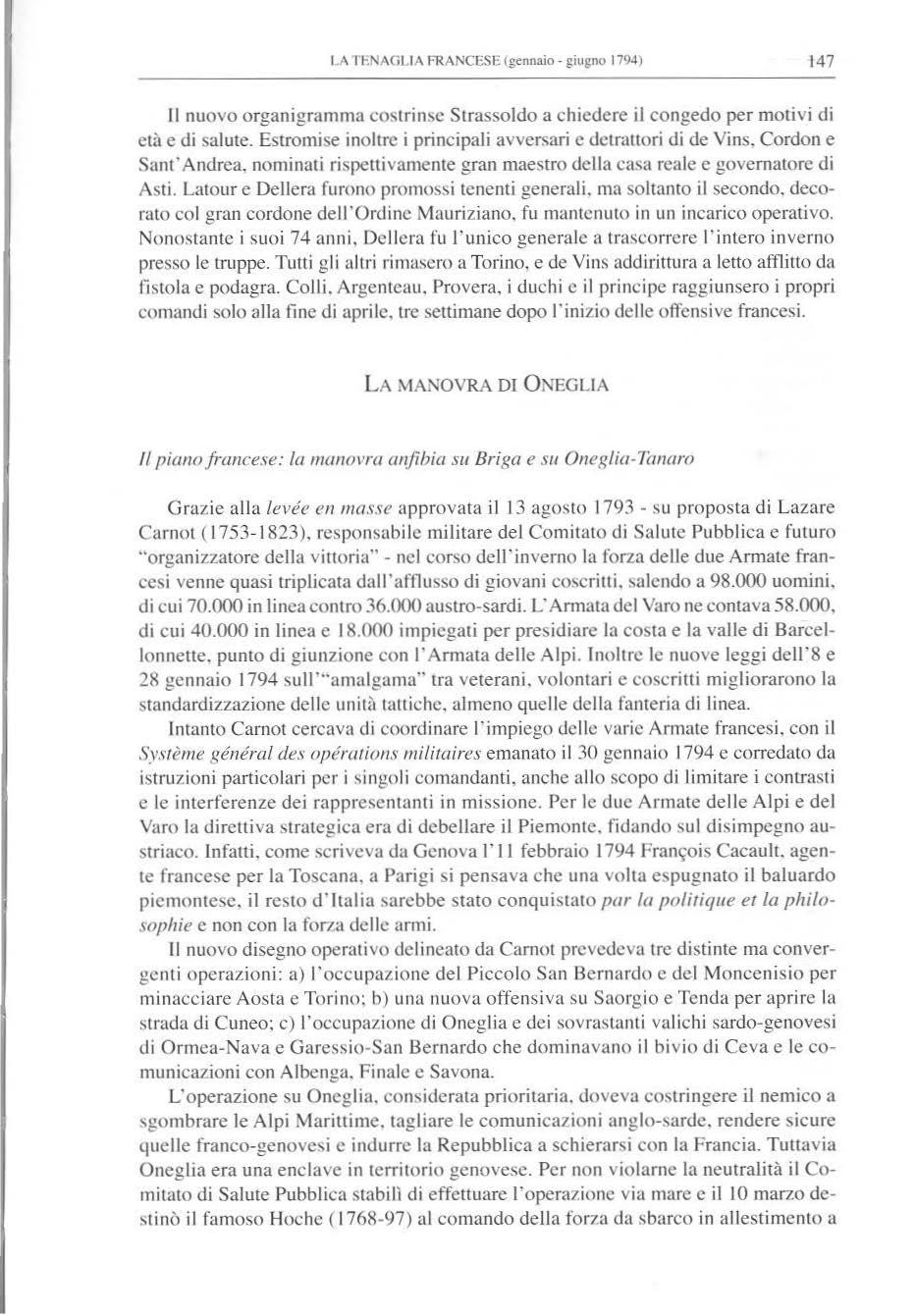 Abbiamo già osservato che la memoria di questa guerra ci è stata tramandata soprattutto attrave rso l'epica napoleonica e la tradizione sabauda. Filtri entrambi deformanti. Come ha ben documentato Paddy Griffith, l 'e pica napoleonica , fortemente condizionata daJI'autopropaganda dello stesso Bonaparte, ha "tiranneggiato", almeno fino a tempi recenti, la storia militare delle guerre della rivoluzione. Non soltanto perchè ha sacrificato questo periodo. riducendolo ad una sorta di prodromo dell' "over-tyrannical. and tyrannical over studied, continuation phase in rhe 1800s", ma anche perchè l'ha intenzionalmente deformata, tacendo, rninimizzando e distorcendo tutti gl i eventi e le figure che potessero offuscare o almeno ridimensionare il ruolo e i meriti del futuro Primo Console e futuro Imperatore, specialmente riguardo all'assedio di Tolone e alle campagne alpine. La stor ia delle campagne del 1793-9 5 è stata così tendenziosamente declassata a noiosa cronaca di inutili spaliate frontali sferrate da ge nerali ingiustamente considerati incompetenti, fino all'arrivo risolutore del genio della guerra. In particolare, come ha sottolineato Griffith, è stato del tutto sottovalutato il ruolo asso lu tamente determ i nante dell'"organizzatore della vittoria" Lazare Camot e di grandi condottieri come Kellermann e Schérer.