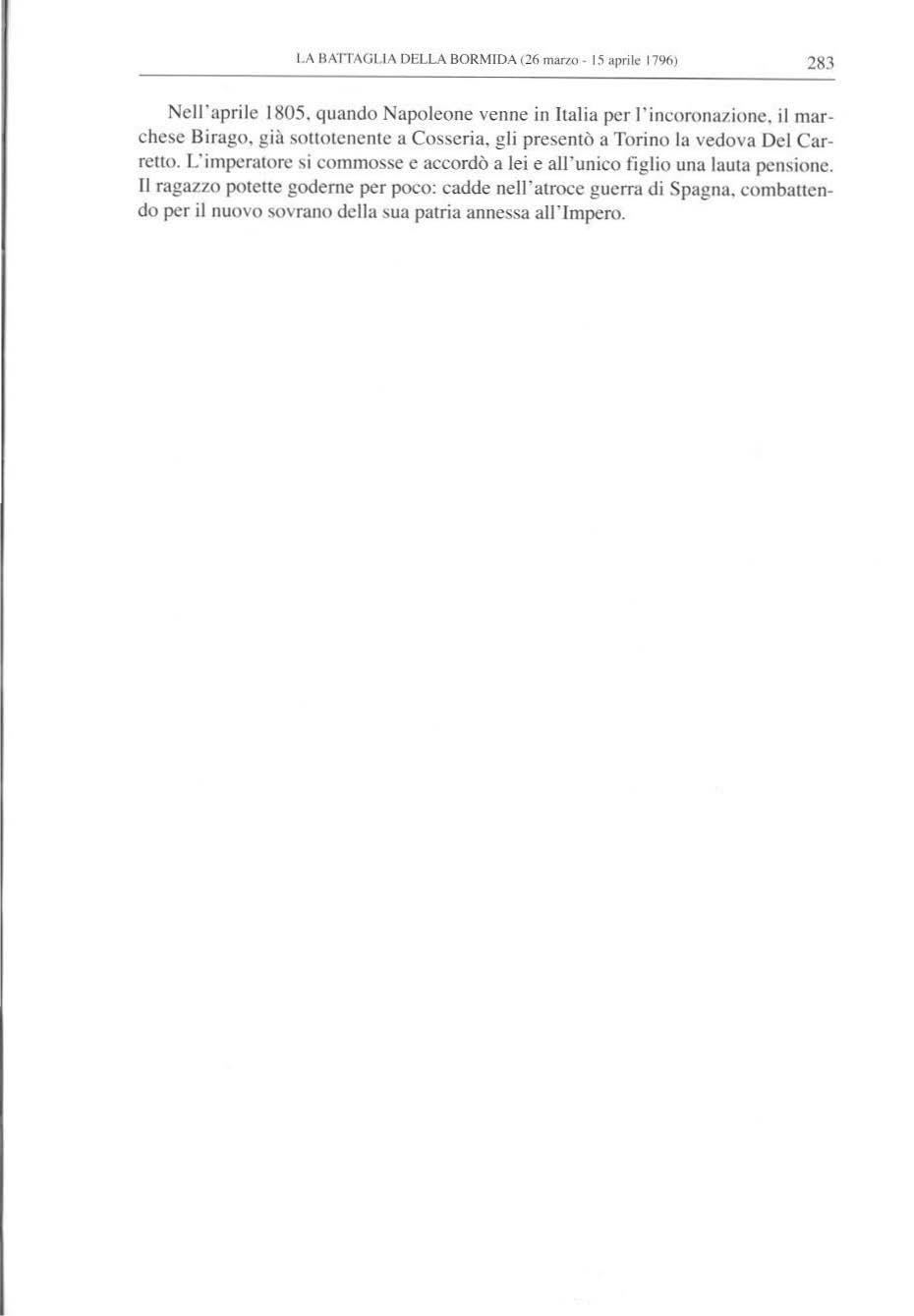 Più sottile è stata la deformazione prodotta dalla tradizione militare nazionale. O gg i le uni che memorie ufficiali di quella guerra sono l'omaggio della Marina alla figura del nocchiero Domeni co Mill e! ire che scacciò Bonaparte dalla Maddal e na . il quadro vivente che ri co rda la mo rte di Del Carretto a Cosseria nel carosello s torico dei Granatieri di Sardegna. le due medaglie d'oro appuntate sullo stendardo del Genova CavaJleria per la carica del Bri cchetto. Dimenti cate invece le sue oltre duecento medaglie individuali, limitate allora so ltant o a i sottufficia li e alla truppa e co ncesse solo a viventi e con criteri diversi da quelli poi fissati per l'auuale ricompensa al valor militare, istituita nel 1833 da Carlo Alberto.