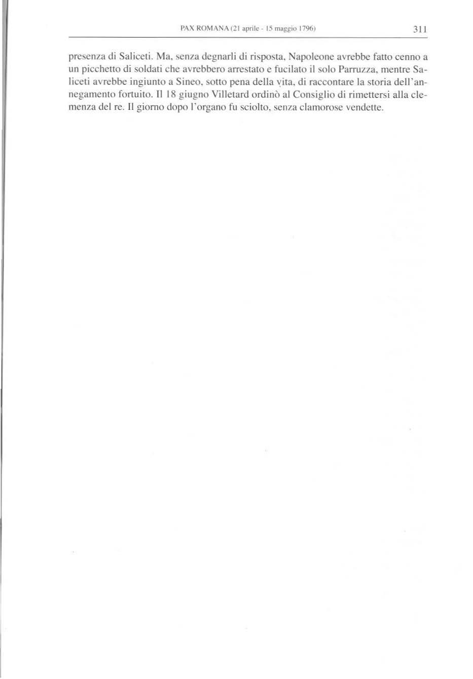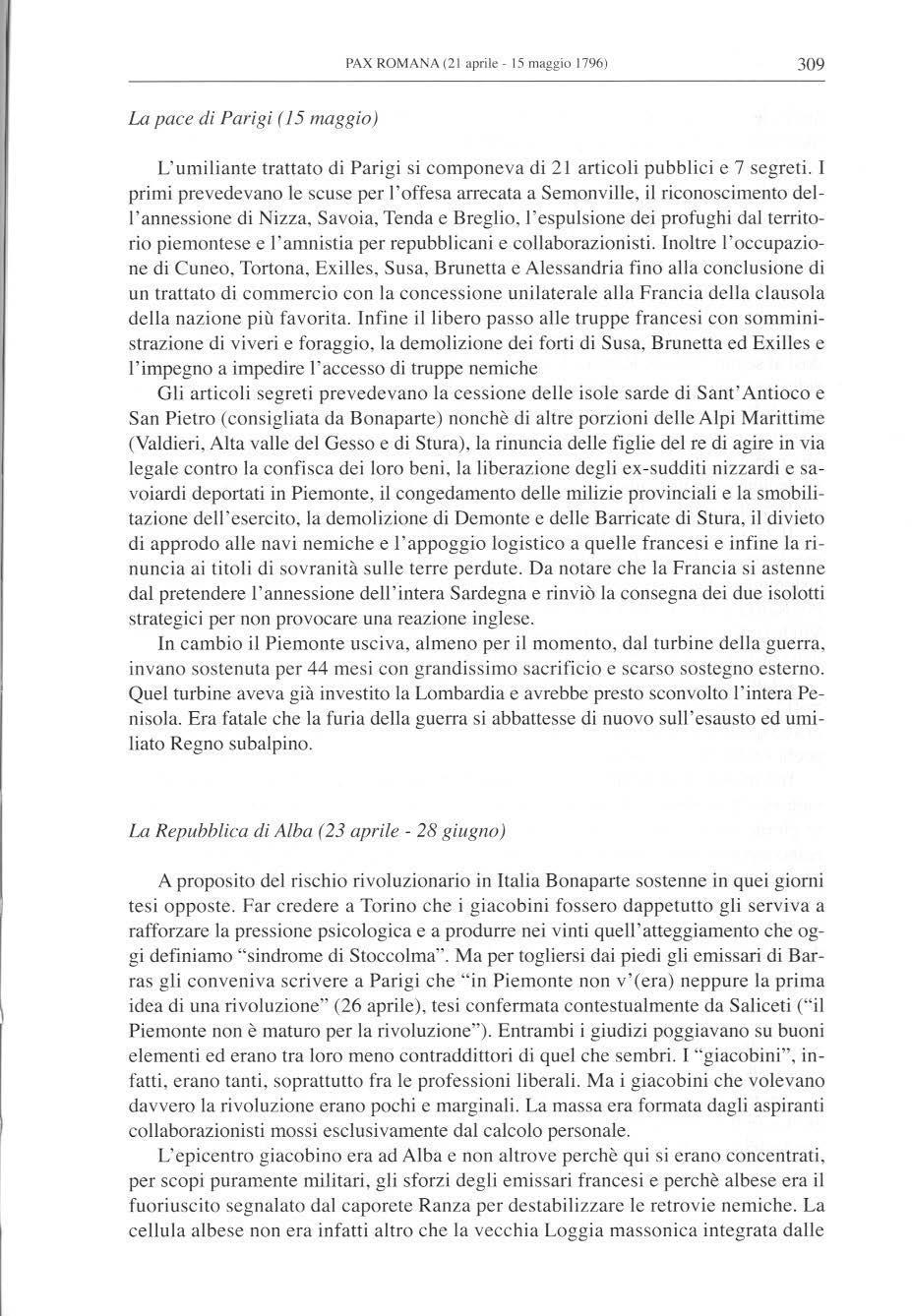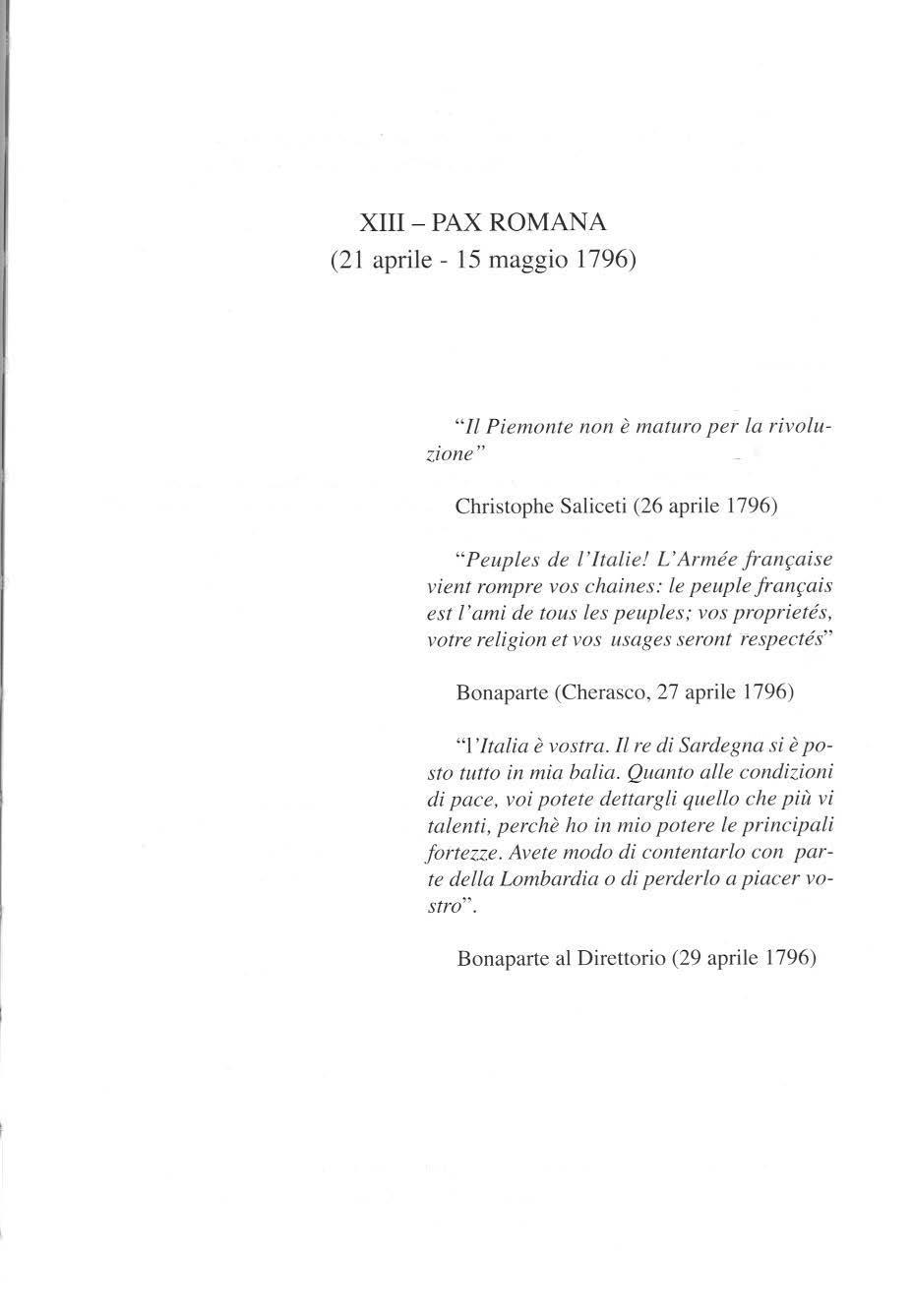 Nelf'ulrimafase della guerra comporre appunTo sulla scena il nuovo astro nascenTe. Napoleone Bonaparre. Proprio da Cherasco, dove fu firmato l'armistizio che concluse i 44 mesi della «Guerra delle Alpi». egli lanciò negli sre:,si giorni il celebre proclwna « Popoli d' lralia.' L'Esercito francese viene a rompere le vostre cmene: il popolo francese è /'(unico di tutti i popoli; le vostre proprietà, la vosrra religione ed i vostri cosrumi saranno rispeTtaTi». Ai suoi so/dari il giol'ane generale aveva però additato come preda le fertili pianure e le ricch e città italiane e nelle istru-:,ioni del 3 febbraio 1797 a Napoleone il DireTtorio souolineò che «la religione romana .\arà sempre la nemica inconciliabile della Repubblica » invitando/o a «distruggere ... il centro di unirà della Chiesa romana ... disTruggere il governo papale».