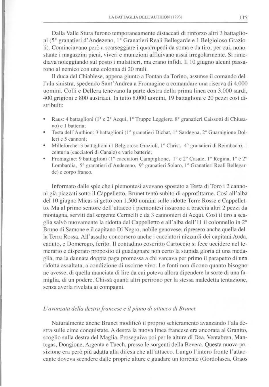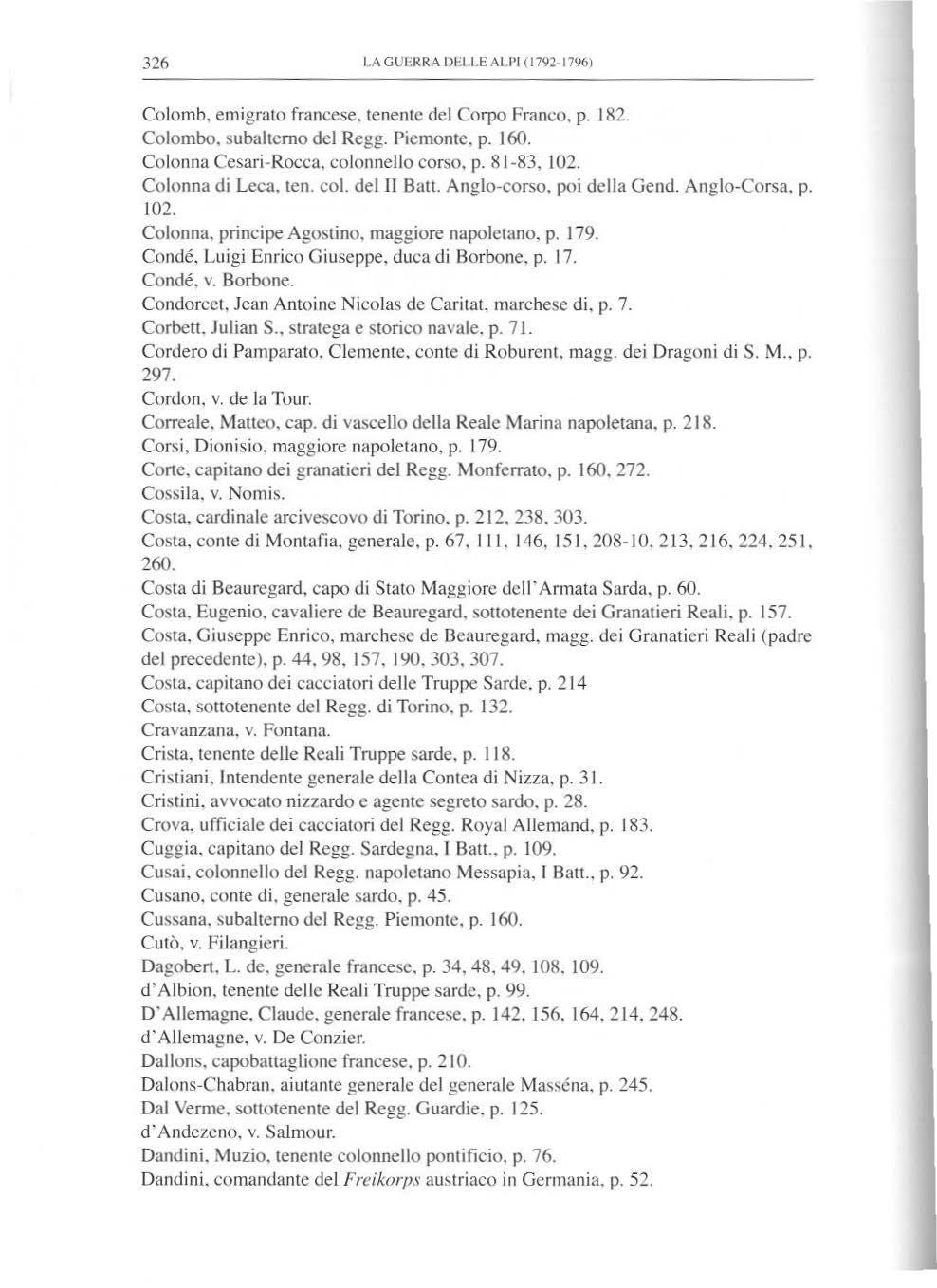 Al di là di queste motiva::.ioni di carattere storiograjico. altre l 'e ne sol/O, minori, fo rse, ma per l'Esercito pur sempre imporwnri e. di per sé sole, già sufficienri a giustificare w/Cl simile pubblica-;.ione. Non soltanto perché con quest'opera l'Ufficio Storico si ricollega alla tradiz)one avviata nei primi anni del secolo XX, con fiumerosi lavori sui fatti d'arme del 1792-1815 e dunque riprende un cammino mai del rutto interrotto. Ma anche perché nelle campagne del 1792-96 comballerono molti Reg gimenti e Corpi perpetuati da unità attive dell'attuale Esercito Italiano , come i Granatieri di Sardegna, Genova Cavalleria e le Armi d'Artiglieria e del Genio. senza contare il Corpo della Regia Marina e la Legione Truppe Leggere, antenate della Marina Militare e della Guardia di Fi11an:a.