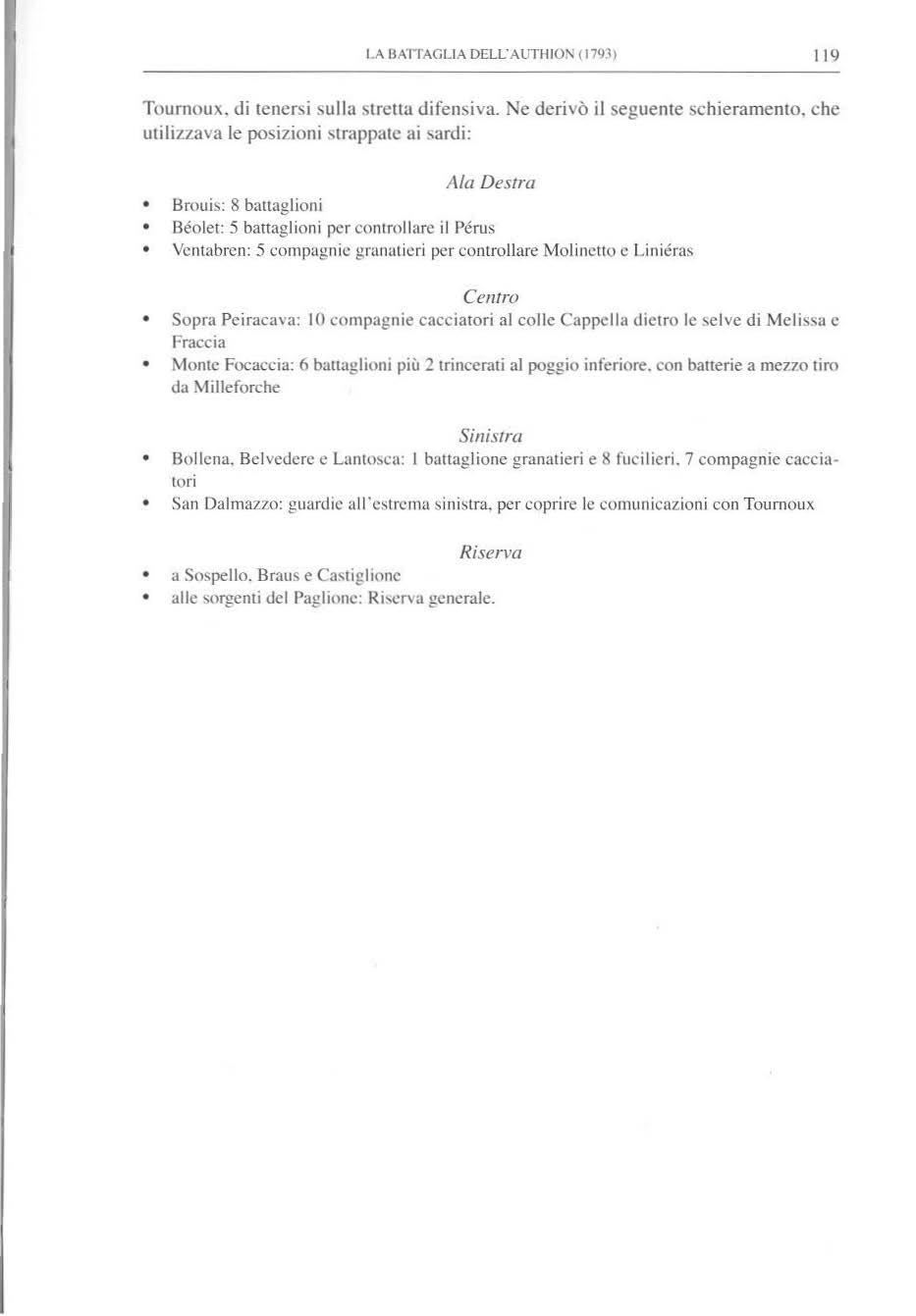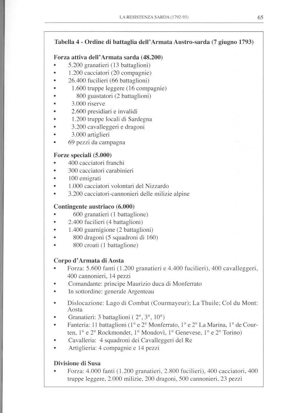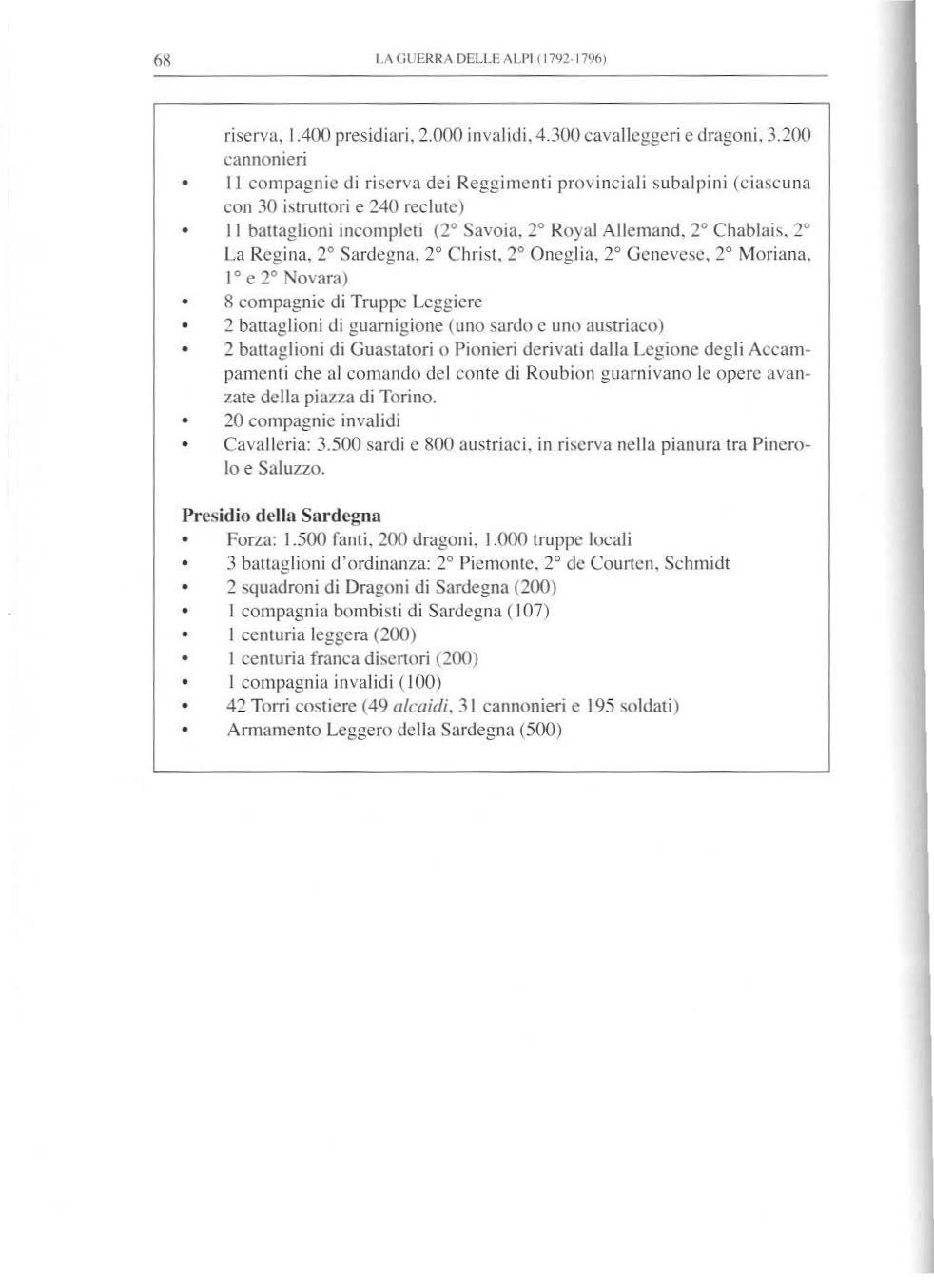 In confronto alle improvv isa te forze francesi. quelle sarde non erano trascurabili. el 1 izzardo erano <,tan;iati circa 9.000 uomini (7.900 fanti. 600 cavalli e 600 cannonieri) con 100 pezzi da forteaa e 8 da campagna. Altri 12.000 difendevano la Savoia (10.329 fanti, 1.200 cavalieri e 16 pezzi da campagna). 11 Corpo del Nizzardo era costituito da: