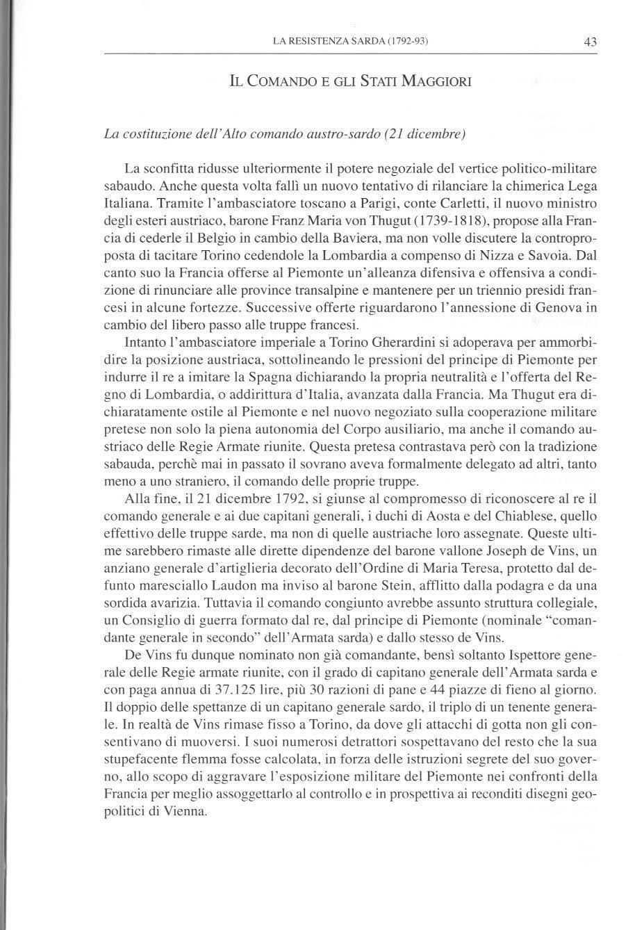 Il Regno di Sardegna era il baluardo che sbarrava la strada all'invasionefran cese della penisola. Il comporwmenro delle altre poren::.e. in primo luogo delf'Ausrria, legato agli schemi della diploma:;ia tradi -;,io nale. rive/à una consapevole:;::.a non adeguata alla posra in gioco, traducendosi in un sostegno /imi raro al Piemonte. al quale il caraTTere ideologico dello sconTro con la Francia impedi\'(1 di accordarsi con Parigi. Gli Autori ricostruiscono con grande obiettiviTà le vicende delle varie campagne militari. sen:;a souacere gli errori o risparmiare le criciche. ma giusTamente ril·endicando le glorie di quell'Armata Sarda che. resistendo più di tre anni e me::.::.o, acquistò nuovi riroli per co.\TÌTuire. più di me::::o :,eco/o dopo, il nerbo del nuo1'0 Esercito Italiano.
