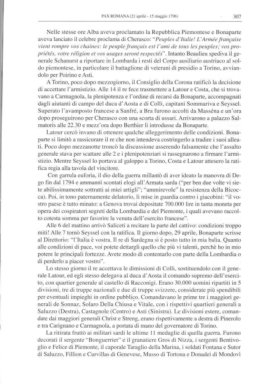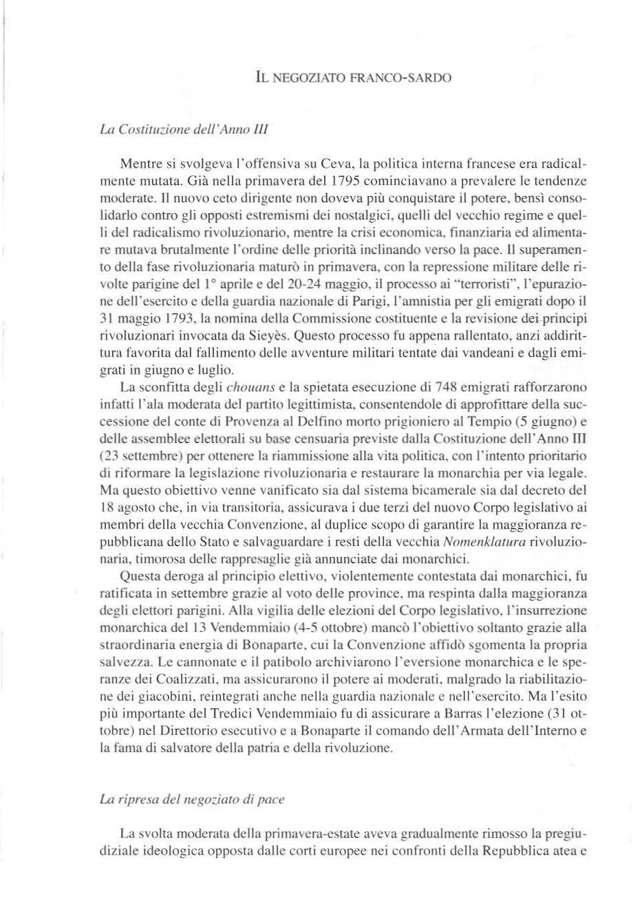 La guerra d ichiarata dalla R epubblica francese a l R egno di Sardegna il 21 settembre 1792 e for malment e conc lu sa co n l ' armi stiz io di C herasco del 28 ap ril e 1796 s eguito da ll a pace dettata a Pa ri g i il s ucces s ivo 15 ma gg io, fu , nel co ntes to della storia e uropea c mondiale, soltanto uno dei conflitti pa11icolari in cui si a rti co lò la g uerra scatenata dalla Prima CoaliLione antifrancese. Fu però anche la prova suprema e decisiva per le del Piemonte e dell'intera Penisola. Essa seg n ò infatti non soltanto la pur onorevole sconfina militare. ma anche la catas trofe sociale del più forte Stato italiano di antico regime, l 'unico ancora in grado di battersi, nonchè il definitivo fa llim e nt o degli s forzi compiuti dopo la pa ce di Aquisgrana per ne utralizzare l ' Italia ri spetto alle g randi guerre e uro pee .