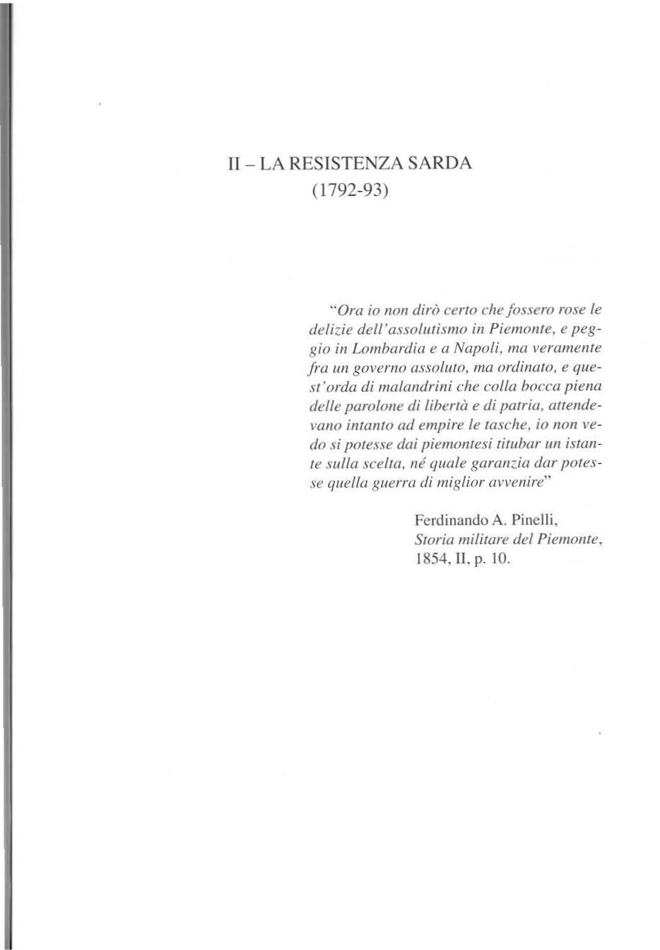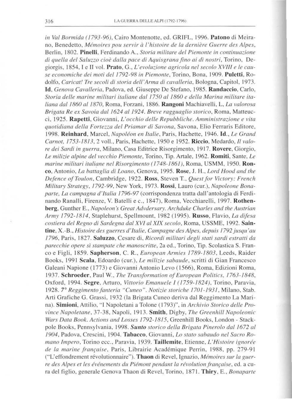 Autonomo rilievo alla guerra del l 792-96 è stato finora pienamente riconosciuto soltanto dal suo primo c migliore s to ric o, il romano Ferdinando Pinelli (18 10-1865). ufficiale dell'Armata Sarda e generale dell 'Esercito italiano, il quale le dedicò il l volume della sua molto citata ma poco letta Storia militare del Piemonte in col/li· nua-:.ione di quella del Salu:;:_o, pubblicata nel 1854, che abbraccia il secolo dalla pace di Aquisgrana alla battaglia di Novara. Storia drammatica, la cui bella prosa ancora trasmette la trattenuta commozione dell'autore, dedicata alle due grandi guerre italiane perdute contro g li opposti nemici di Ponente e Levante, la guerra delle Alpi c la prima guerra di indipendenza. Ma anche sto ri a fortemente ideologica, condizionata da un forte pre gi udi zio antiaustriaco come ha ben sotto lin eato Piero D el Negro.