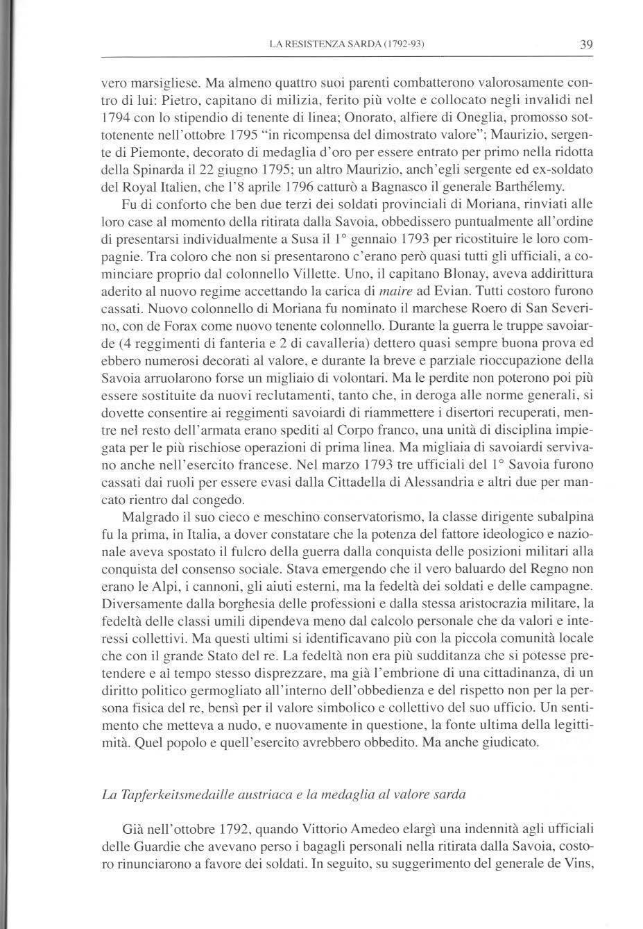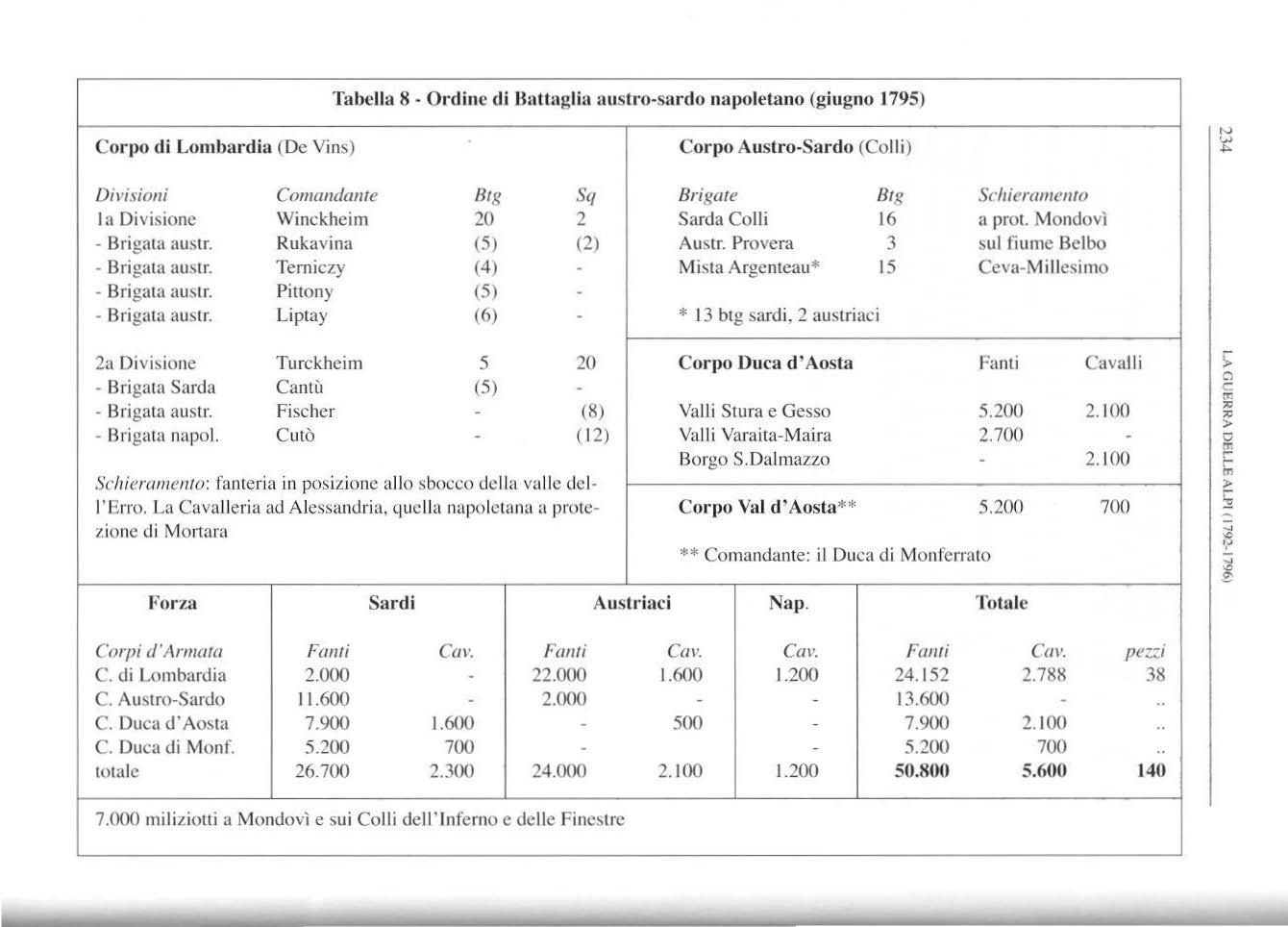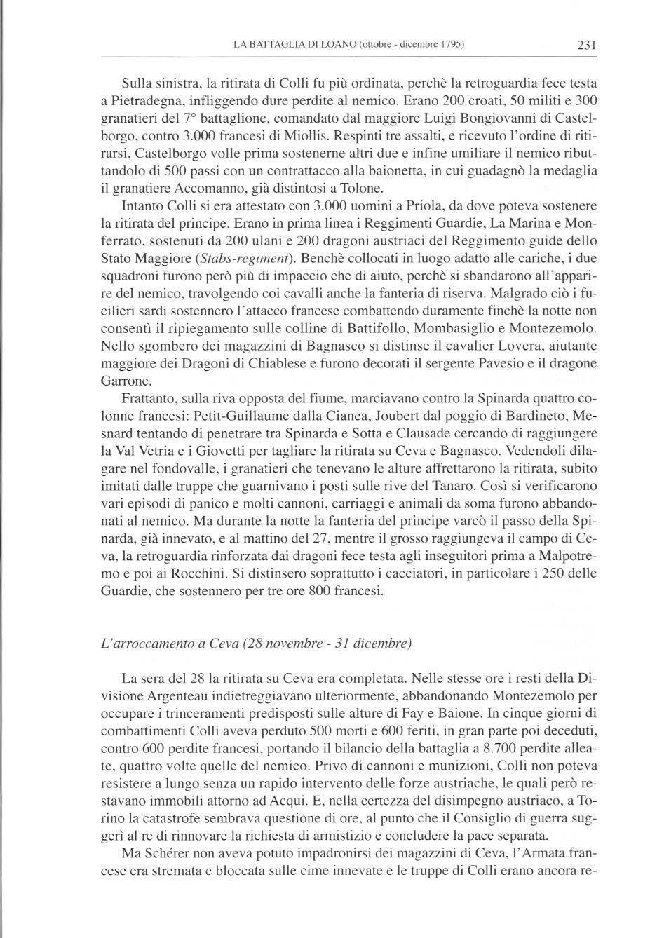 Eppure quella guerra, la prima in c ui venisse in qualche modo registrato e premiato il va.lore dci militari di truppa. fu probabilmente la più gloriosa di tutte quelle combattute da un esercito italiano prima del 1848-49. L'onesto Vittorio Amedeo III non fu certame nte pari ai suo i grandi a ntenati c i s uoi due inetti figli che pretesero di esercitare co mandi operativi. i duchi d'Aosta e del Monferrato. furono responsabili di inutili carneficine e di autentici disastri, dandone poi tutta la colpa al consigliere militare austriaco, ge nerale de V in s, e pregiudicando definitivamente una cooperazione già difficile e precaria per gli obiettivi politici antagonisti perseguiti da Vienna e Torino. Ma la difesa di Cosseria, la ritirata da Ceva a Mondovì fanno onore alla disciplina e al valore dell'Annata sarda , ripctutameme ricon osciuti da ll o stesso Bonaparte.