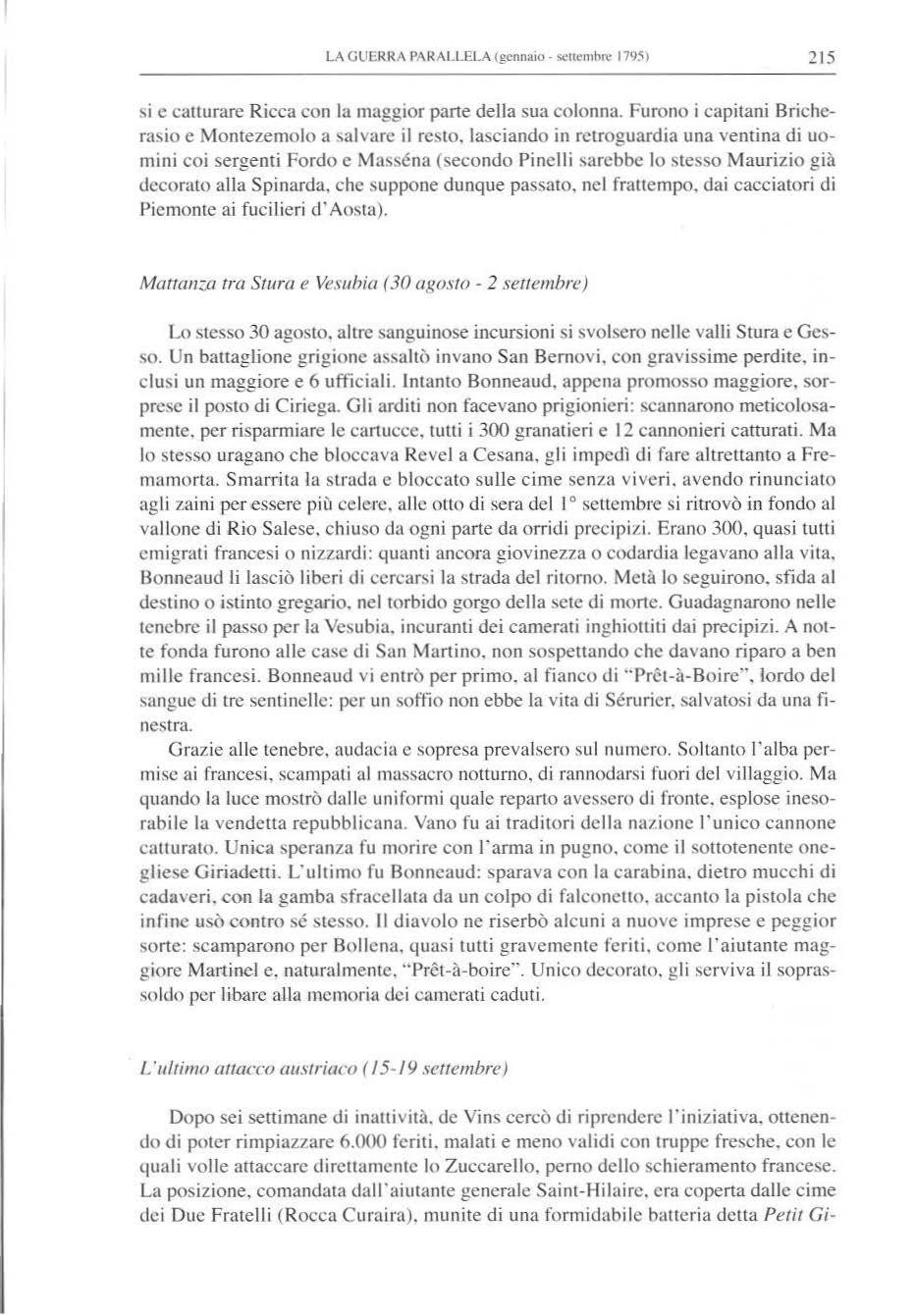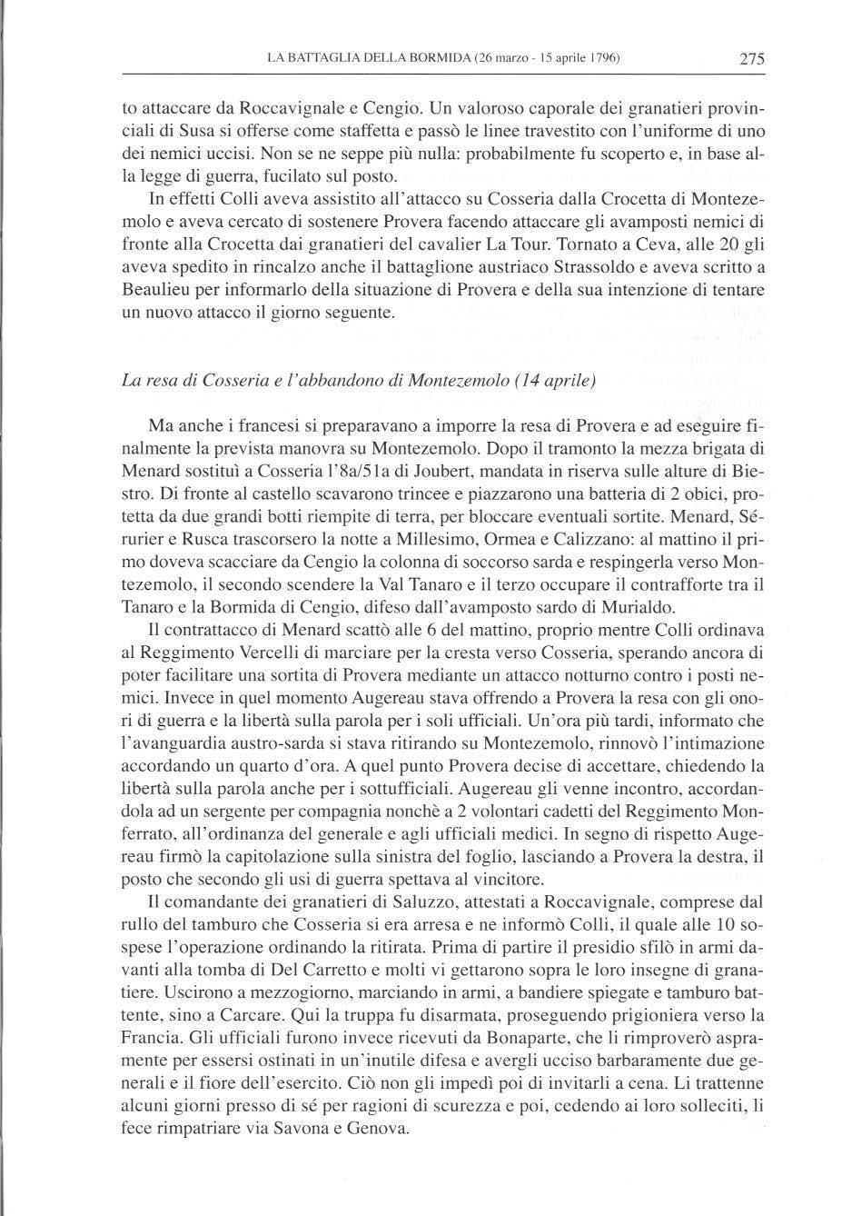 esp rime ancora la reverenza nei confron1 i di Bonaparte -principale responsabile anche di quell'inutile strage- inculcata dalla pedagogia risorgimentale. In ogni modo sta di fatto che le ultime onoranze ufficiali alla memoria di quella guerra furono deliberate durante le effimere stag ioni antifrancesi della Triplice e del 1934-40. Fu nel 1897, infatti, che allo stendardo di Genova cavalleria furono riconosciute le 2 medaglie d'oro concesse nel 1796 ai Dra goni savoiardi. E fu nel 1934 che la Sa Di visione di fanteria. trasferita da Gen ova a Imperia. fu intitolata a Cosseria. Ma nel 1848 Carlo Alberto sottolineò la svolta costituzionale adottando il Tricolore rivoluzionario e ricevendo a palazzo Carlo Botta. memoria storica dei repubblicani che durante l a guerra delle Alpi avevano comballuto dalla parte dei francesi . E congedando senza commiato g li u ltimi veterani de ll ' Authion e di Mondovì. Dopo il 1848. i custodi liberali della tradit.ione sabauda si trovarono, come poi avvenne nei confronti della guerra 1940-43. di fronte a un serio dilemma. Giudicata con i criteri dell'ideologia risorgimentale, filonapoleonica o democratica. ma comunque francofila e germanofoba anche la guerra delle Alpi, come quella del1940-43, fu infatti combattuta "dalla parte sbagliata". Bisognò pure. allora. sconfiggere il Piemonte per cacciare i tetlcschi dall' I ta li a e impiantarvi l'albero de ll a Libertà e l ' idea de ll ' unità naziona le c di nuovi rapporti socia li c polit ici.
