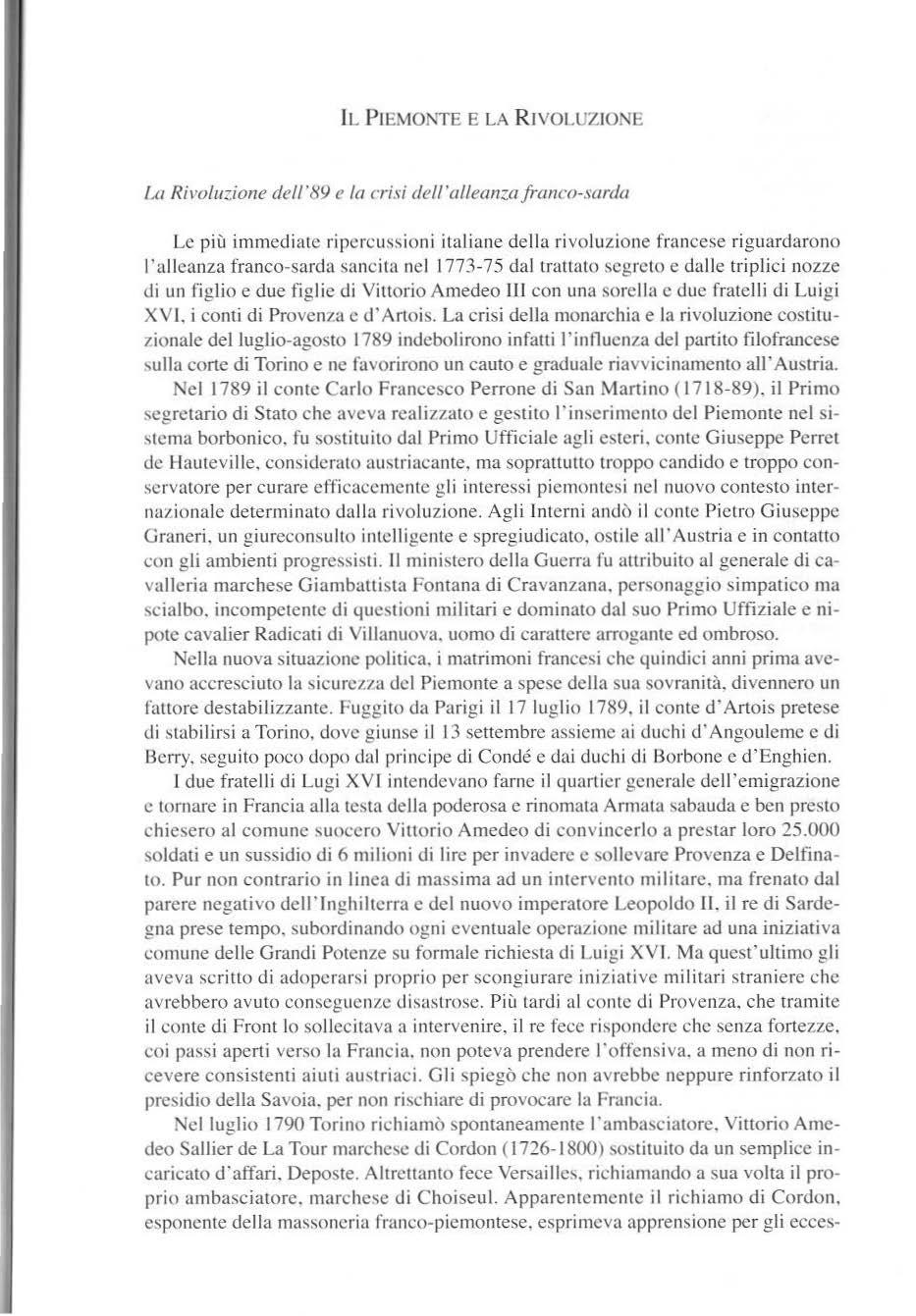 Le più imm ed ia te ripercussioni italia ne della rivoluzione f ra ncese ri g uardarono l 'alleanza franco-sa rd a sancita nel 1773 -75 daltrauato seg reto e dalle tripli c i nozze di un figlio e due figlie di Vi tt orio Amedeo III con una sore ll a c due fratelli di Luigi XVL i conti di Provenza c d'Artois. La crisi della monarchia e la rivo lu zione cosritu' ionale del luglio-agosto 1789 indebolirono infatti l' innuerva del partito filo francese '>UIIa eone di Torino e ne favorirono un cauto e graduale riavvicinamento all'Austria. ' el 1789 il conte Carlo Francesco Perrone di San Martino ( 1718-89) . il Primo seg retario di Stato che aveva reali?Zato e gestito l'in!>crimento del Piemonte nel sistema borbonico, fu sos tituito dal Primo Ufficiale agli C!>teri. conte Giu seppe Pcrrct dc Hauteville. considerato ma soprattutto troppo ca ndido e troppo conservatore per curare efficacemente gli interessi piemon tes i nel nuovo contesto int ernazionale determinato dalla rivoluzio ne. Agli Int erni andò il co nte Pietro Giuseppe Graneri. un giureconsulto intelligente e spreg iu dicato. ostile a li ' Aust ri a e in contatto con gli ambienti progrcssisti. Il ministero della Guerra fu attribuito al generale di cav alleria marchese Giambattista Fontana di Cravanzana. personaggio simpatico ma scialbo. incompetente di questioni militari e dominato dal s uo Primo Uffiziale e nipote cavalier Radicati di Villanuova. uomo di caranere arrogante ed ombroso. Nella nuova situazione politica. i matrimoni francesi che quindici anni prima avevano accresciuto la sicurcua del Piemonte a spese della sua sovranità divennero un fattore destabilizzante. Fuggito da Parigi il 17 luglio 1789, il conte d'Artois pretese di stabilirsi a Torino, dove gi un se li 13 settembre assieme a i duchi d' Ango uleme c di Berry. segu ito poco dopo dal pr in cipe di Condé e dai duchi di Borbone e d'Enghien. l due fratel li di Lu gi XVI intendevano farne il quartier generale dell'emigrazione c tornare in Francia alla tes ta della poderosa c rinomata Armata sabauda c ben presto chiesero al comune suocero Vittorio Amedeo di convincerlo a prestar loro 25.000 so ldati e un sussidio di 6 milioni di lire per invadere c sollevare Provenza e Delfinato. Pur non contrario in linea di massima ad un inter\'ento militare. ma frenato dal parere negativo dell'Tnghiltcrra e del nuovo imperatore Leopoldo IL il re di Sardegna prese tempo. subordinando ogni eventuale opcraL.ionc militare ad una iniziativa comune delle Grandi Potenze su formale richie sta di Luigi XV I. Ma quest'ultimo gli aveva scritto di propr io per scongiurare iniziative militari straniere che avrebbe ro avuto conseguenze disastrose. Più tardi al conte d i Provenza. che tramite il conte di Fro nt lo sollecitava a intervenire. il re fece rispondere che senza fortezze. coi passi aperti verso la Francia. non poteva prendere l 'offensiva . a meno di non ricevere consis tenti aiuti au<;triaci. Gli spiegò che non avrebbe neppure rinforzato il presidio della Savoia. per non rischiare di provocare la Francia.