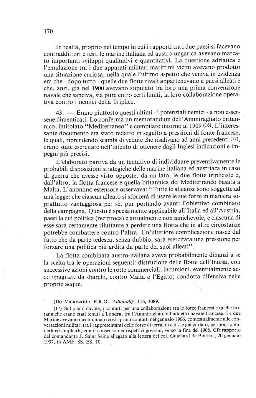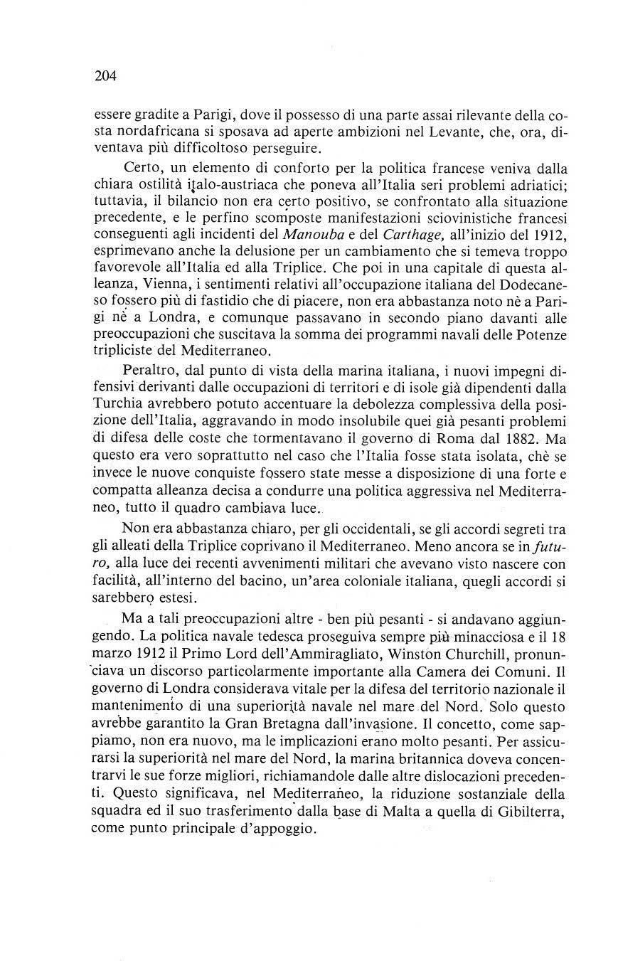 Peraltro, ripetutament e, la Germania aveva suggerito all'Italia la linea buona . Acquisiss e la collaborazione britannica: Londra aveva una flotta nel Mediterraneo, da utilizzare senza importanti impegni difensivi, in funzione della propria politica estera. Ebbene, un compito poss i bile per questa flotta che avrebbe muta t o radica l mente gl i equilibr i navali a favore de l l'Italia era defin i bi le in operazio n i contro la Fra ncia, o a copertura dei litorali della penisola. Tutto questo avrebbe, oltre tutto, fatto comodo anche alla Germa n ia, sul piano politico e su quello militare, perchè in tal modo la Gran Bretagna sarebbe stata in qualche modo legata al carro della Triplice, su cui era evidente l'egemonia di Berlino, e di conseguenza, in un'eventual e conflagraz ione generale, la marina inglese si sarebbe mossa contro la Francia non solo nel Mediterraneo, ma anche nella Man ica e nel mare del Nord, togliendo alla Germania qualche residua preoccupazion e di offe sa n em ica dal mare che, benchè assai marginale, poteva ancora sussistere (36).