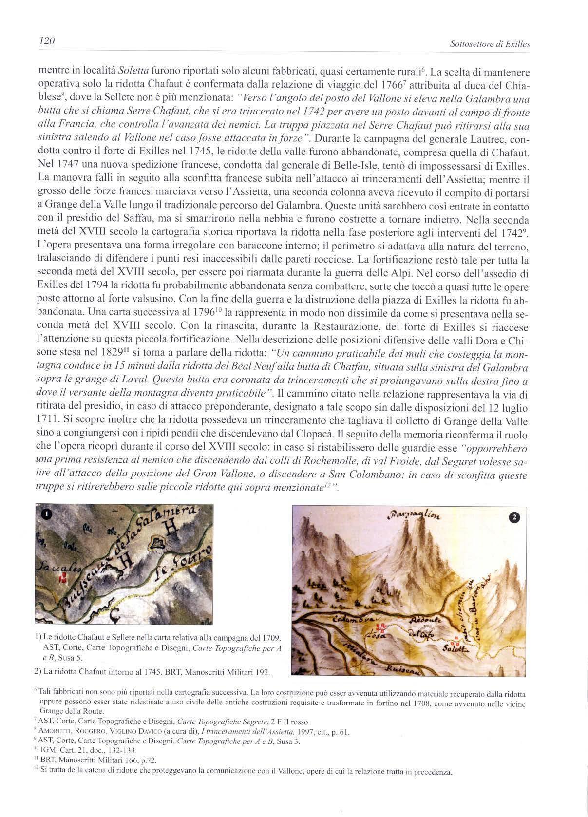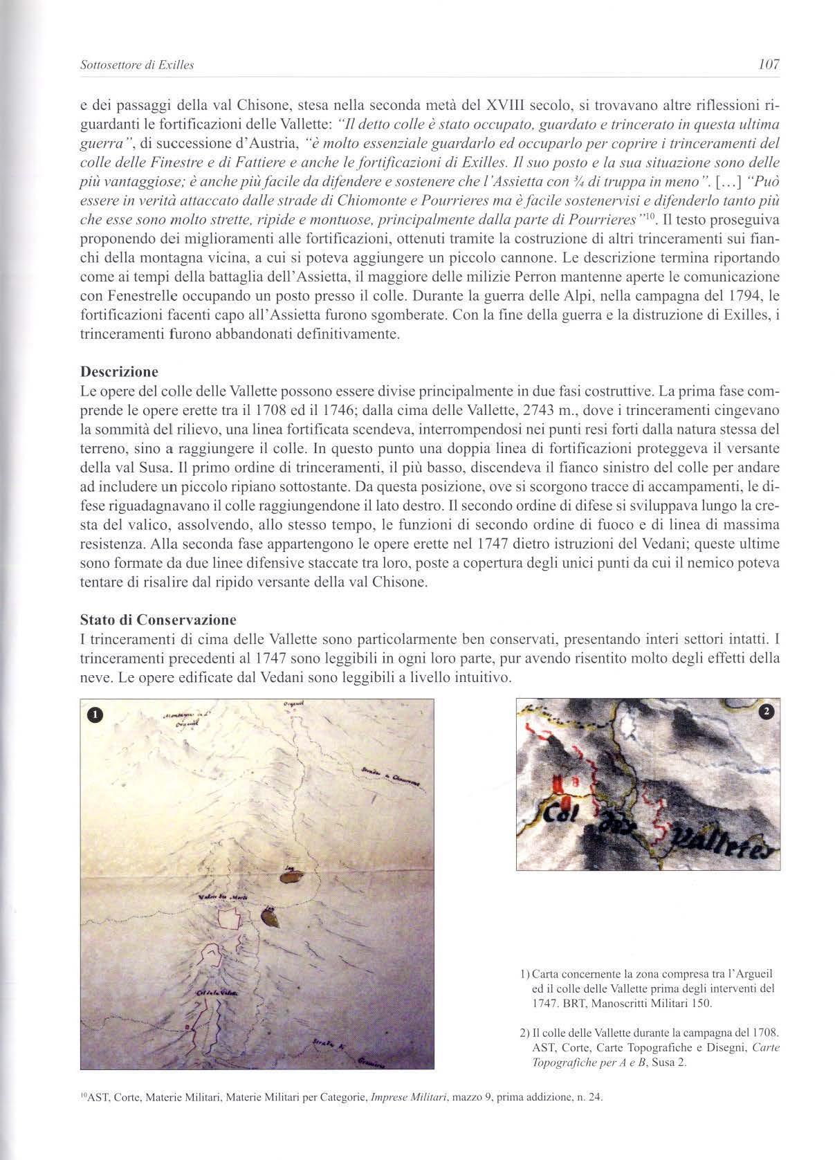 Primo di una collana dedicata ai singoli ambiti così identificati, presentiamo ora il que sto volume la ricerca ultimata per il settore di Exilles, s uddi v isa nei sottosettori di Exilles, Oulx, Bardonecchia e Cesana. Ciasc un s ubambito viene esaminato nella sua globalità, delineandone le vicende storiche che hanno originato o coinvo lto i singoli apparati difensi v i, esaminati quindi in sc hede singo le che, per l'intero setto re , risultano in numero di quarantadue9 •