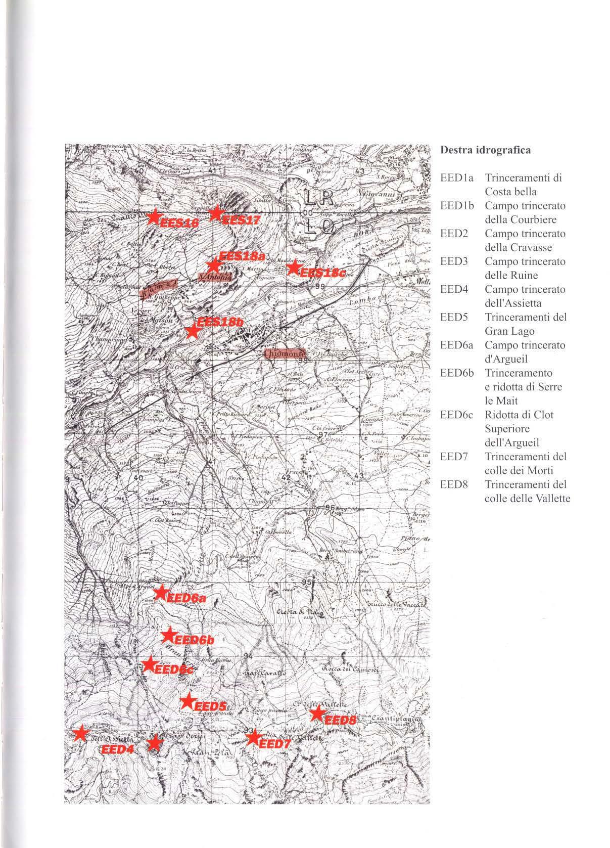 73 EED2 campo trincerato della Cravasse 75 EED3 campo trincerato delle Ruine 78 EED4 campo trincerato dell'Assictta 91 EED5 trinceramenti del Gran Lago 95 EED6 campo trincerato dell 'Argucil 101 EED7 trinceramenti del colle dei Morti 105 EE D8 trinceramenti del colle delle Vallette 11 O EES I ridotta di Malavia 113 EES2 ridotte di La Touche e La Combe 114 EES3 ridotta di Serre la Garde e trinceramenti di Bcssè 119 EES4 ridotte di Chafaut e Sellete 122 EES5 ridotta la Routte e trinceramenti del Galambra 123 EES6 ridotta du Pied 125 EES7 ridotta Beai Neuf 126 EES8 ridotta della Port etta 128 EES9 ridotta Rossa 130 EES 1O ridotta di Serre Rougiè 132 EES 11 ridotta Bclissa 133 EES 12 ridotta del Gran Vallone 144 EES 13 ridotta di colle Traversiero 145 EES 14 ridotta della Bellissa 146 EES 15 ridotta dei Quattro Denti 149 EES 16 ridotta du Piè Sibille 150 EES 17 ridotta della cappella Bianca 152 EES I 8 rid otte della Quiriera, Castagnasso e Maddalena
