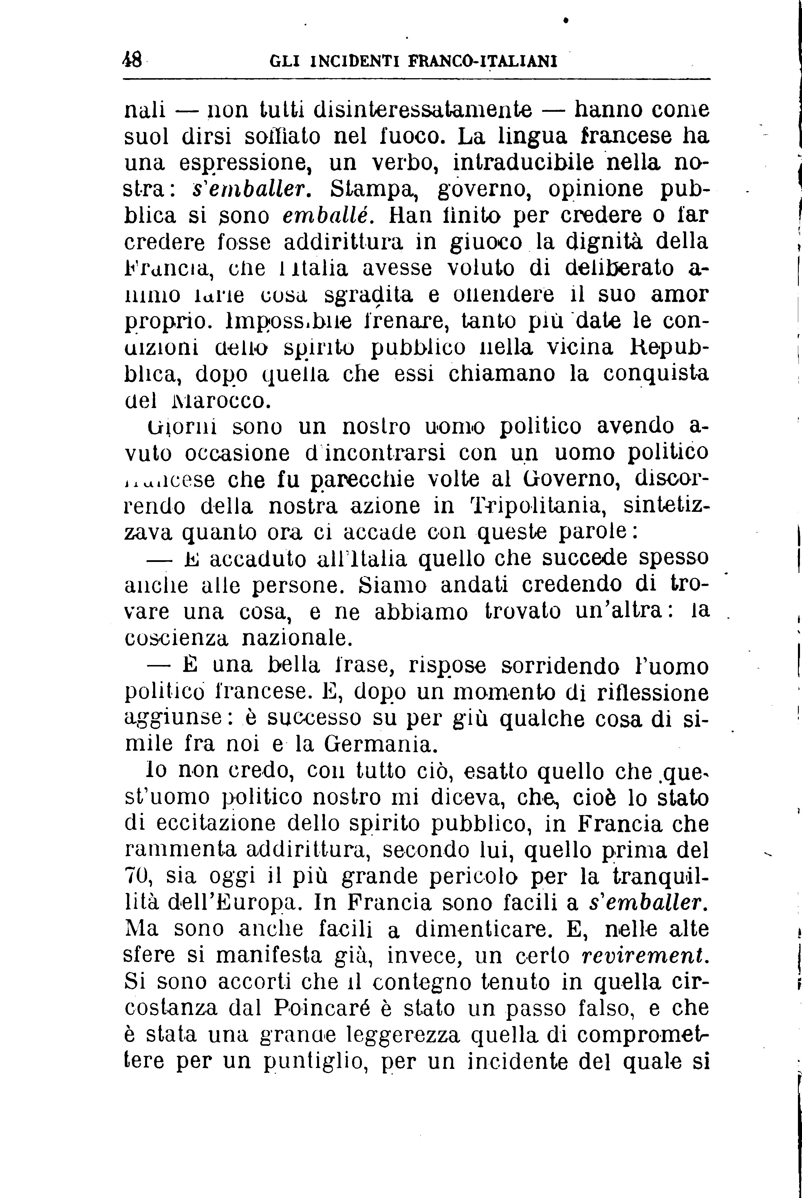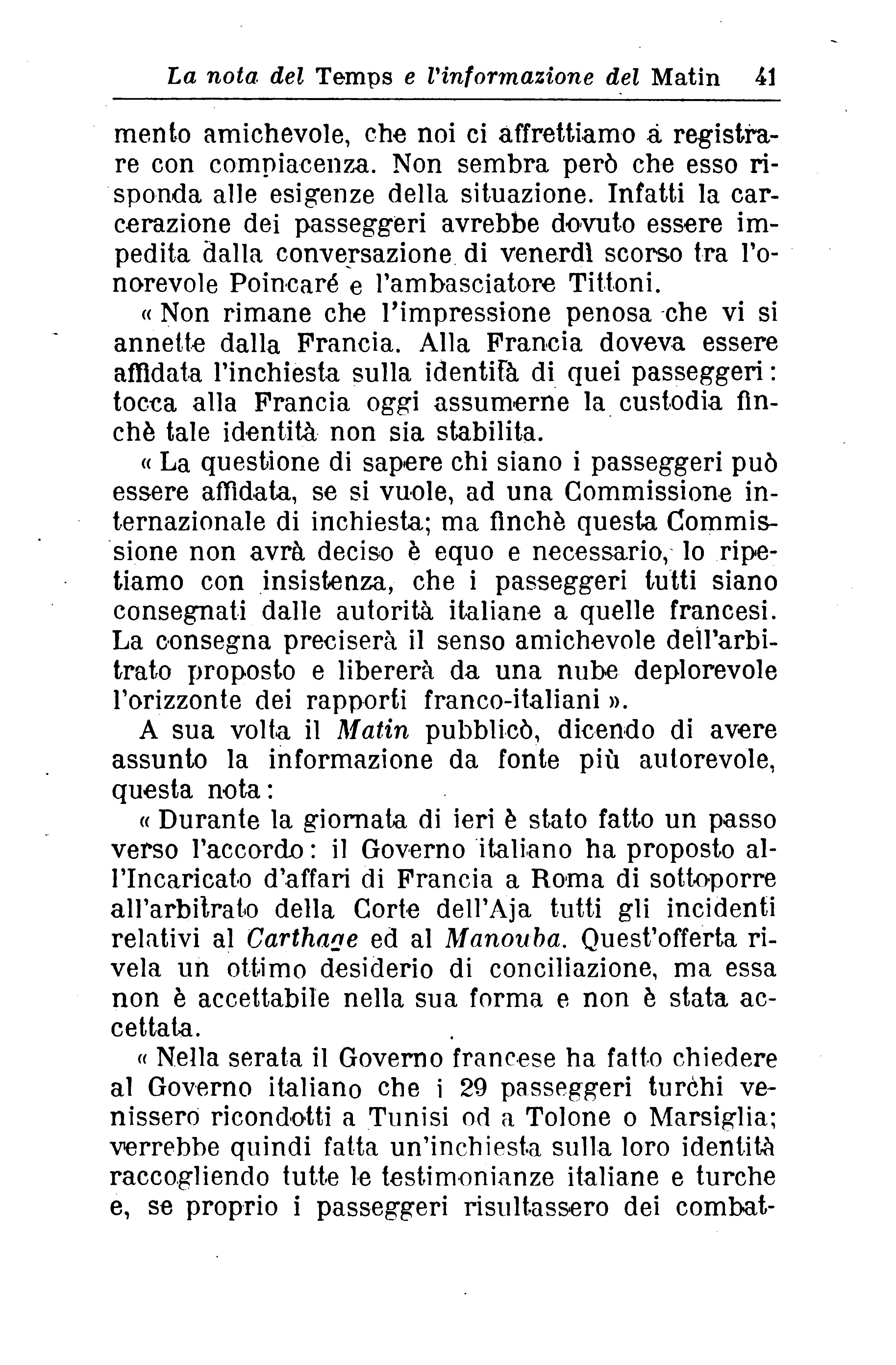 IL SEQUESTRO DEL «CARTHAGE ». L'arresto dei turchi sul Manouba. Come furono fermati il Carthage ed il Manouba Il comu nicato ufficioso italiano e i dubbi sulla qualità dei turchi a bordo. Un milione e cento mila lire. Il discorso di Poincaré. L'impressione prodotta in Italia. Dichiarazioni del nostro am basciatore. Un articolo del Temps. La Francia reclama i prigionieri. L'esame dei prigionieri a Cagliari. Documenti... ben confezionati. La soluzione. Il comunicato del Governo Italiano. Il comunicato del Governo Francese. zioni anti-italiane a Tunisi SITUAZIONE MUTATA. Per gli interessi di qualche armatore. i riserbo della nostra stampa. Le dimostrazioni al corrispondente del Temps. Armi ed aiuti per i nostri nemici. Gli armatori di Marsiglia. Lo spirito pubblico in Francia. Sintomi di resi piscenza. Un'operazione di cateratte. Chi può fidarsi? Le nostre rclazioni con la Francia. Intonazione diversa. La po