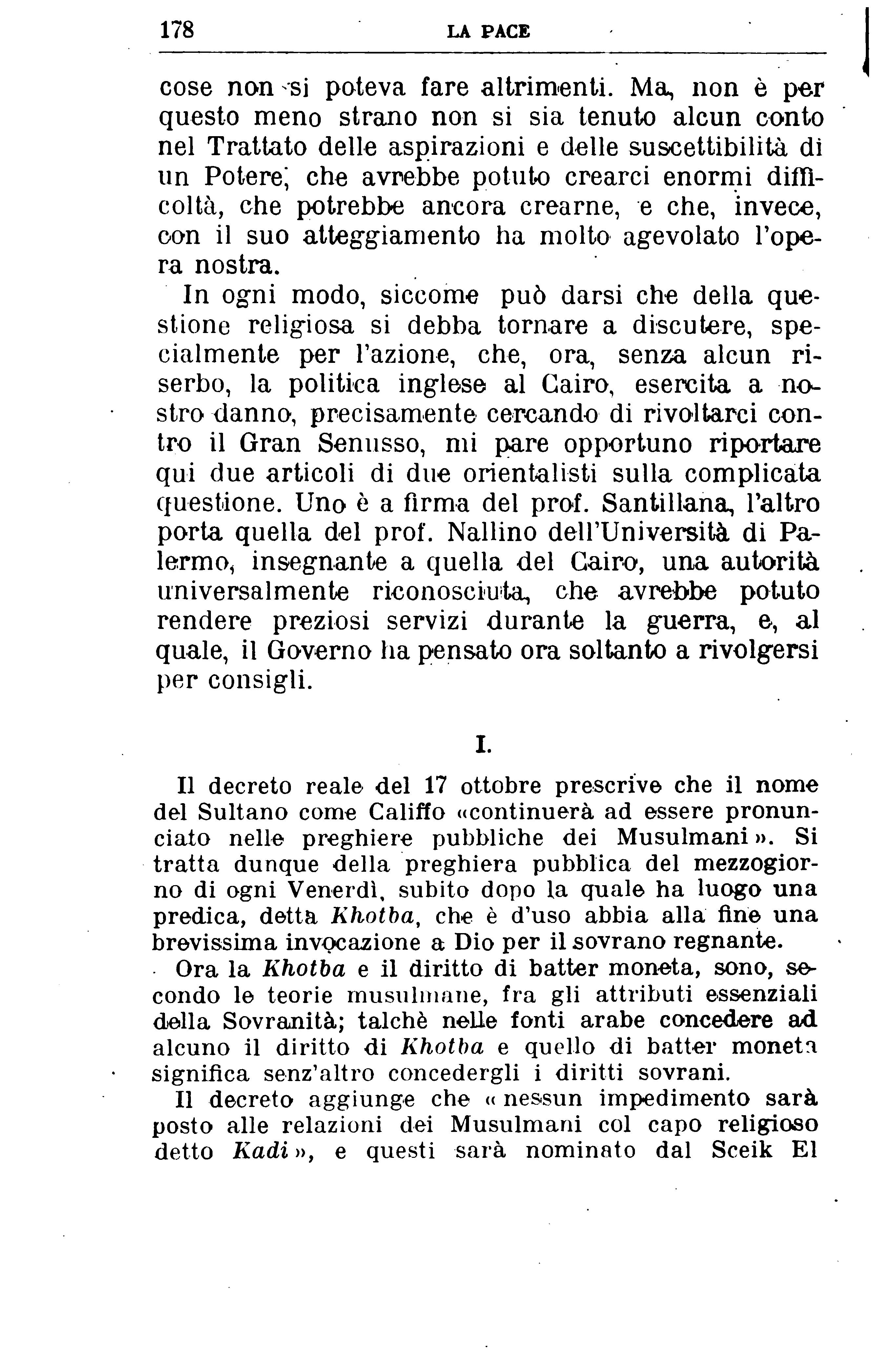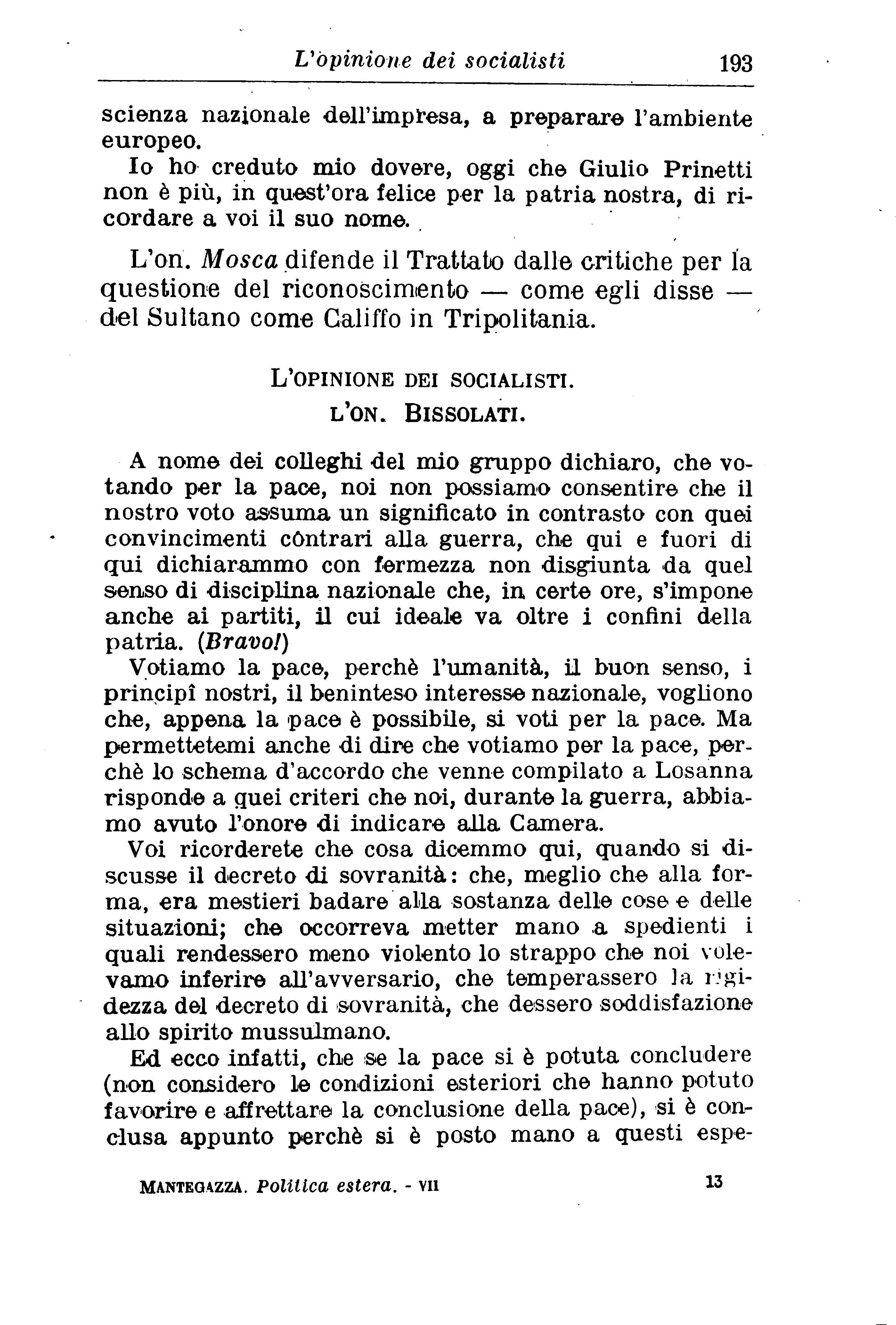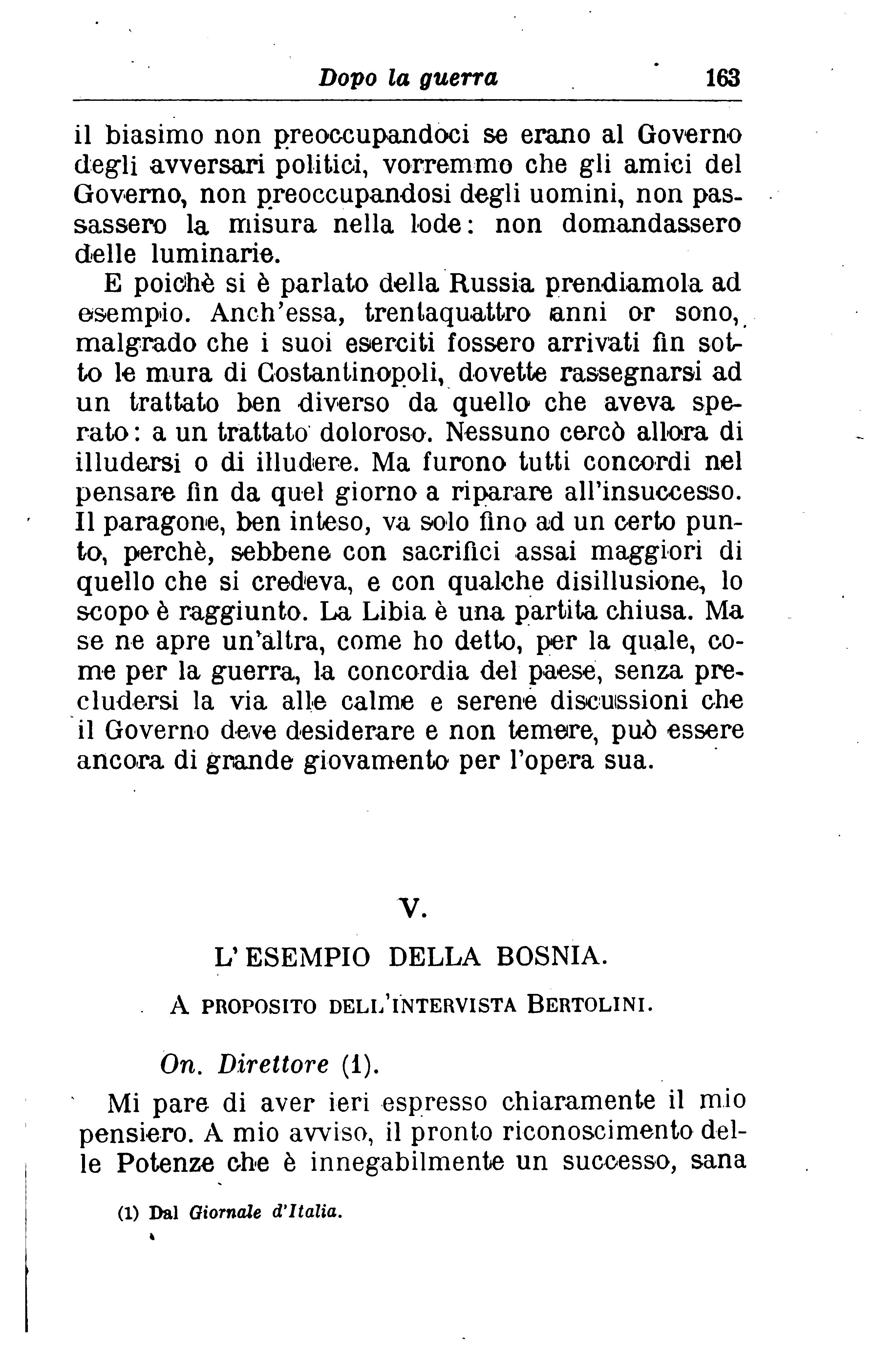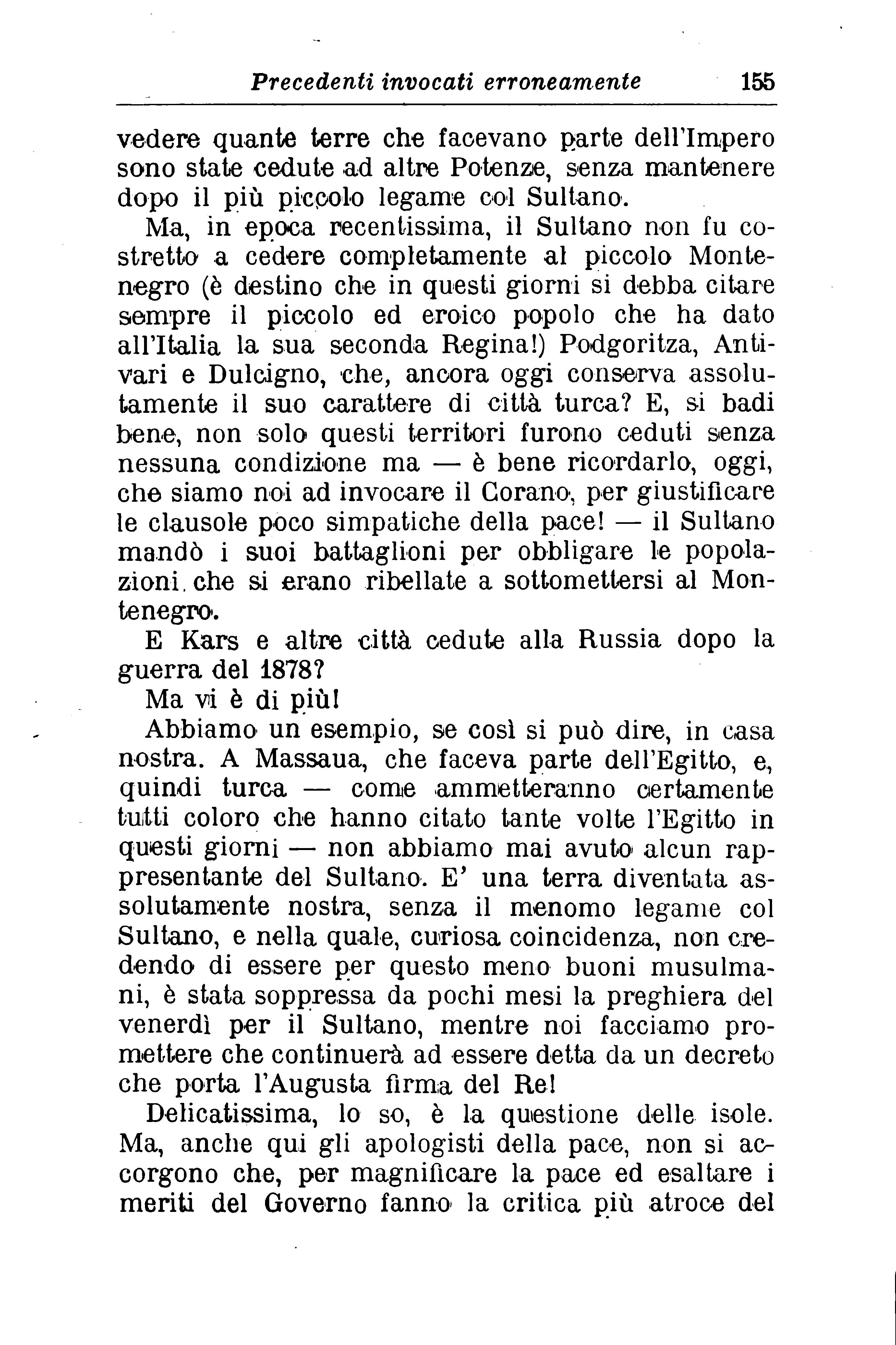 Si scontano gli errori della guerra. Non è pace vergognosa. Pace di adattamento. Il leit-motif delle apologie ufficiose. Ragionamenti troppo semplicisti. L'eccesso nella lode. Gli espulsi dimenticati. Un esempio citato male. Le contraddizioni di quelli che vogliono lodare ad ogni costo. L'esempio di Massaua. Le isole. E Chio? Il giudizio sintetico di un illustre par lamentare. Le vere ragioni che militano in favore della pace. Coincidenza dolorosa. Che si poteva evitare. Una frase poco gentile del Poincaré. Gli errori nella condotta della guerra. Il bilancio della pace. I pronto riconoscimento delle Potenze. La cortesia della Russia. La situazione internazionale. Quanti dei suoi quindici Corpi d'esercito l'Austria può portare alla frontiera? Non luminarie Pag. 152 L'ESEMPIO DELLA BOSNIA. A proposito dell'intervista Bertolini. Paragoni che non si possono fare. Altri territori ottomani ce duti senza alcuna condizione. Ancora la Bosnia. L'articolo dell'accordo Austro-turco che fa risaltare la differenza. L'arti colo di quell'accordo relativo al culto. La preghiera per il Sultano nel Decreto Reale 163 1 IL TRATTATO DI LOSANNA. Cessazione delle ostilità. Scambio Gli L'indipendenza economica della Turchia. di ufficiprigionieri. postali. Le capitolazioni. Al Gl'impiegati italiani. meno 50 milioni. Il Firmano di Maometto V. - Il Decreto di Re Vittorio Emanuele III. L'iradè per le isole dell'Egeo. L'iradè per l'amnistia a S'di Idriss. La Sovranità dell'Italia Potenze riconosciuta dalle 167 IL RAPPRESENTANTE DEL SULTANO. L'opinione di due Orientalisti . 177 VII.
